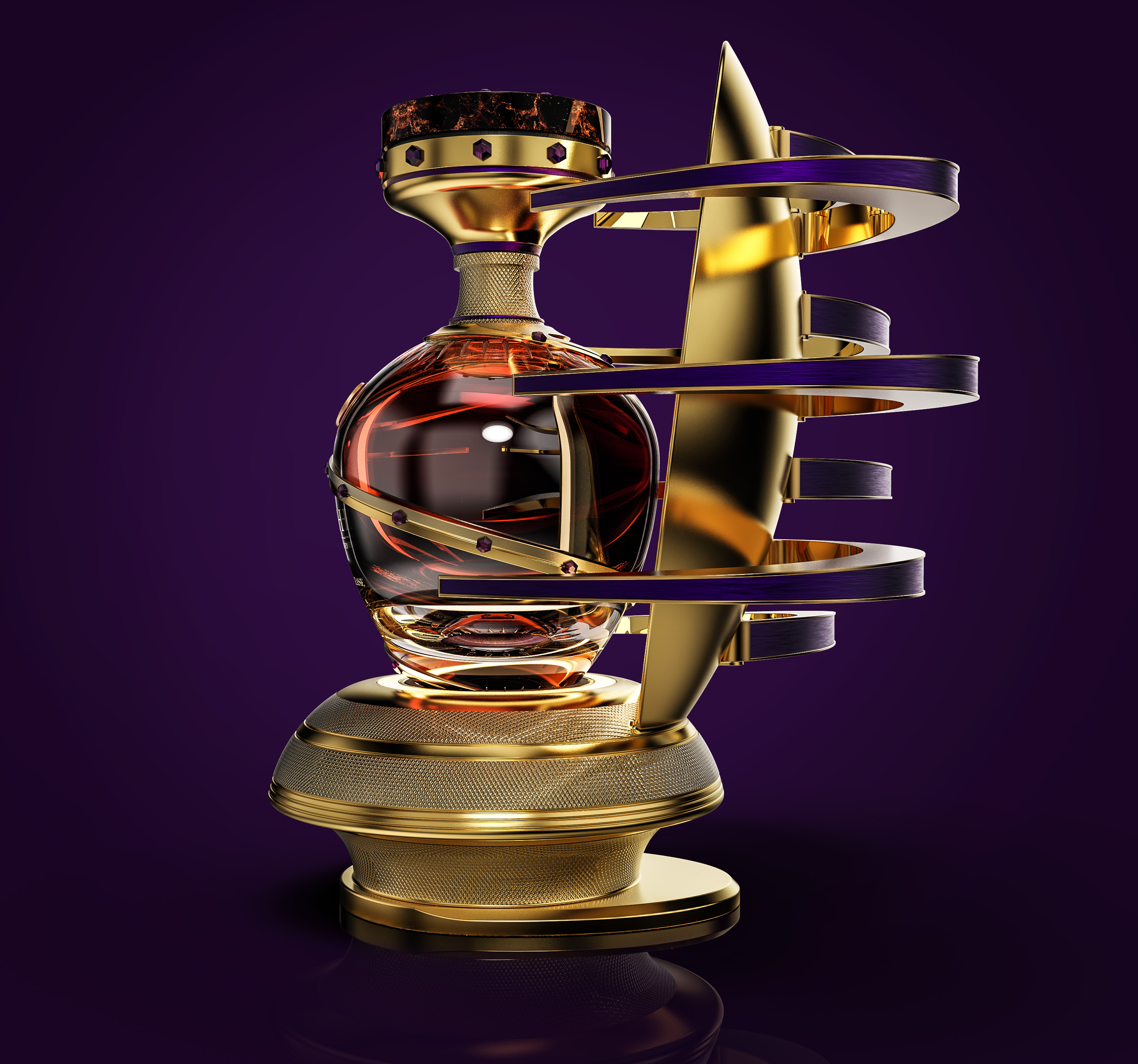 Bottle and Exo-Display share a similar concept: organic shaping with gold/amethyst detailing. Whilst the bottle received a delicate golden band with incrusted amethyst stones, culminating in a pocketed brass and obsidian closure, the display unit has the main structure with grooved and knurled golden details, where the arms receive the amethyst-finished detailing. Mirror and LED in the main frame add further depth and sensorial richness to the entire experience.