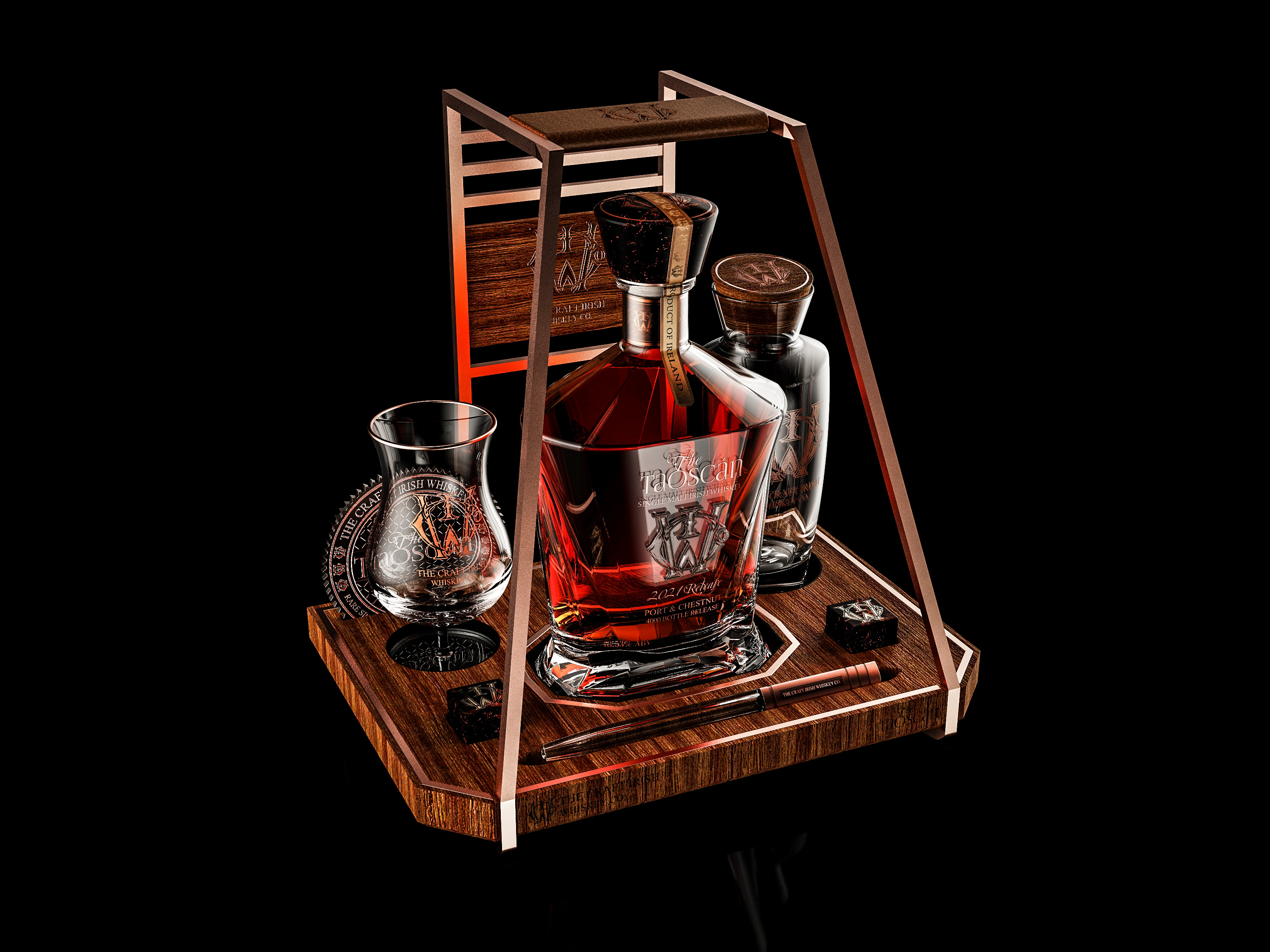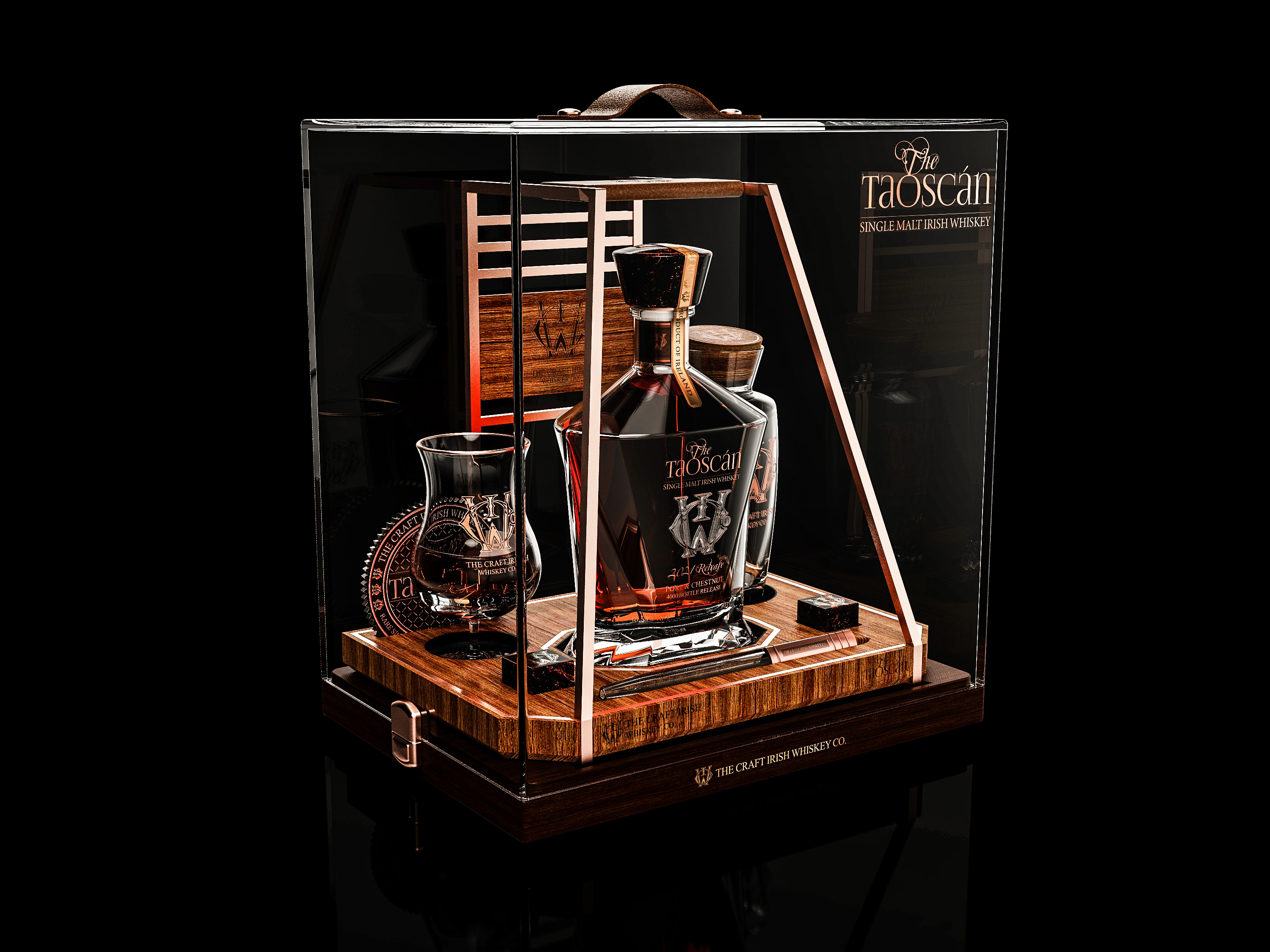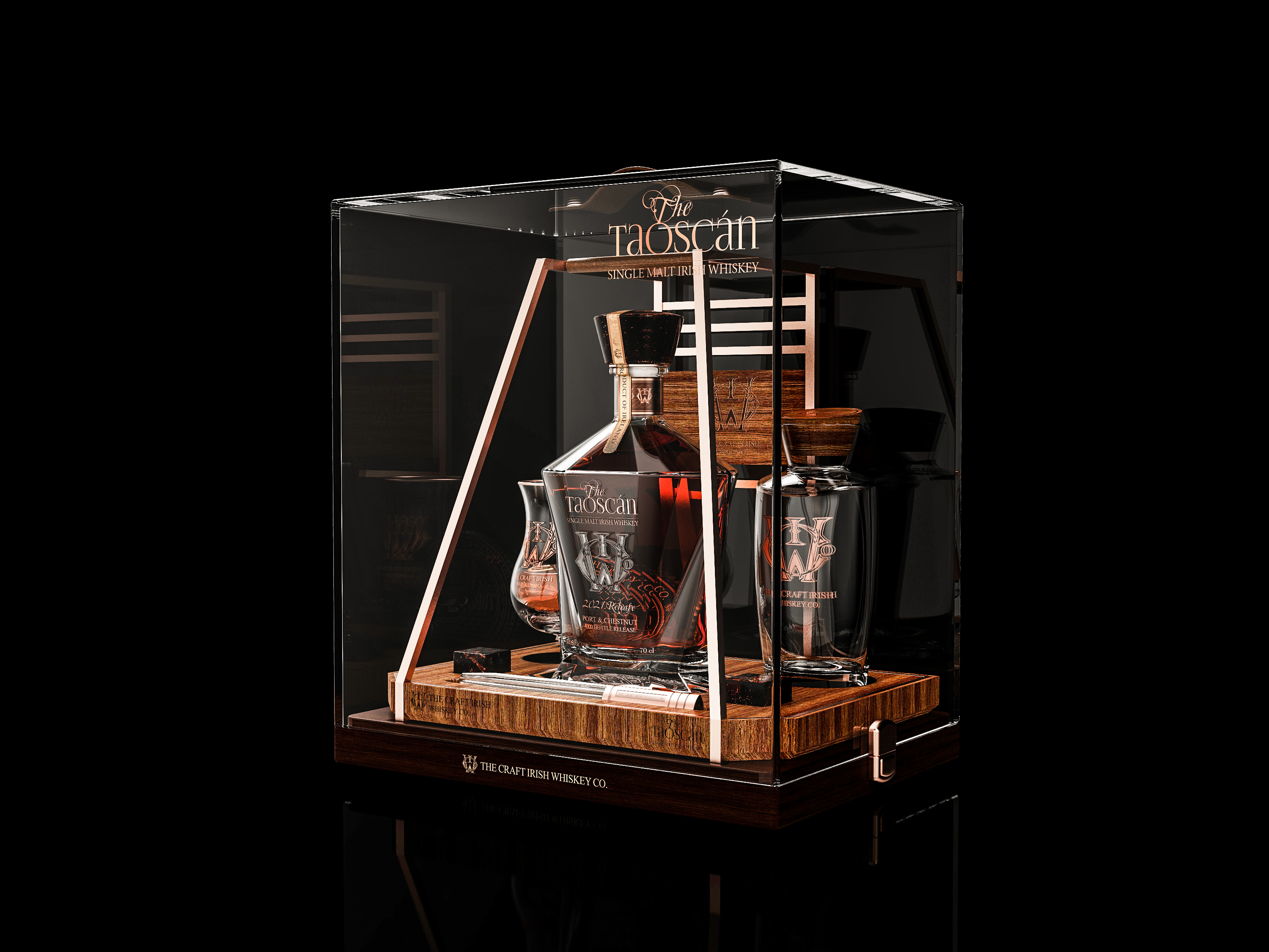 Based on an open tray design, The Taoscán was created to be the centre of attention, a true centrepiece when brought to a table to be served. Visible from any angle, this 360-degree open design allows the bottle and the colours of the whiskey to showcase no matter the angle.