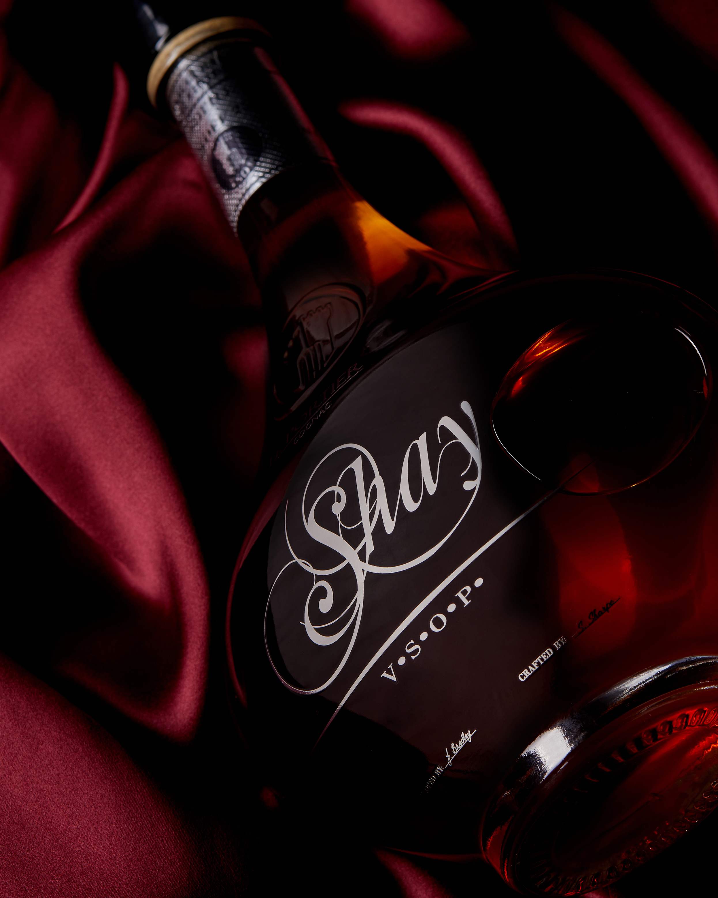 A sense of exclusiveness and luxury is inherent to the Say VSOP range. Minimalist details on the bottle, allowing the shaping of the glass to take the centre stage, maximising the rich shades of the cognac to shine through. Silver metallic detailing contrasts with the rich black obsidian stone in the same way the black box exterior is inverted by a floating off-white suede inside, wrapping the bottle and elevating it as a light backdrop where all the colours burst as light is received inside the opening of the luxurious box.
