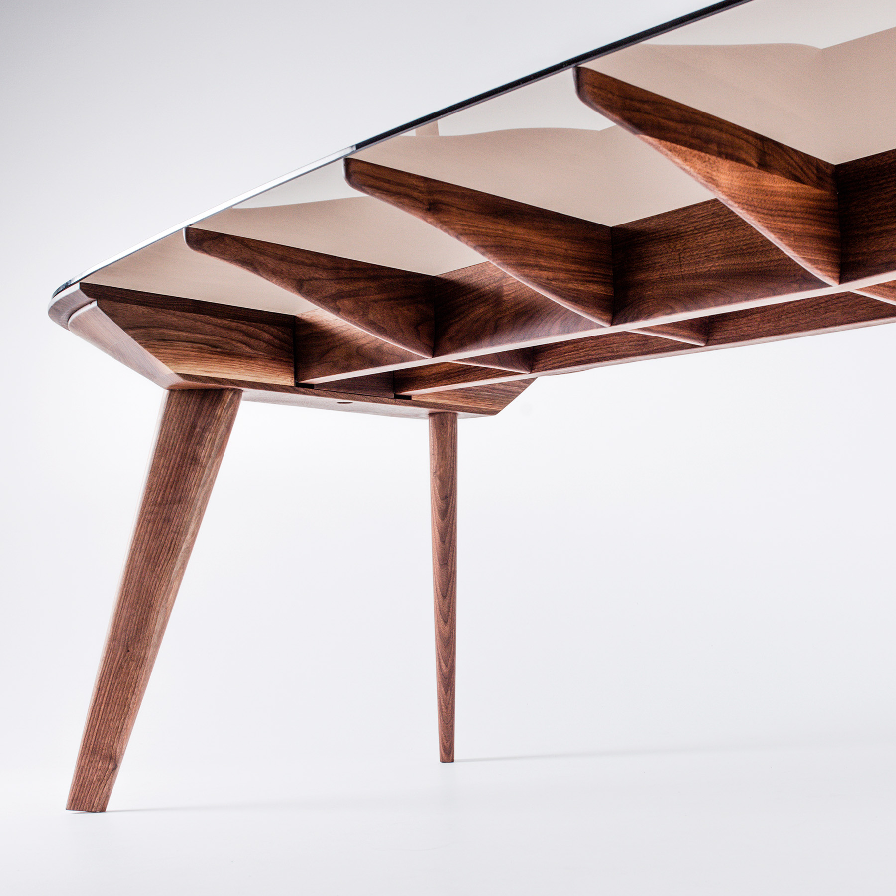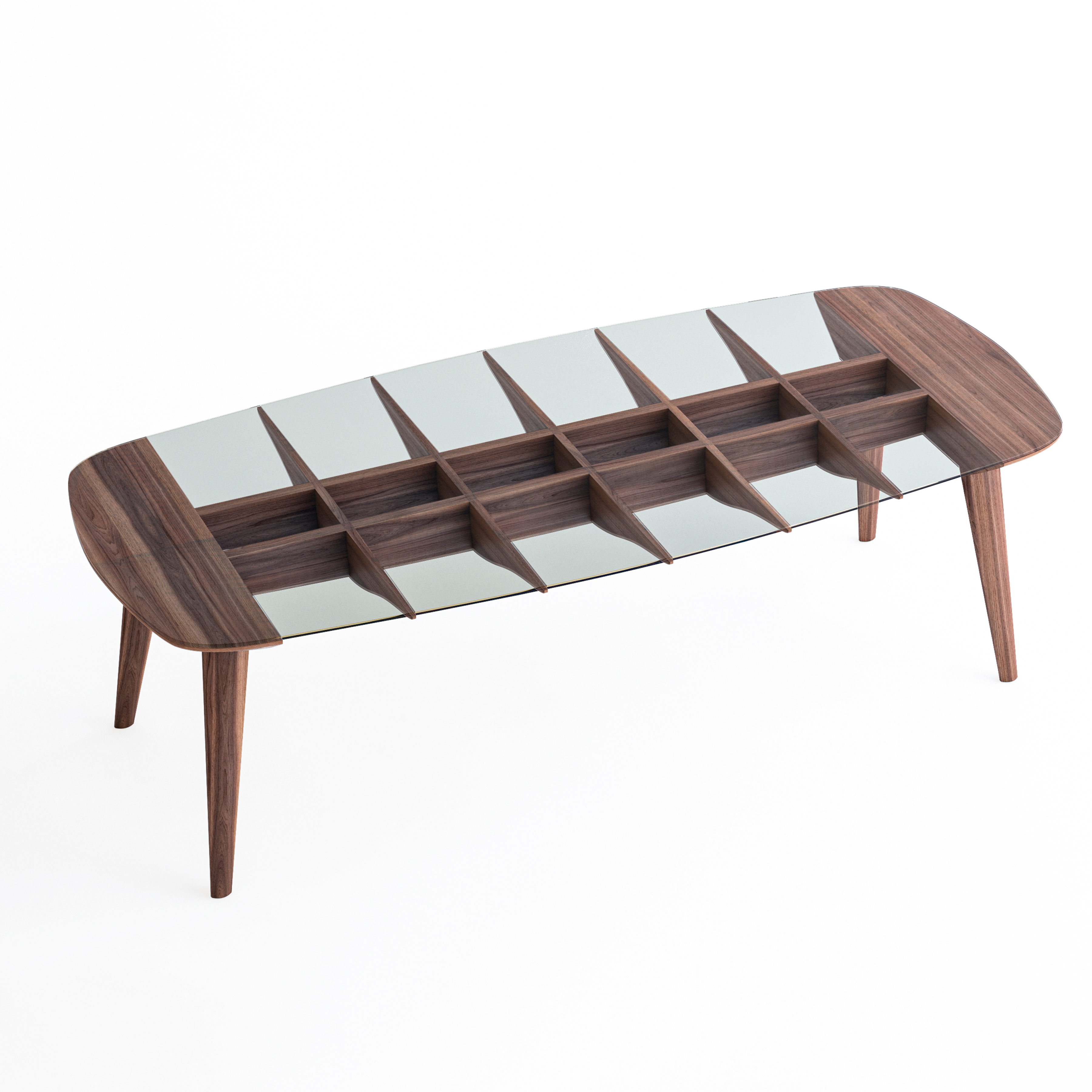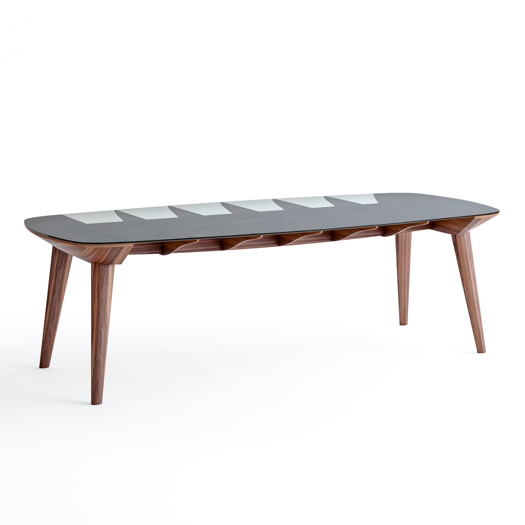 Inspired by the structure of leaves (Herringbone) and by the desire to eliminate what is superfluous, the internal structure of the table and its simple and beautiful silhouette is all exposed to the lovers of this type of construction. Using certified solid wood, fitting and using the least amount of glue possible, combining one of the world's most recycled resources (glass), and using only the know-how of master craftsmen with traditional woodworking techniques, we accomplish our mission perfectly ...