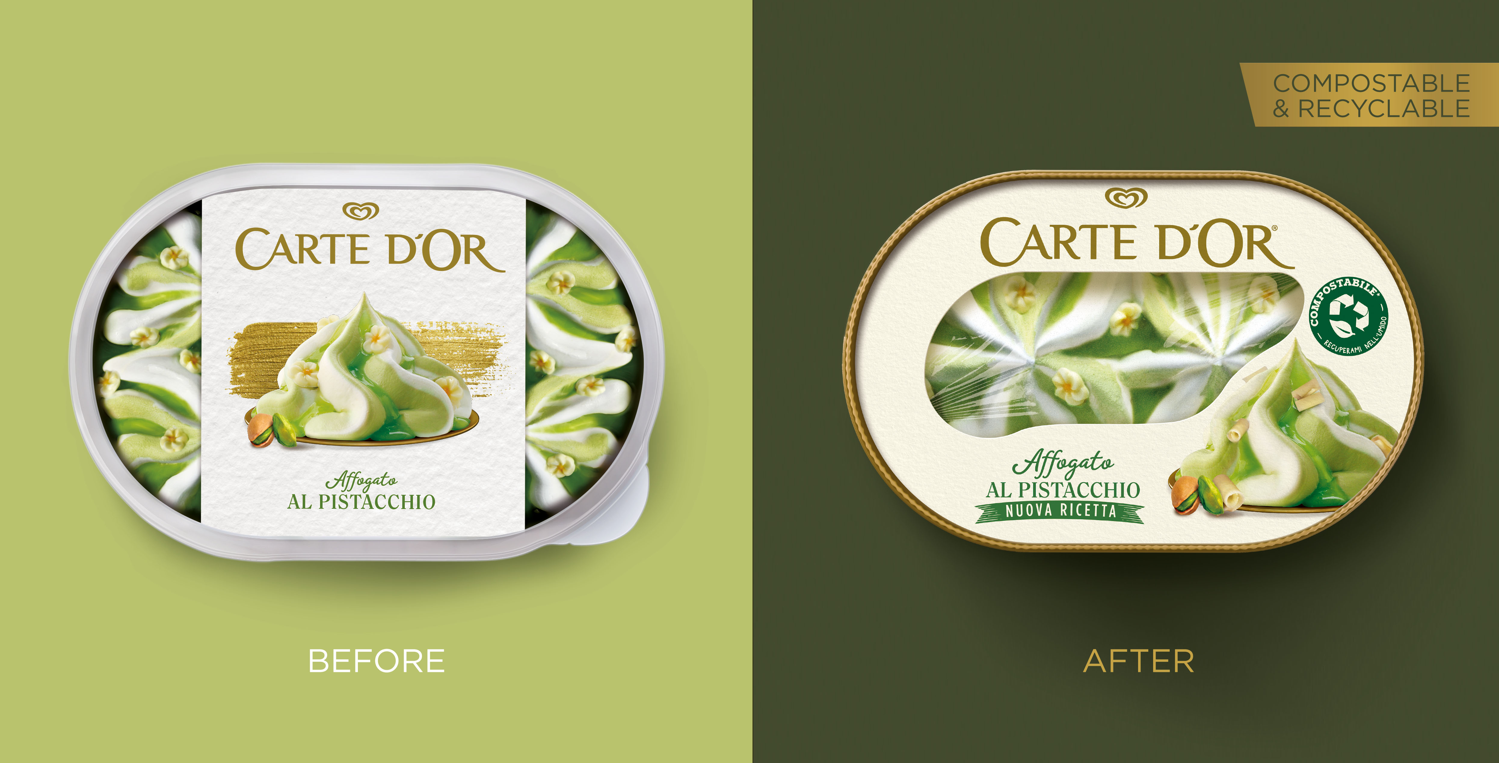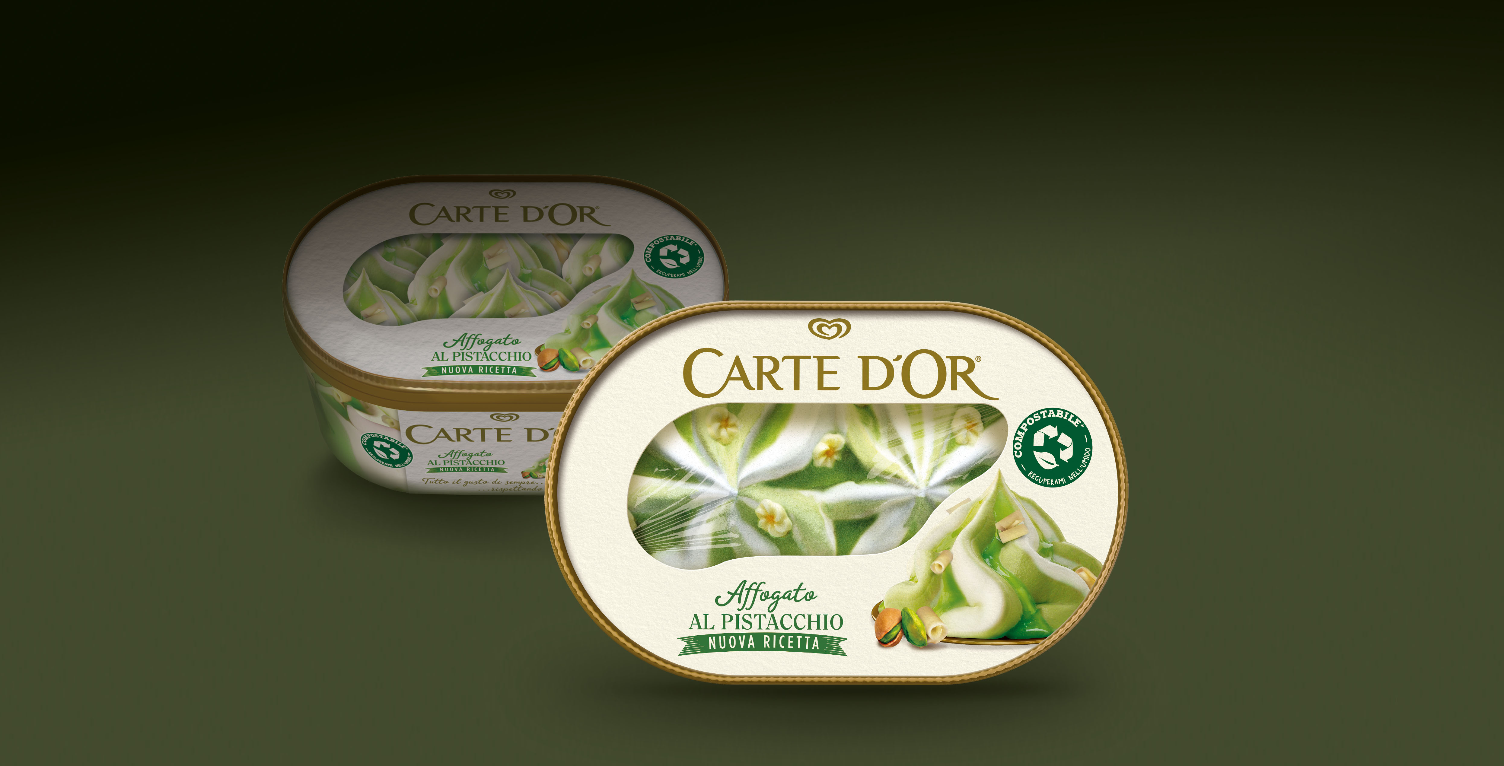 Carte D'Or is a leading brand in the ice-cream in tubs segment in Italy with a large portfolio representing 25 million plastic packaging items per year (= 1200 tons of this material). In 2021, the brand converted the packaging of the Carte D'Or Affogati line from plastic to 100% compostable and recyclable paper.