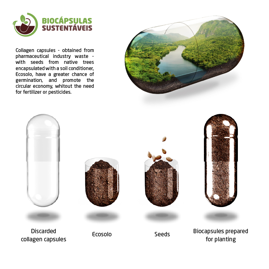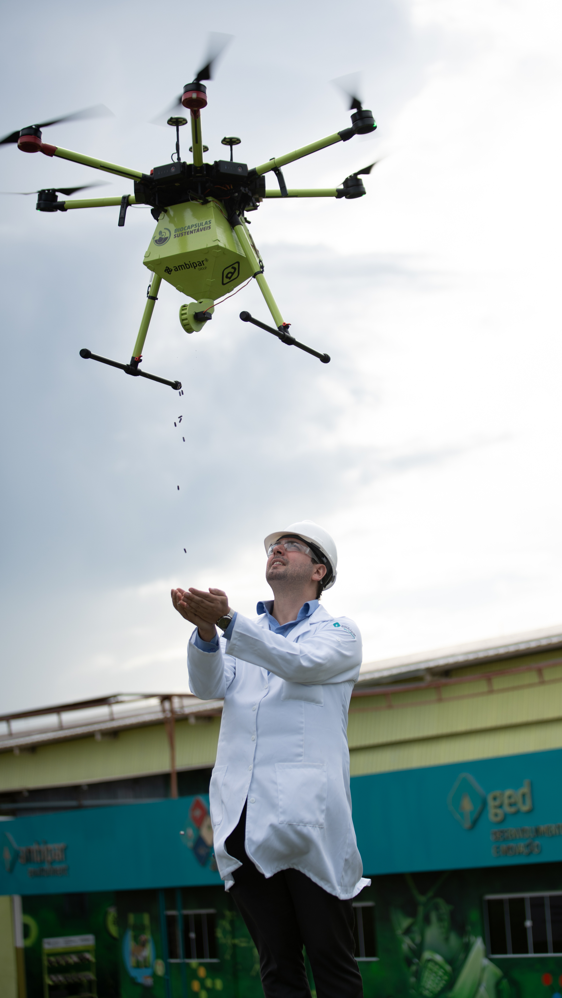 Thinking about these problems, Ambipar developed the technology of "Sustainable Biocapsules", which consists of using waste collagen capsules from the pharmaceutical industry, together with a soil conditioner - Ecosolo® (made with organic waste from the cellulose industry) and native seeds so that they can be played remotely by air (drones for example), thus reaching remote and difficult to access areas. In contact with water, the biocapsules quickly melt and form micro (Boron, Copper, Zinc, Manganese) and macronutrients (Nitrogen, Phosphorus and Potassium), which help in soil nutrition, seed germination and seedling growth, mainly, in degraded and nutrient-poor soils, where there has been deforestation, burning, erosion or other degenerative anthropic action.