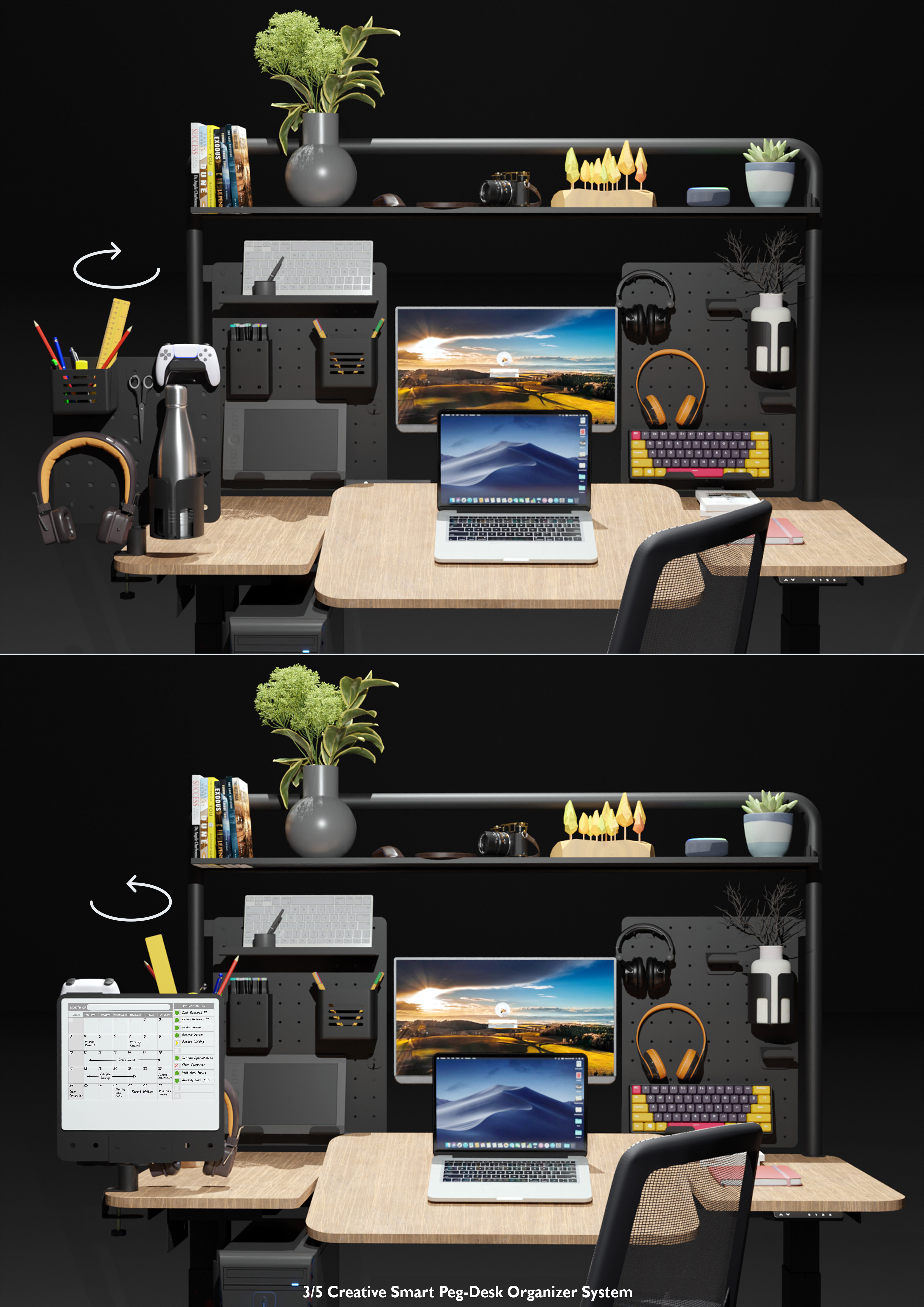 A unique DIY desk mounted 360 degree rotating pegboard system with dual side usages. This modular multifunction rotating metal pegboard system designed for personalizing display and storage on any desk. This rotating system holds one side various stationeries and the other side is for holding a magnetic whiteboard so with this on the desk whiteboard you will no longer be stressing out last minute to fit in forgotten things in your schedule. This space-saving design allows for on-desk or under-desk installation, satisfying different needs.