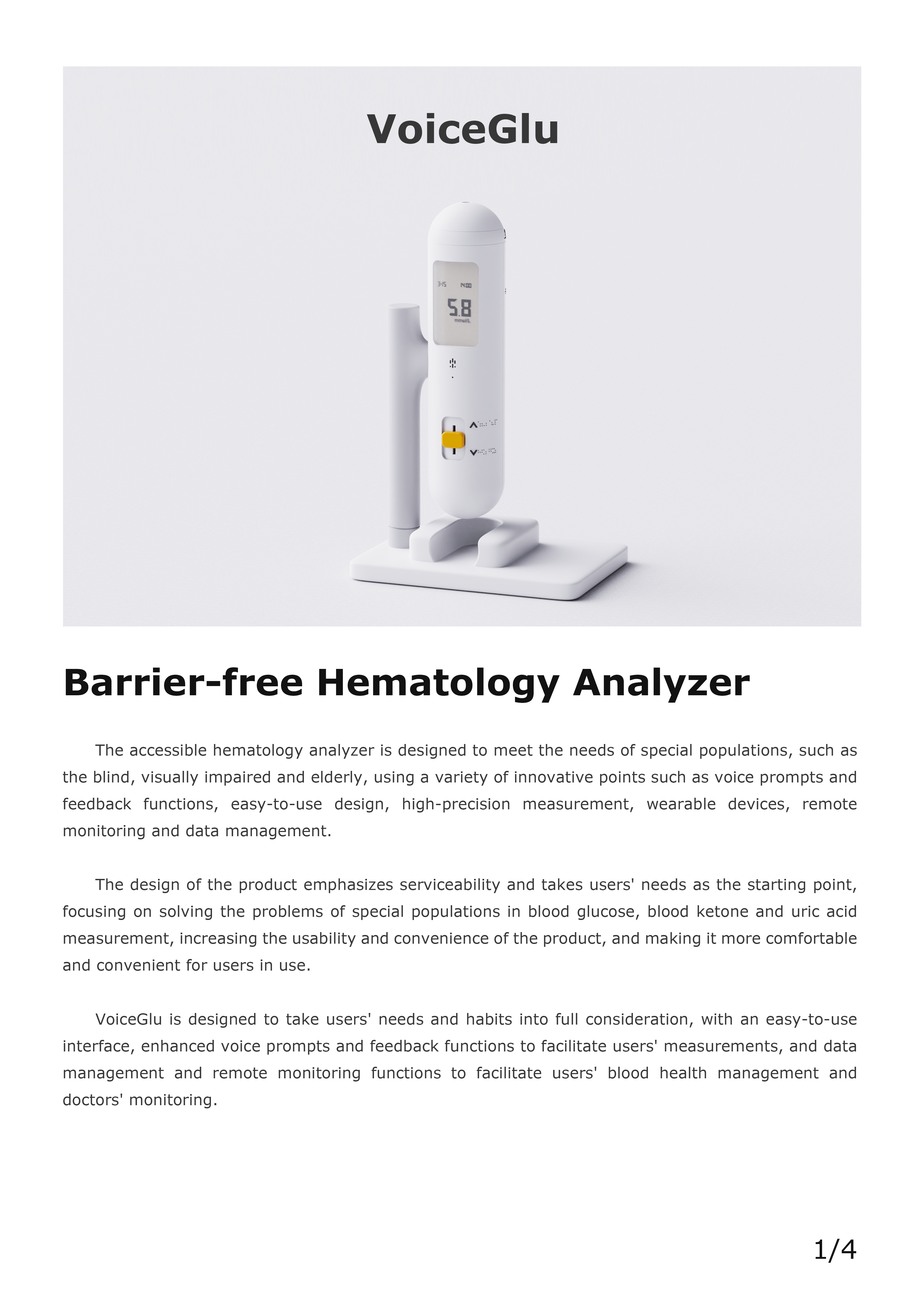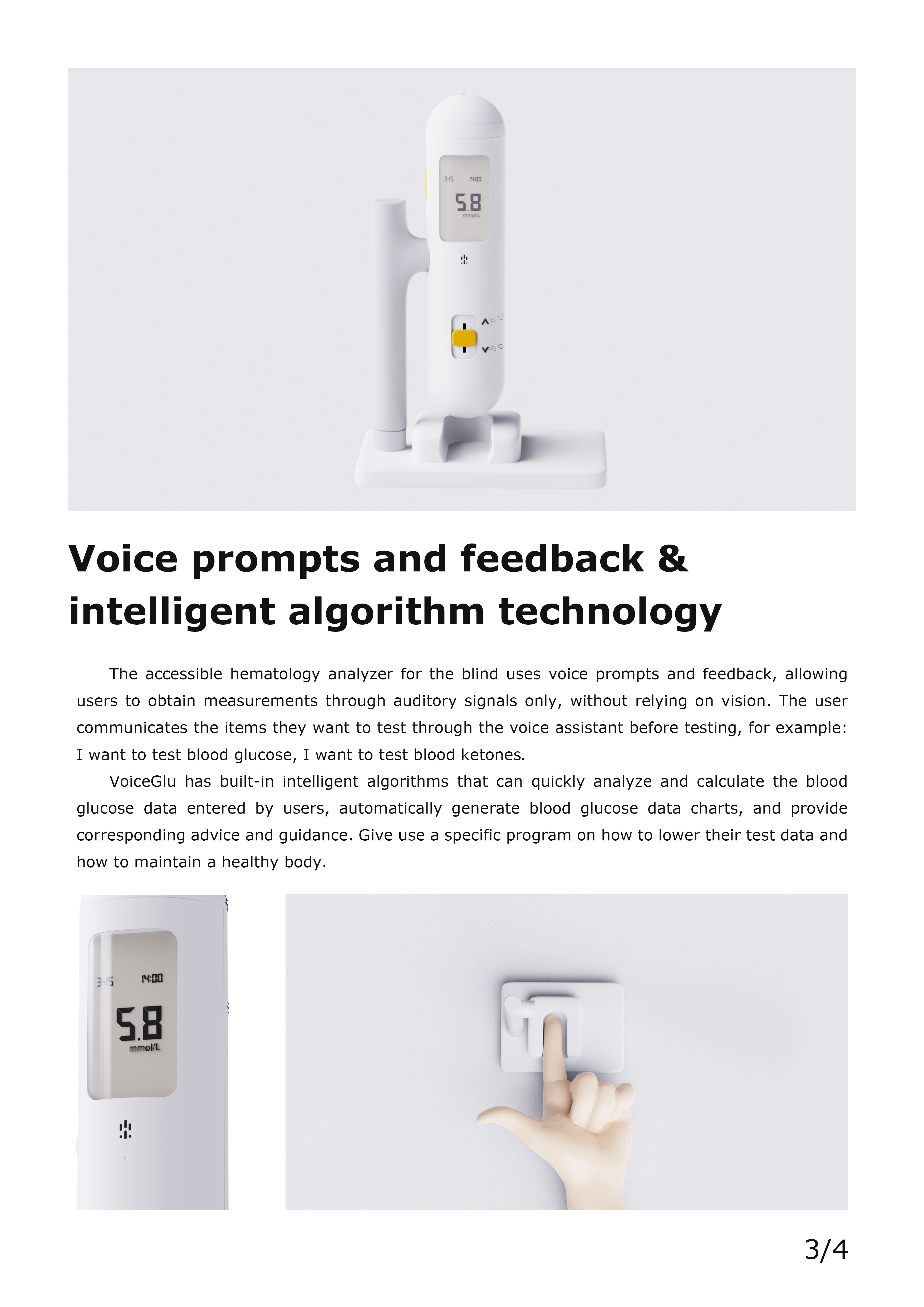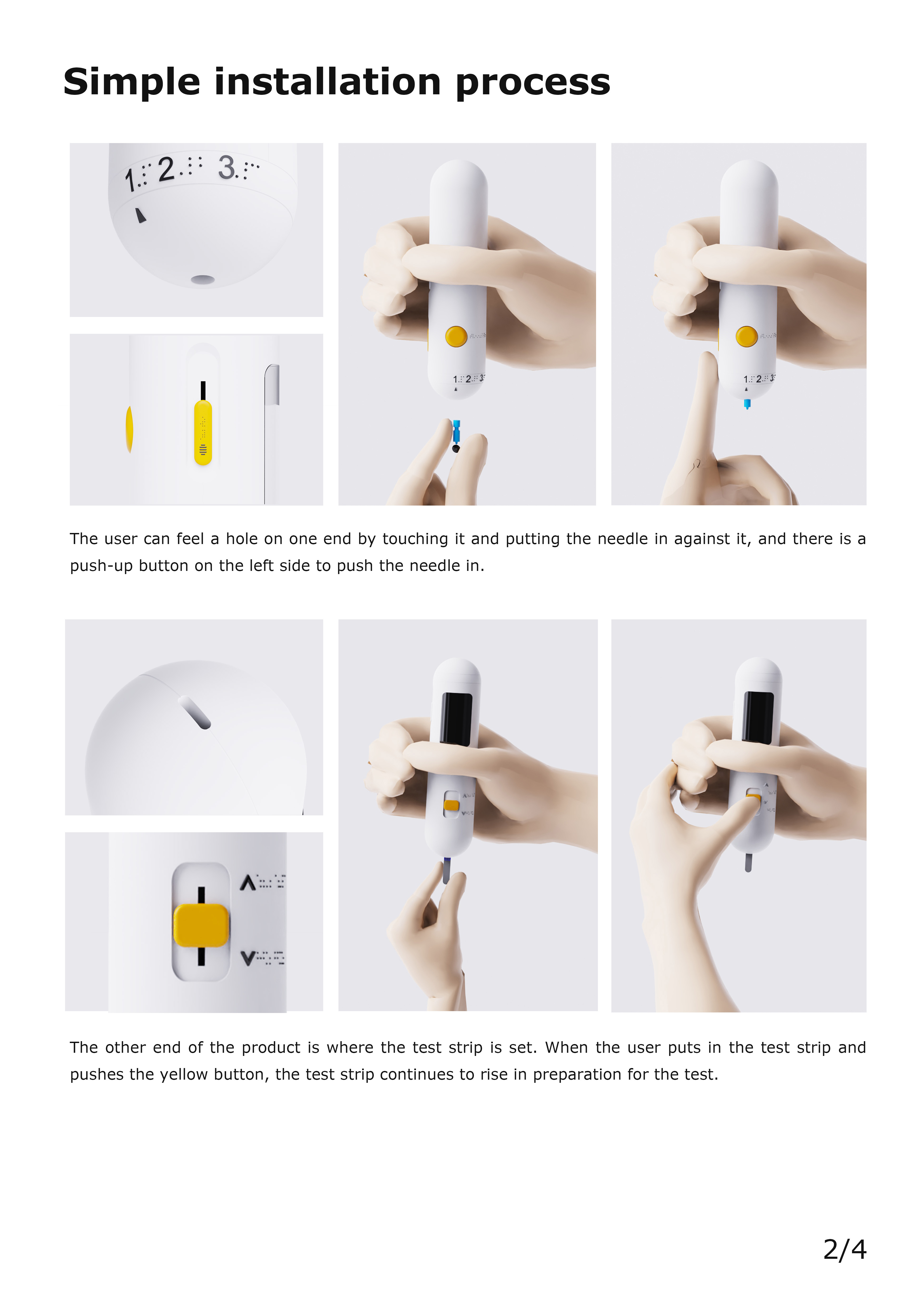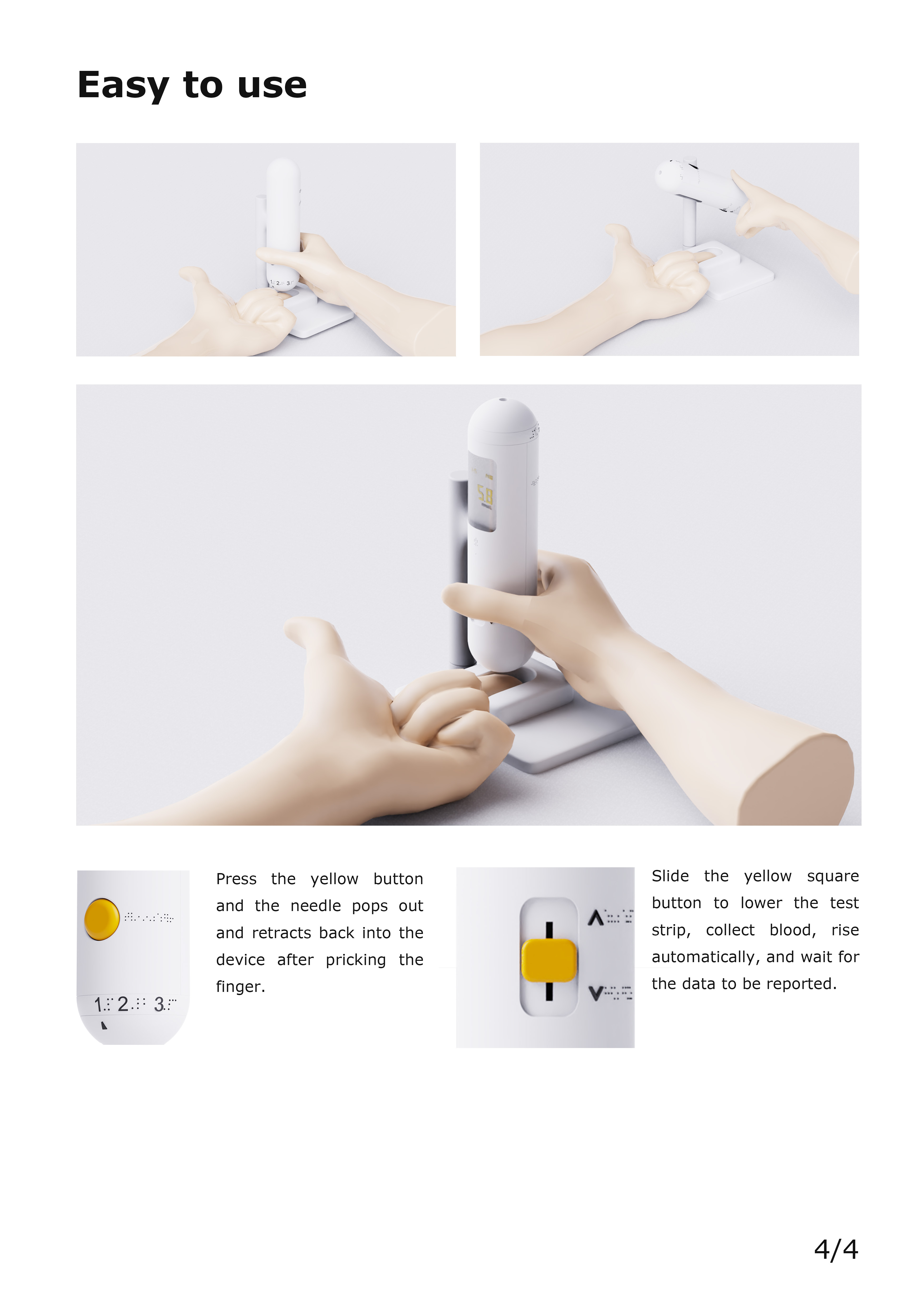 The elders around us have diabetes and have reduced visual ability due to the disease. So through research, I discovered that diabetes reduces the ability to see and that many blind people also suffer from diabetes. It is very inconvenient for these people to use the blood glucose meter, and it often takes many times to test successfully. Moreover, patients not only need to measure blood glucose, but also blood ketones and uric acid, so many instruments are prepared at home. There are two different holes at each end of the device, one is round and the other is rectangular. The circle is put into the needle, slide the yellow button on the left side to push the needle into the device, rotate the device, put the test paper into the rectangular hole, push the yellow square button on the front side to raise the test paper. Communicate the test category through the voice system. Put the finger into the tray and the tray automatically tightens to secure the finger. Aim the needle at the finger to collect blood, rotate the device, and the test paper pops up to collect blood and wait for the voice to broadcast the blood information.