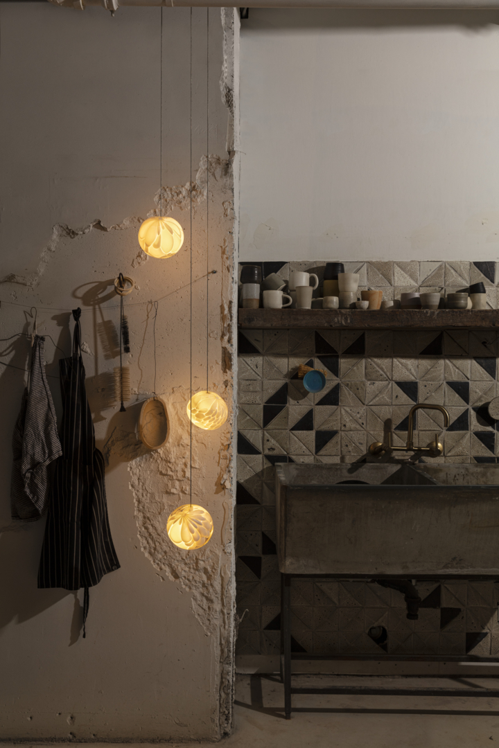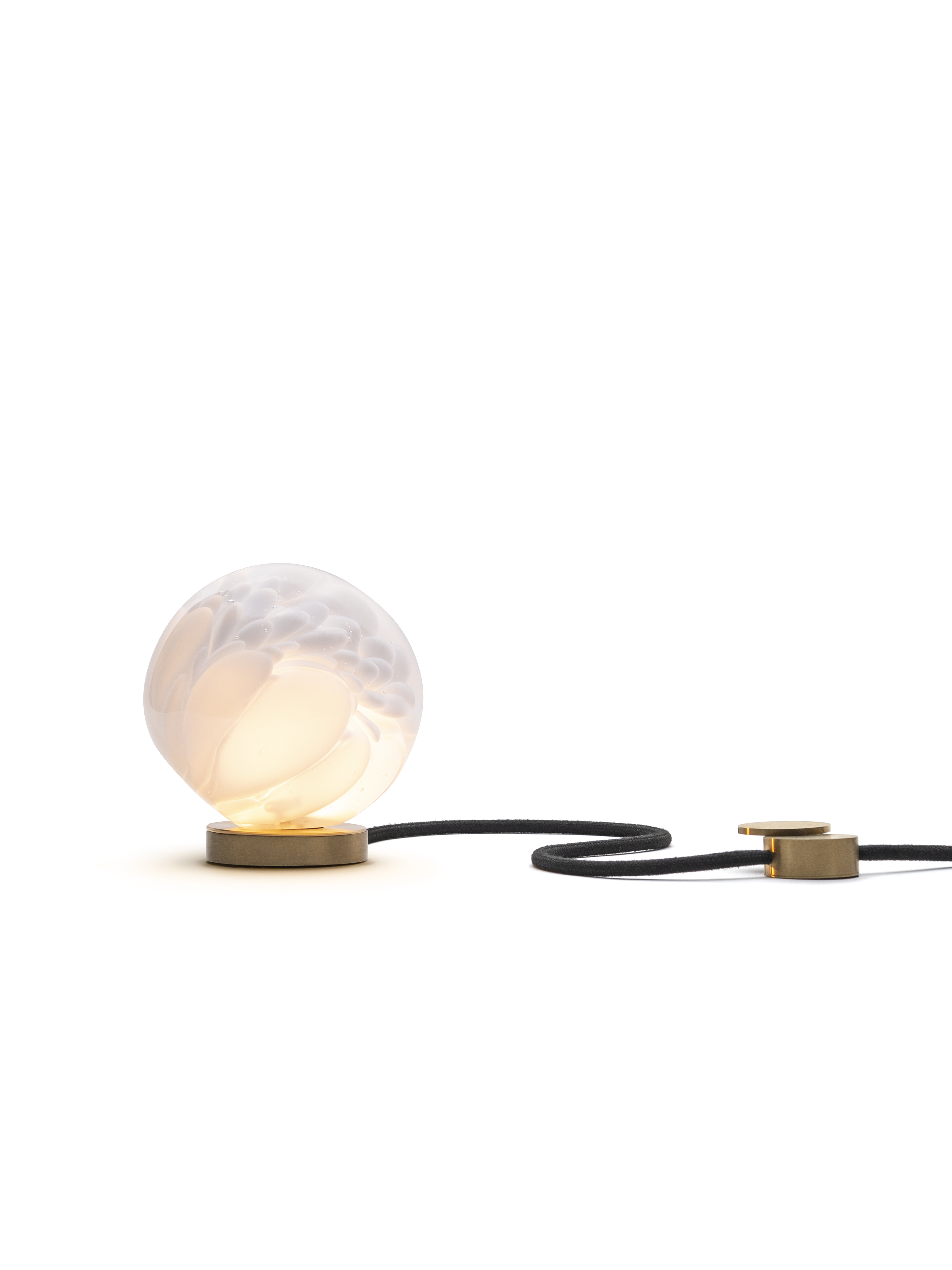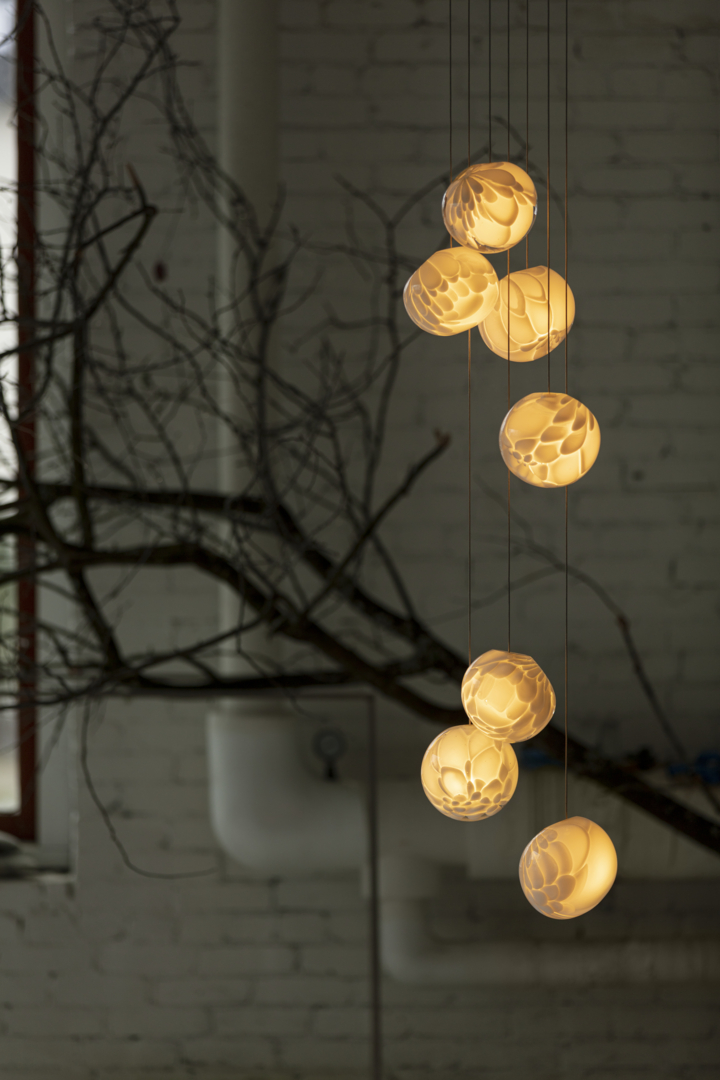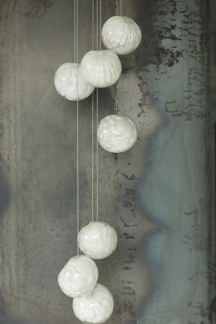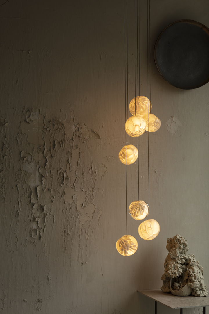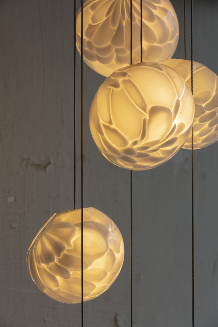 Glass has a memory—it holds onto shapes it was exposed to while still molten. 118’s dozens of tiny feather-like forms, in either opal or coloured glass, arise from this uncanny ability. When lit from within, the interior complexities of 118 come into even sharper detail.