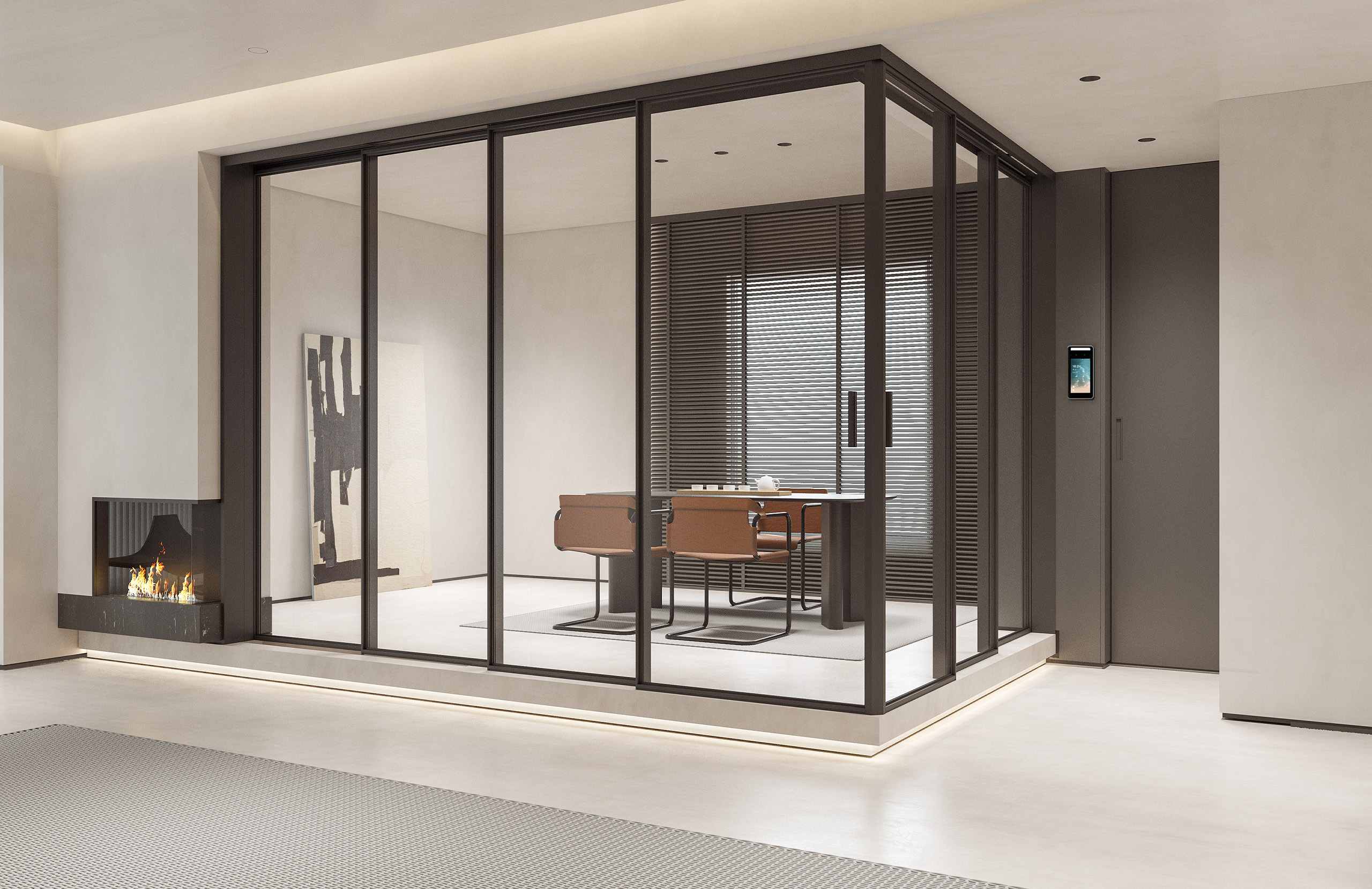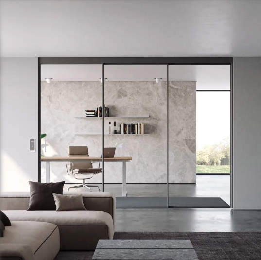 Adopted the unprecedented ultra thin design concept, the door leaf is surrounded by thin aluminum, and the 10mm decorative surface adheres to the belief that "less is better", bringing out the minimalism to the best and creating a visual feast of the elegance in narrow edge design, so as to give users a wider visual effect. With multiple linkage functions such as three linkage, four linkage, split linkage, etc., and the collocation of four rail and three rail to achieve barrier-free corners, it fully shows the transparency of ultra thin doors and windows, which further breaks through the outdoor and indoor space to extend the vision, meeting the users' pursuit of a boundless vision on the basis of aesthetics. The designers who abide by the ingenuity apply magnetic suspension technique to control the door leaf through magnetic steering and linear drive system, which makes the sliding more stable and smooth without physical contact and creates a silent and high-quality use experience. Combined with a variety of digital systems, like infrared sensing and controlling system, facial recognition system, voice control system, remote control system on mobile Apps, etc., it can not only automatically open the door leaf through proximity sensing, making the barrier free passage more convenient, but also adjust the switching speed and time and other parameters on Apps intelligently. As a result, it is suitable for all kinds of sliding doors, changing users' life with digital technology, and showing the beauty of smart home. Equipped with electromagnetic lock - the anti-theft system accessories, when the door leaf is closed, the mechanical lock is attracted by electromagnetic force to effectively prevent being pried with higher anti-theft performance. Even in case of fire or power failure and other emergencies, the electromagnetic force will disappear automatically, so that the door leaf can be opened and closed normally with a light push, which not only ensures safety, but also brings more possibilities for smart-home decoration design. The buffer device on the door leaf can prevent the collision when opening and closing.