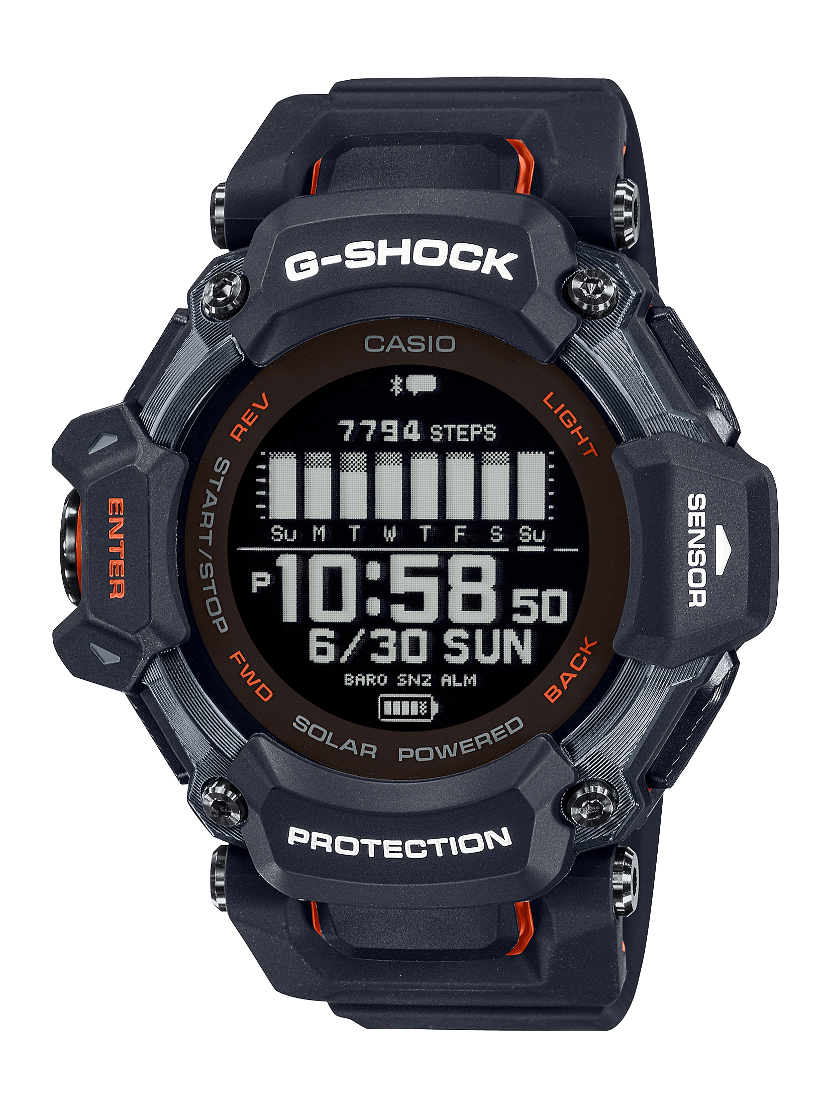 Designed with comfort in mind, the MOVE features textured side buttons, a band with a wide range of motion, and other improved exterior design features, as well as a built-in GPS antenna, resin case back, and thinner rechargeable battery making it smaller, lighter, and more comfortable than ever. Pulling inspiration from sports gear design, the watch’s dual-layer frame helps mold the shape and color components, while the bezel and band are formed from biomass plastic, an eco-friendly material that helps reduce the ecological footprint. Additionally, the GBD-H2000 has both solar-assisted charging and USB charging.