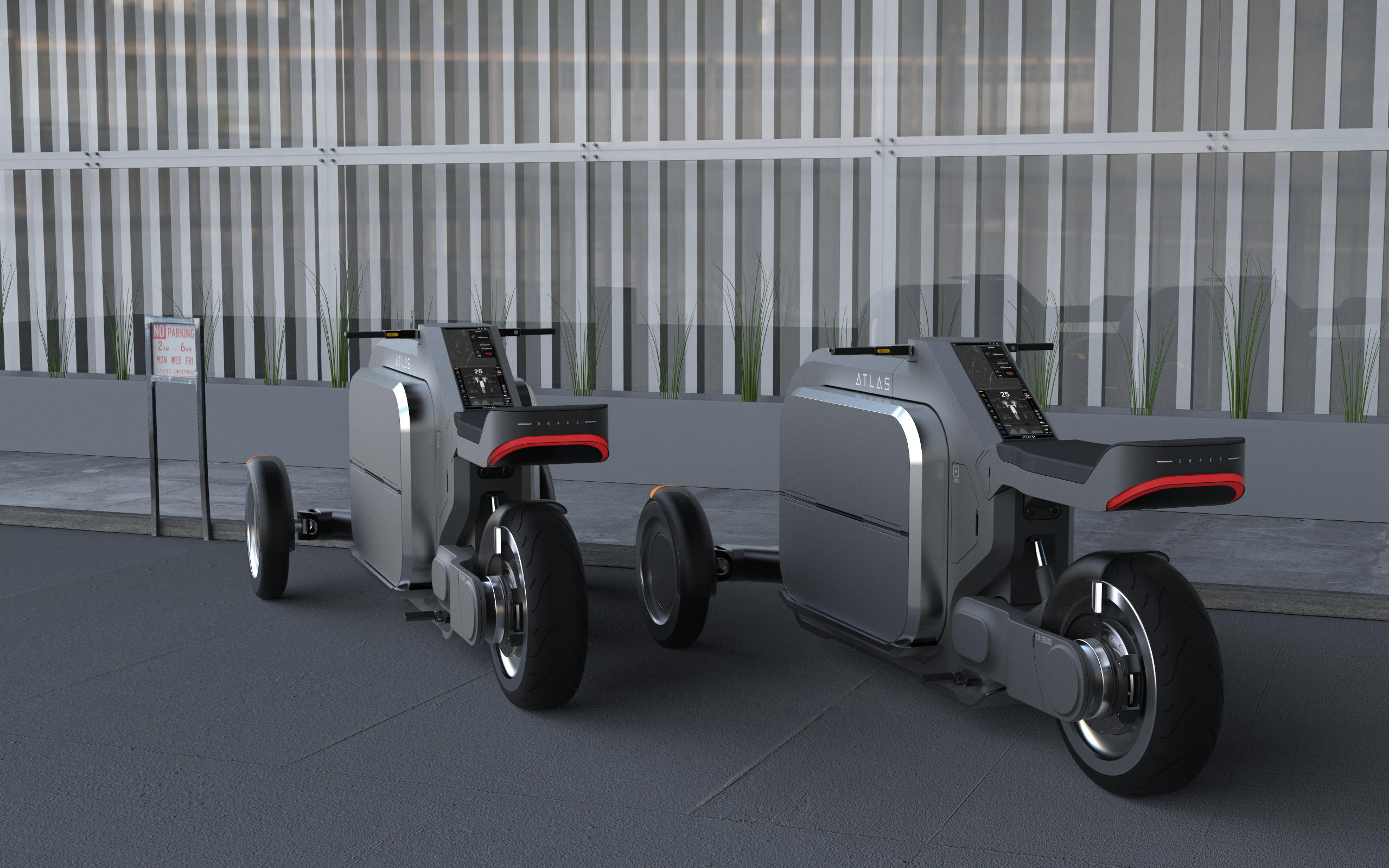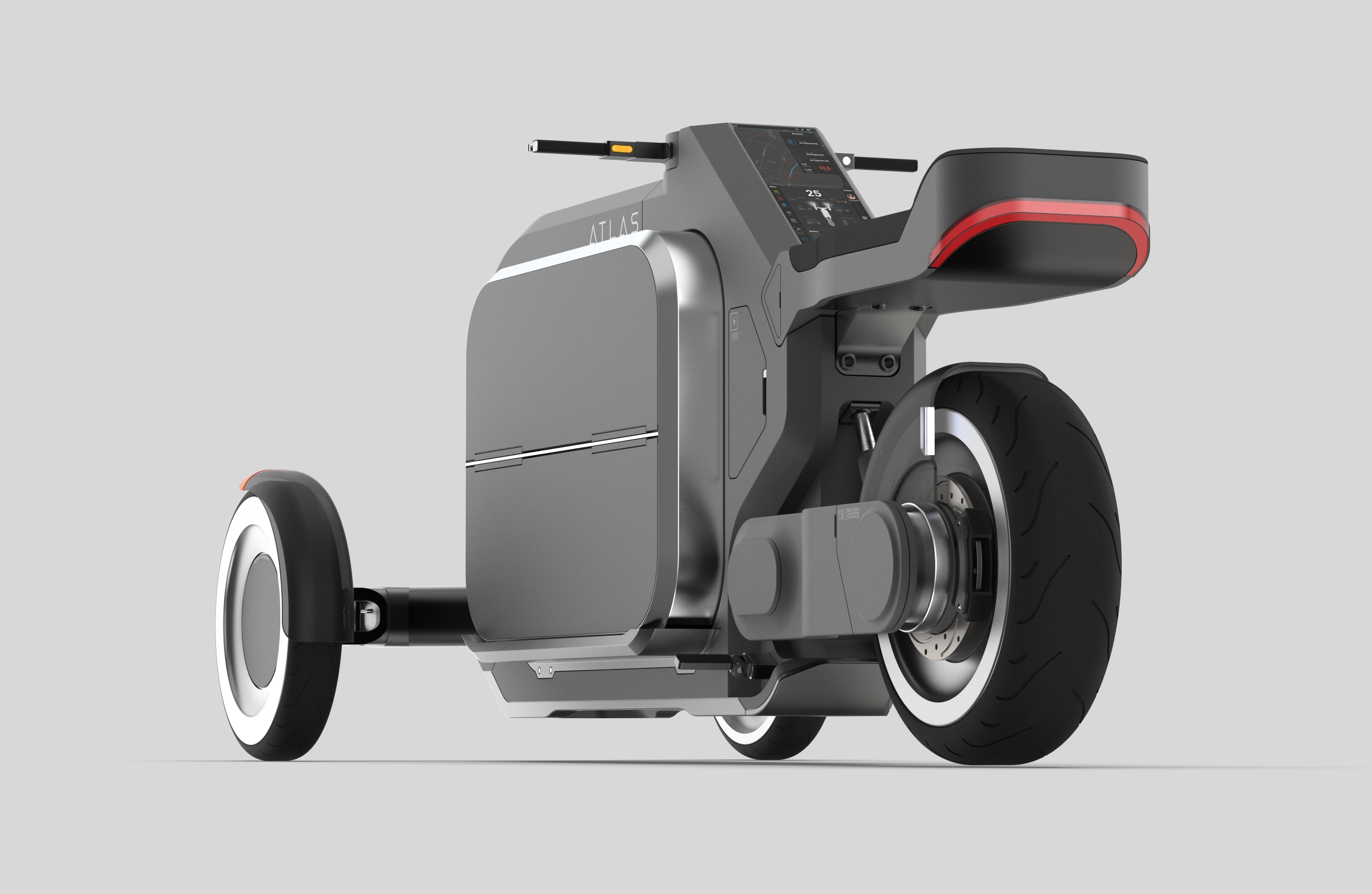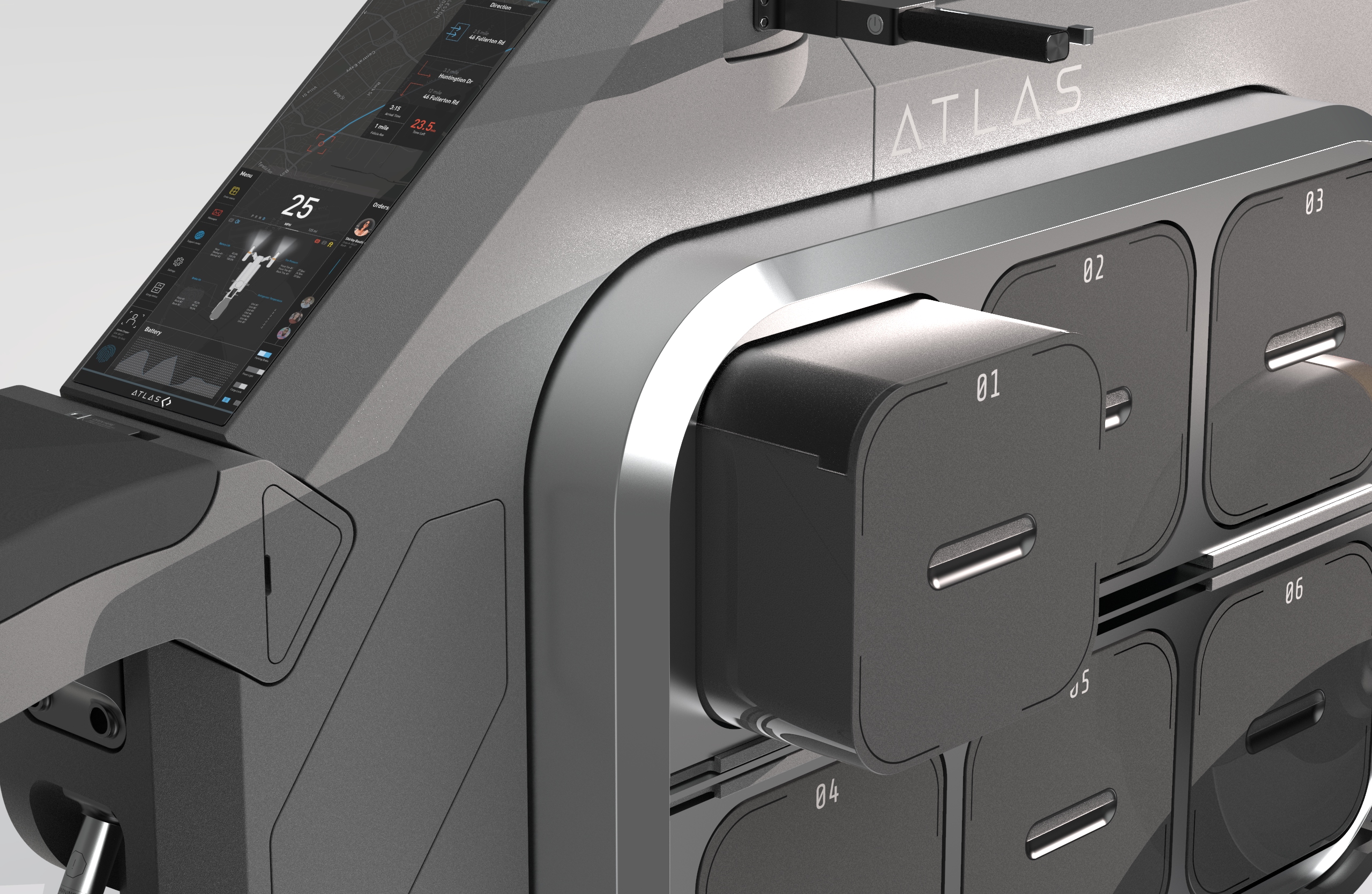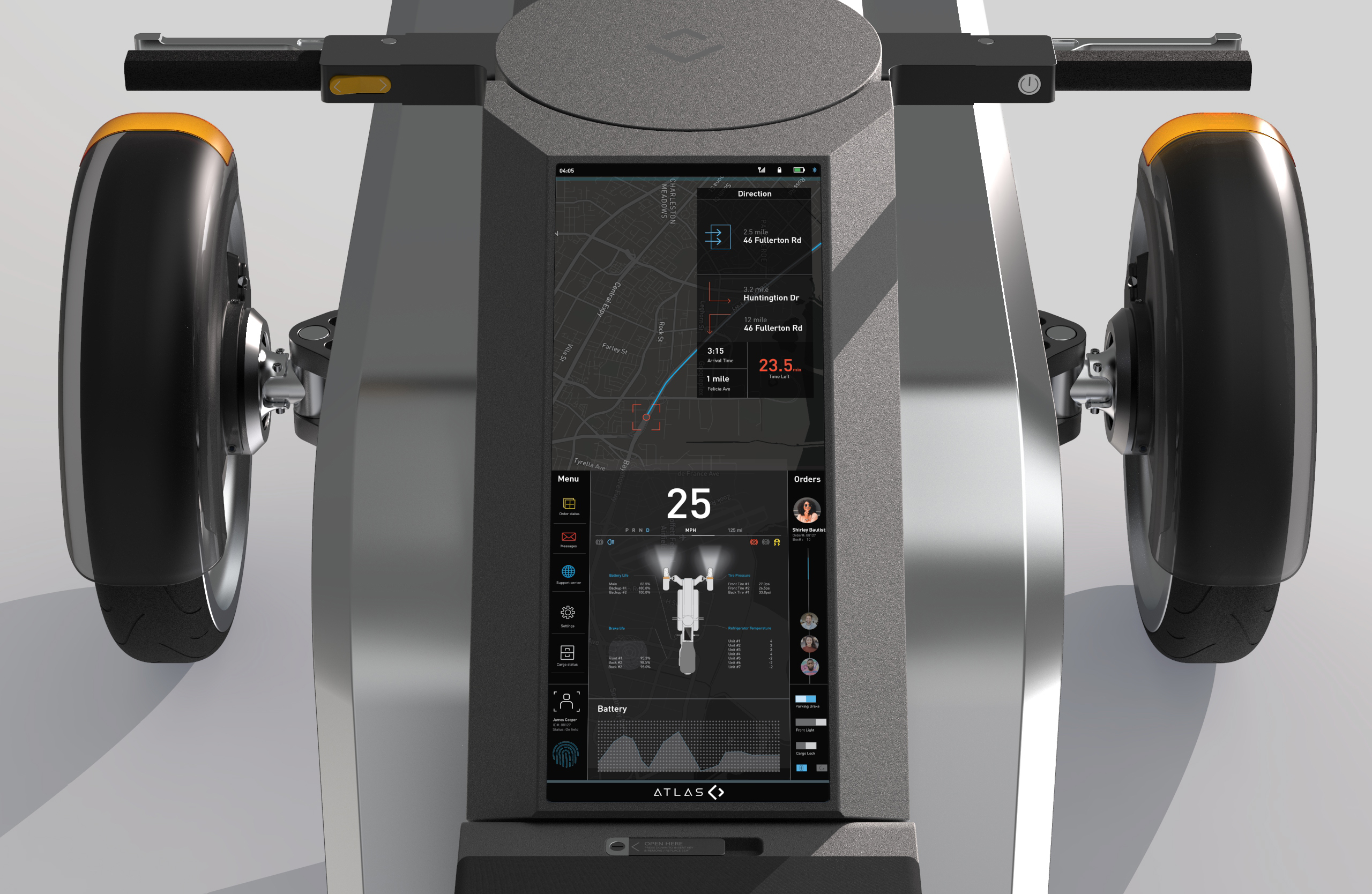 ATLAS is a revolutionary fresh grocery delivery system for city dwellers that incorporates a fully electric delivery vehicle, a quick set-up warehouse, and a specialized UI interface. The advanced delivery vehicle is a fully electrified scooter equipped with a refrigerated unit, an innovative interface, and 12 storage pods. We must transport and sell affordable, high-quality grows from suburban areas to the city and help suburban citizens get high-paid jobs. It's a sustainable way for both city and suburban people to benefit each other and a bridge for communication.