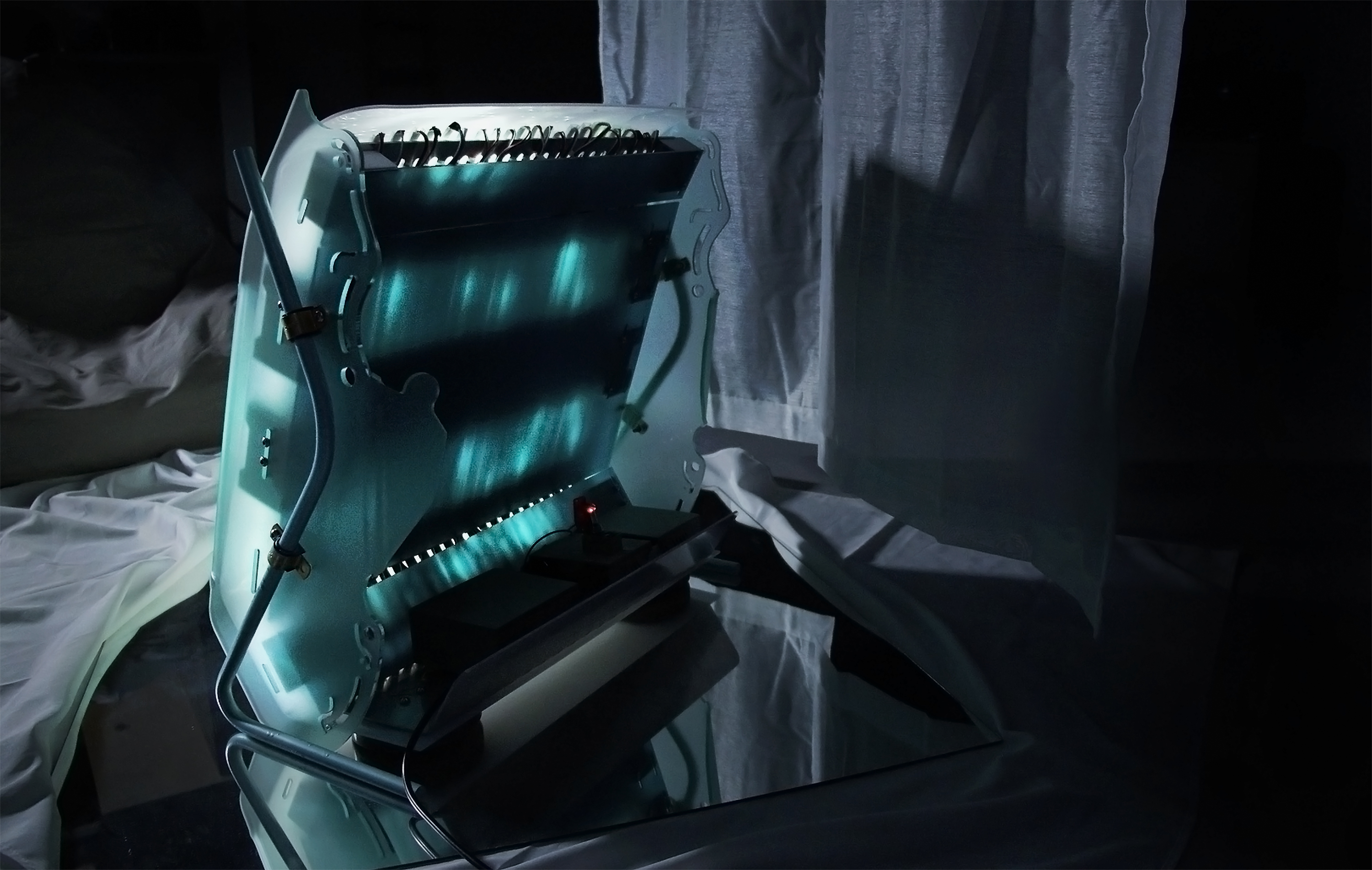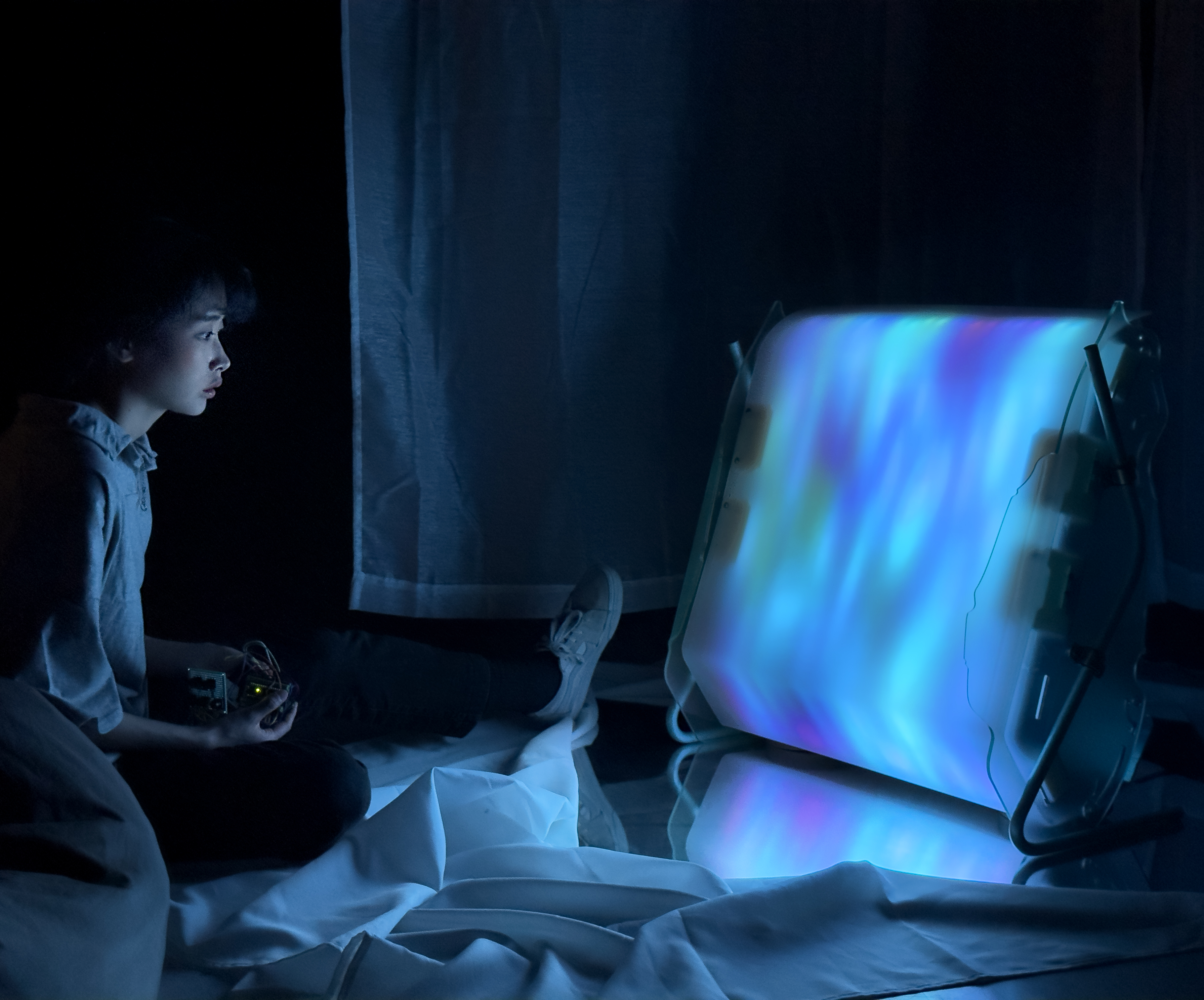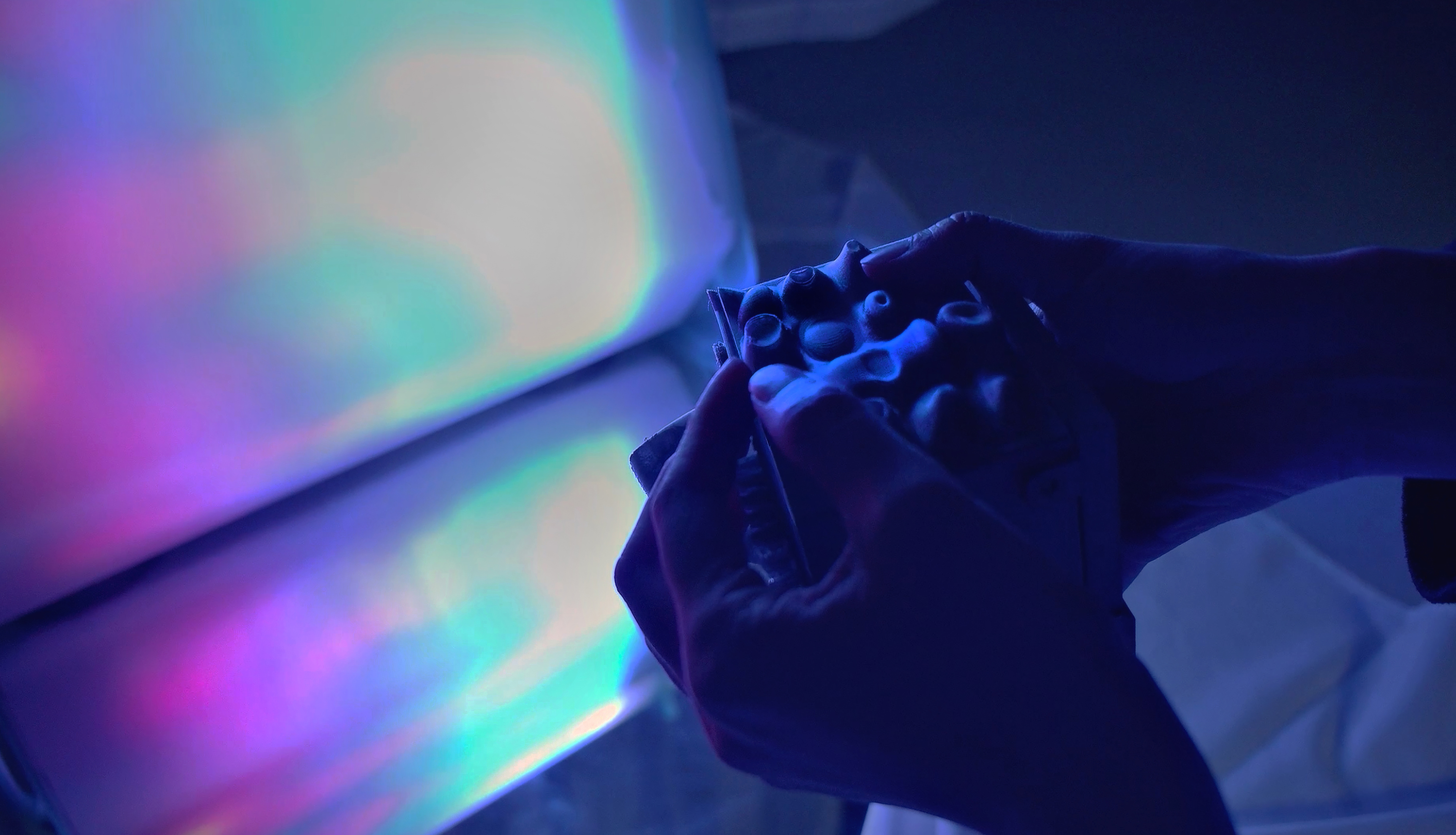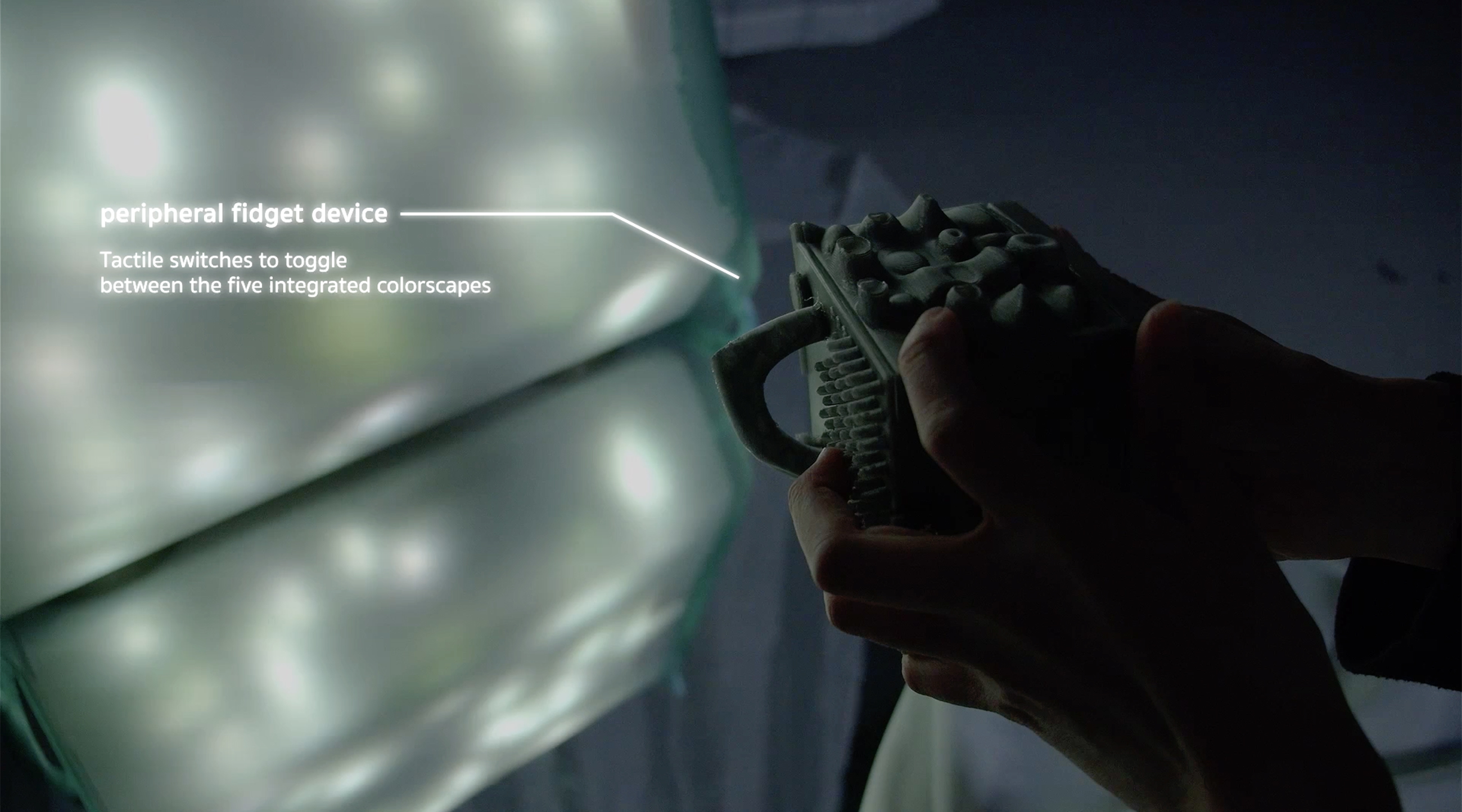 Luminous Solace is an interactive chromatic light that beckons users to embark on an exploratory journey into the soothing and comforting experience of fidgeting motions with light and colors. The light comes with a peripheral tactile fidgeting device, designed with an assortment of textures and touch-sensitive switches for haptic interactions. The device interacts with the lighting object with convex diffusor, which casts a variety of colorscapes that transform in response to fidgeting motions. Participants can use the tactile switches to toggle between the five colorscape integrated into Luminous Solace. As the participant fondle and massage the fidget device with their hands, the recurrent motions influence the color dynamics, modifying its hues, patterns, dimensions, and compositions. Subsequently, these alterations permeate the encompassing space, generating a distinct manifestation of emotional comfort and tranquility. The amalgamation of tactile manipulation and luminance cultivates a serene encounter, fostering an atmosphere of calmness and equilibrium. Perhaps this is a way to unwind after a long day at work, walking into a darkened room with nothing but a glowing array of mesmerizing colors and lights in the corner. Luminous Solace facilitates an immersive environment that encourages users to delve into the therapeutic experiences of tactile engagement while simultaneously accentuating the impact of chromatic and luminous elements on human perception and emotion. The interactive lighting provides a prospect for participants to interface with radiance via haptic and sensory modalities, thereby fostering a deeper connection between our sensory, bodies and the minds. Luminous Solace is more than just an immersive light, it is about creating a space for emotional comfort and well-being.