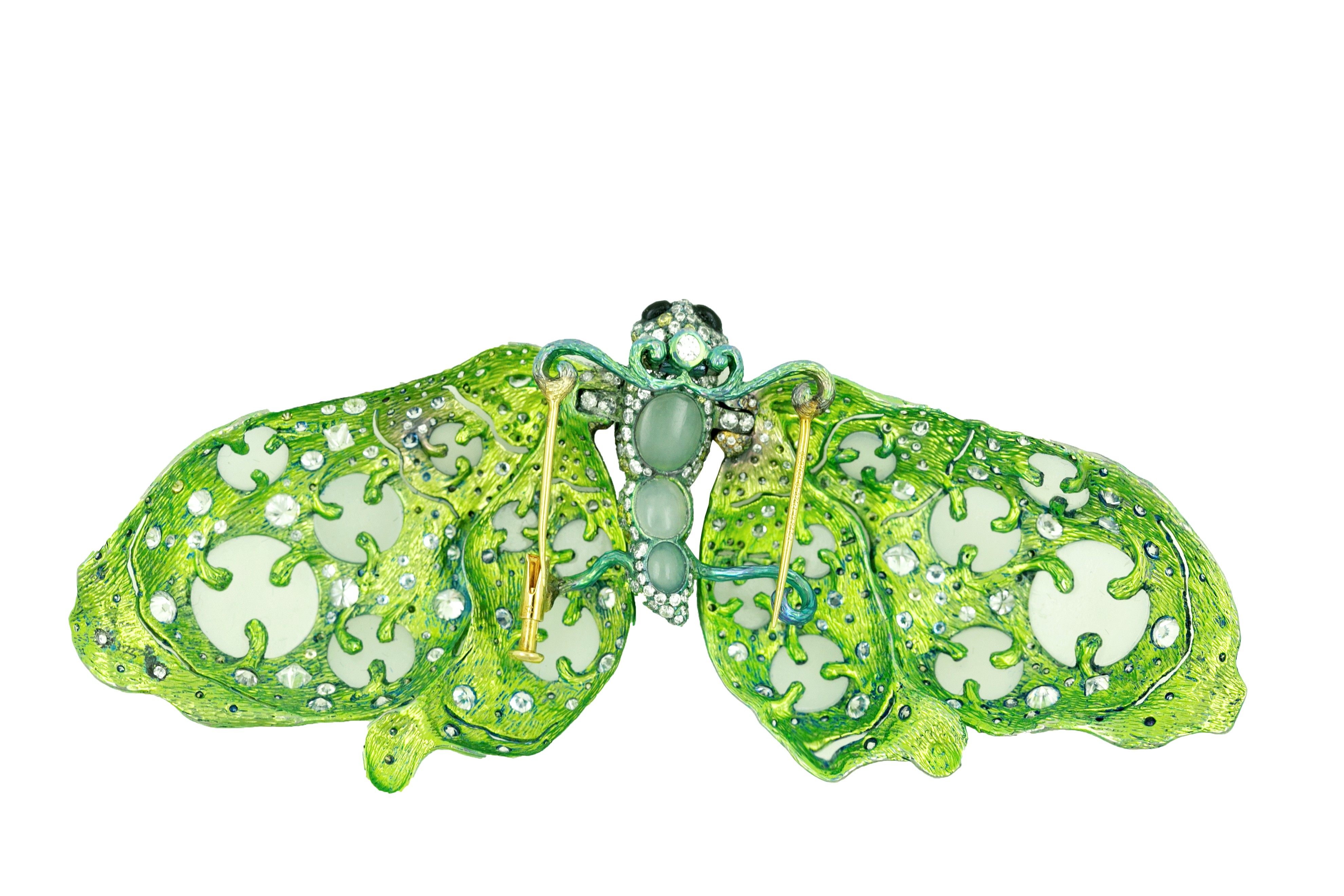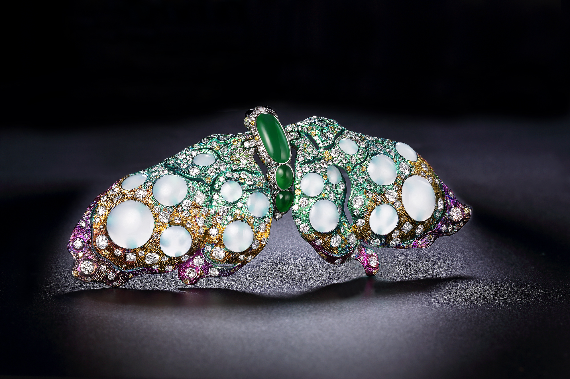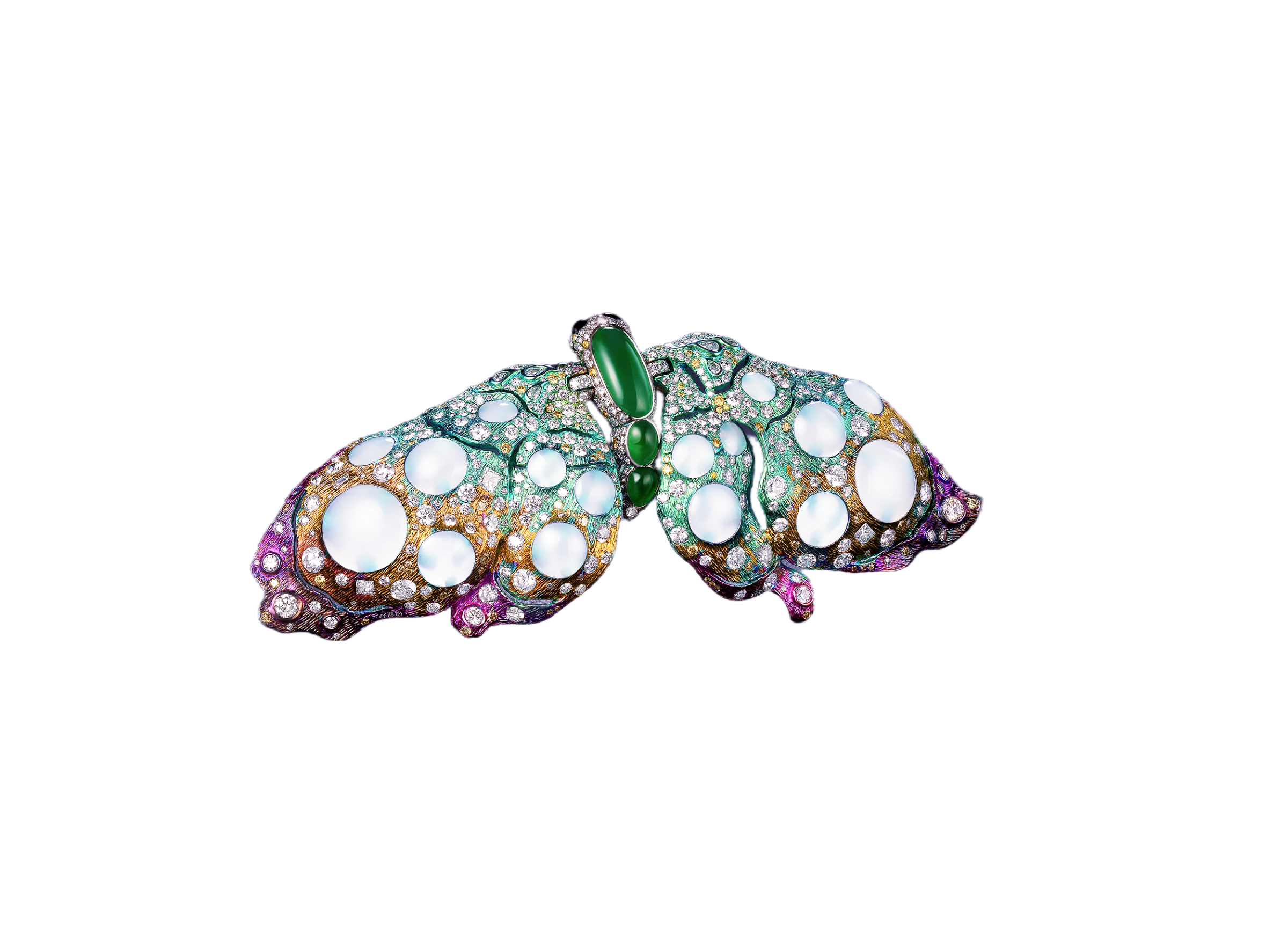 Computer modeling, 3D printing titanium alloy process and unique electrolytic coloring process are used in the process, and the white Hotan Jade is used creatively. It has a translucent texture, which will make the brooch blend with the color of the clothes it wears.