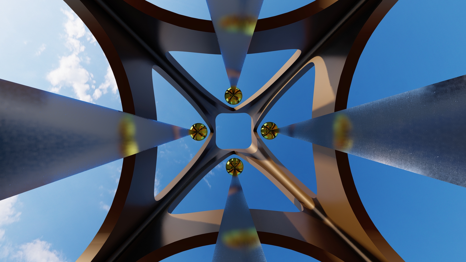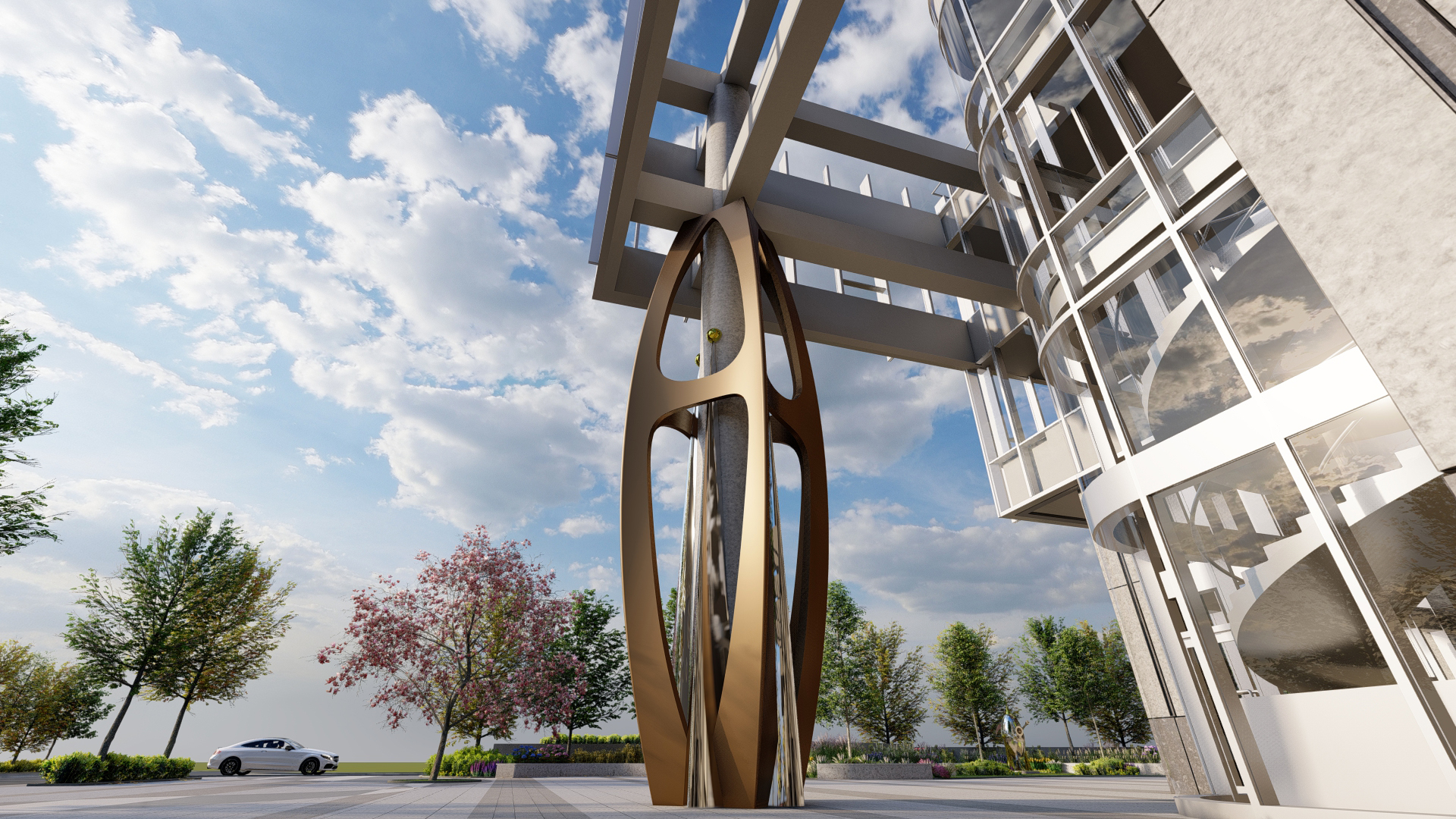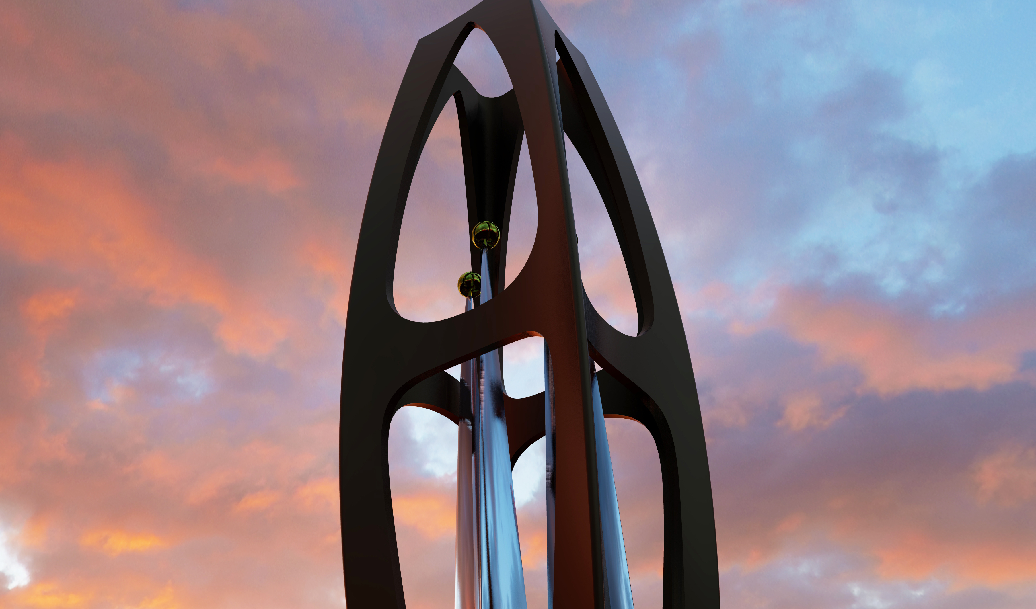 The purpose of technology is to improve people's lives, and it is a tool that can be used for this. The artist has incorporated technology into their work, which has a sense of warmth. The body of the work is hollow and has curved lines, with four tapered pillars attached to it. At the top of the pillars, there is a ball that adds to the overall aesthetic. The work can serve as a station to receive information from all over the world, a symbol of growth, and a container to carry the seeds of the earth. This theme is echoed in the piece titled "Sailing to the Future." The work is 380cm in length, 380cm in width, and 1080cm in height, similar in size to a large space shuttle. It carries the hopes of humanity and is prepared to embark on a better future.