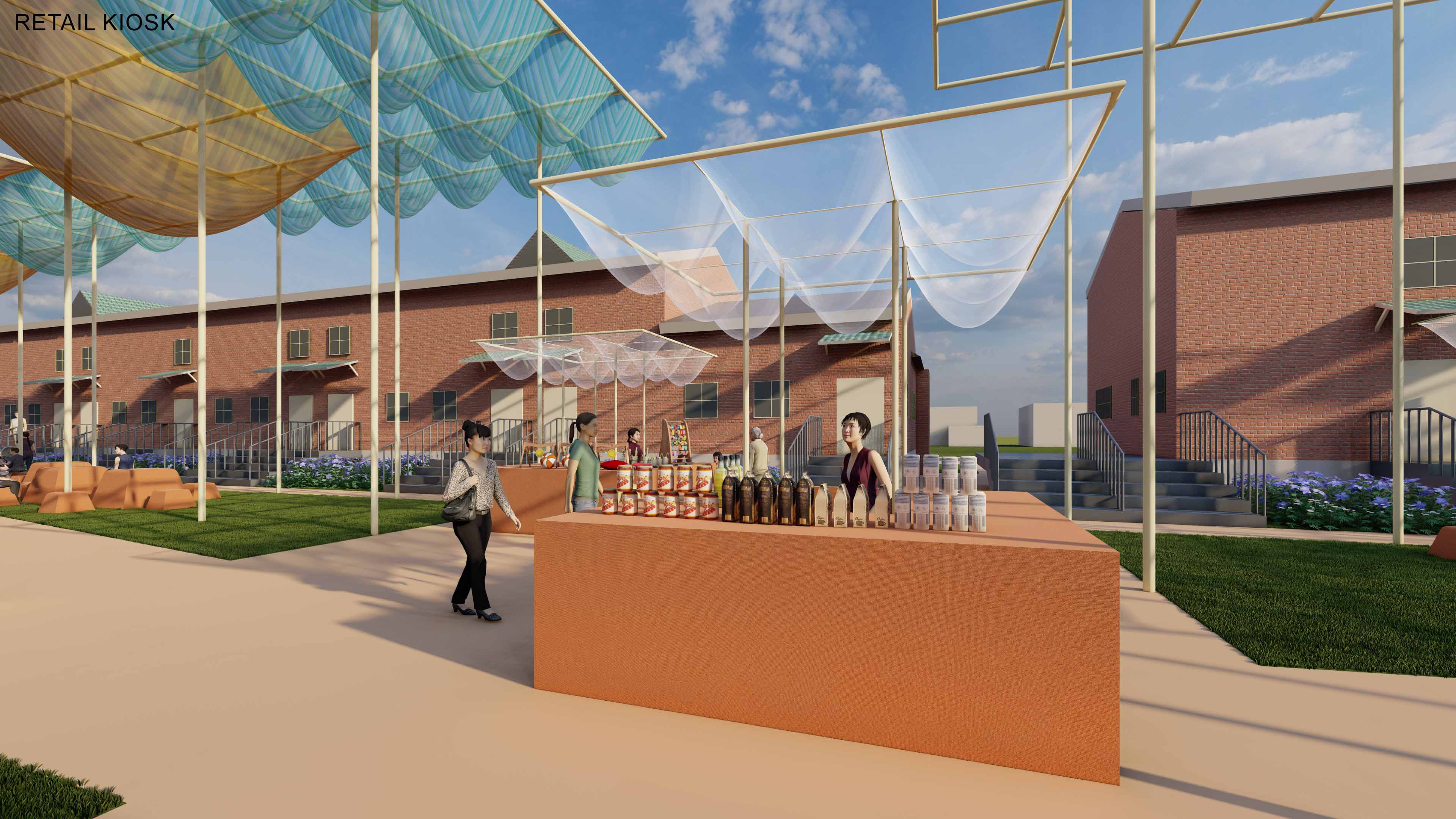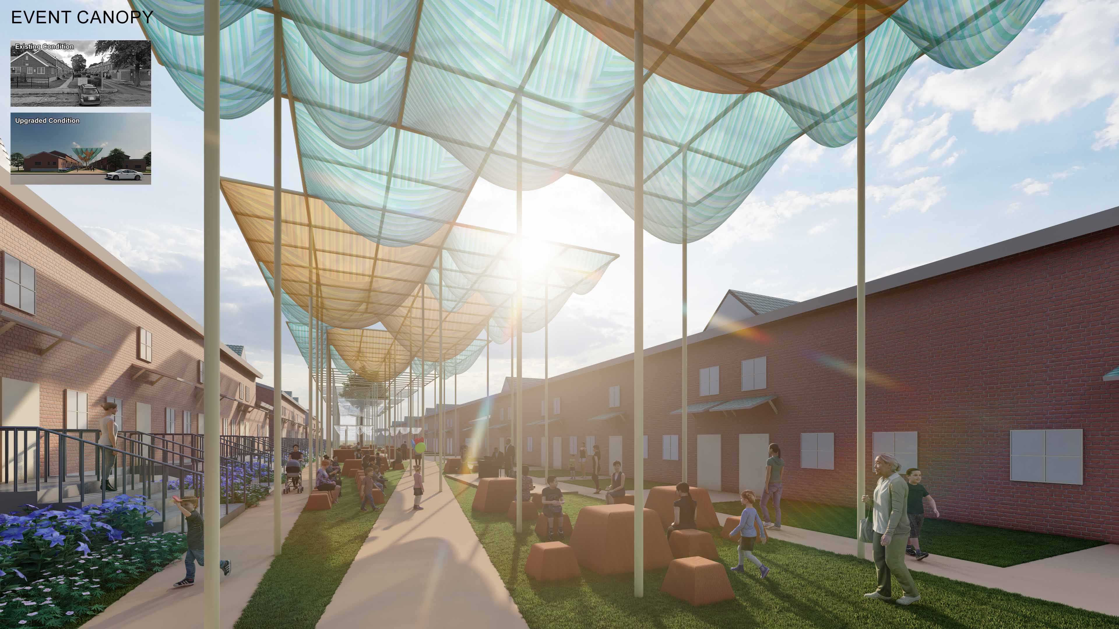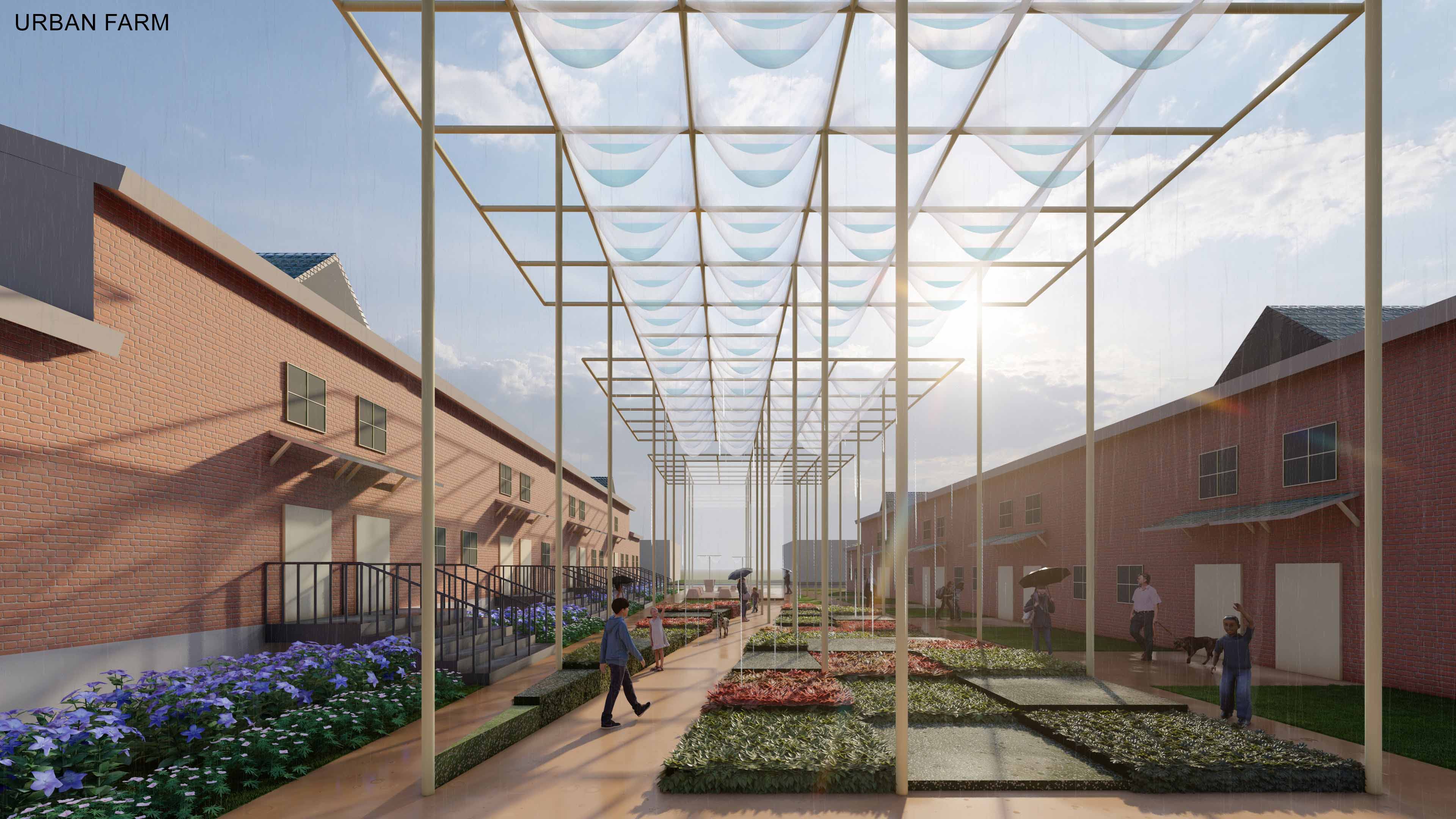 At the core of our design lies the the “Netscape” track system, a flexible framework that utilizes recycled fiber and fabric materials to create nets. This innovative structure pays homage to the city’s past while accommodating urban farming, modular pavilions, and adjustable furniture on a track system. Netscape allows users to personalize their desired level of privacy or publicity and encourages diverse activities for day and night-time use.