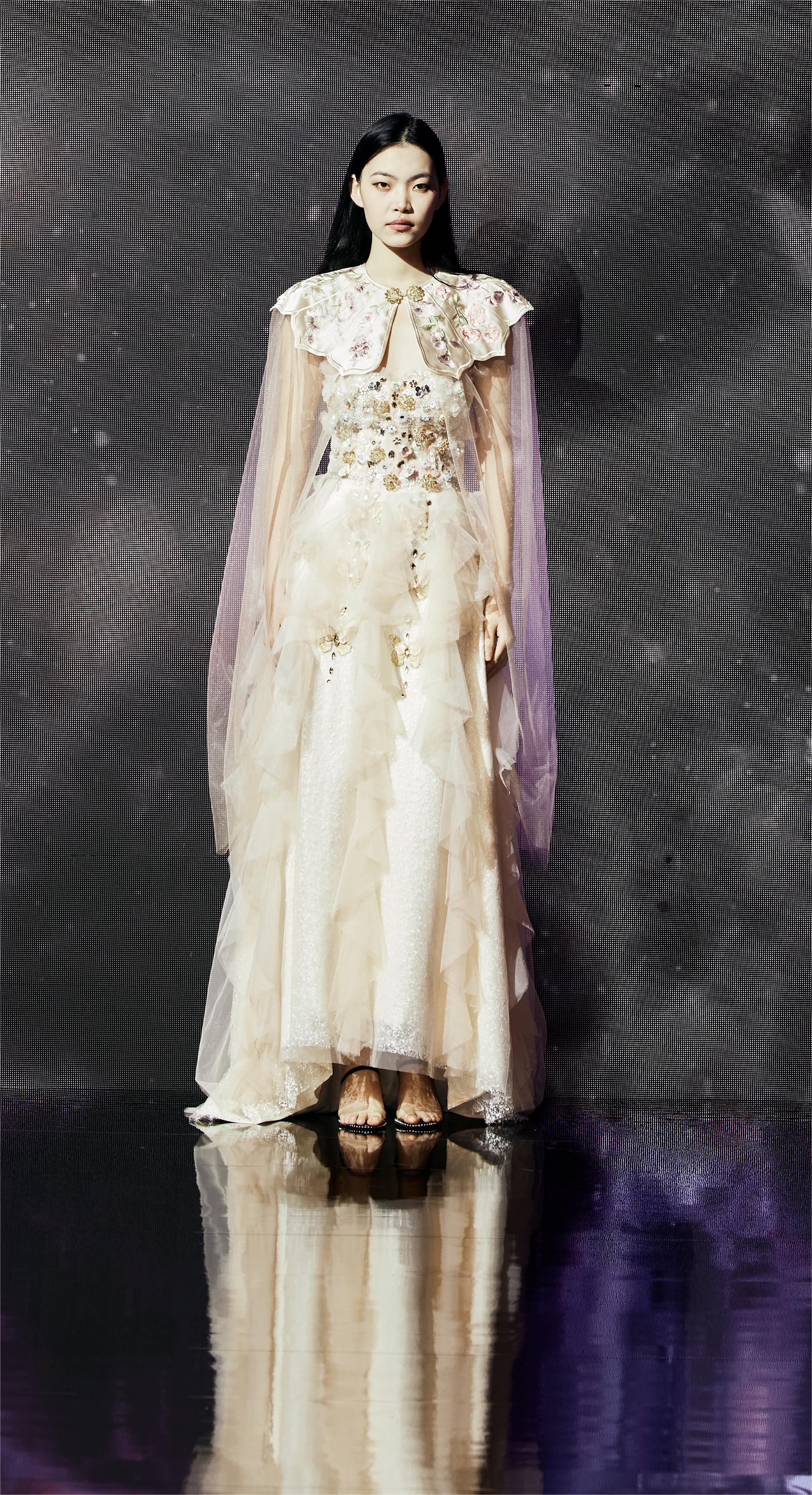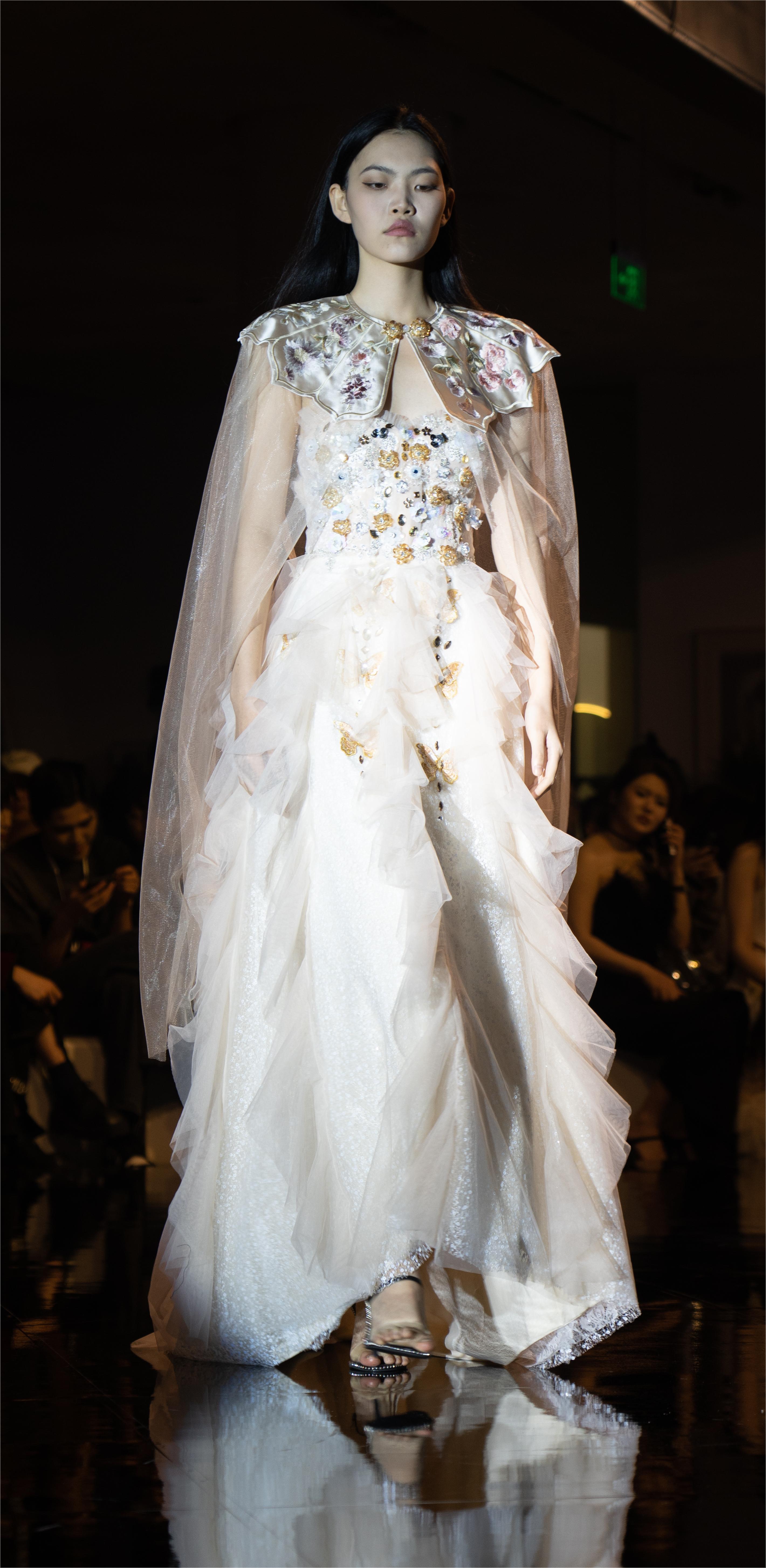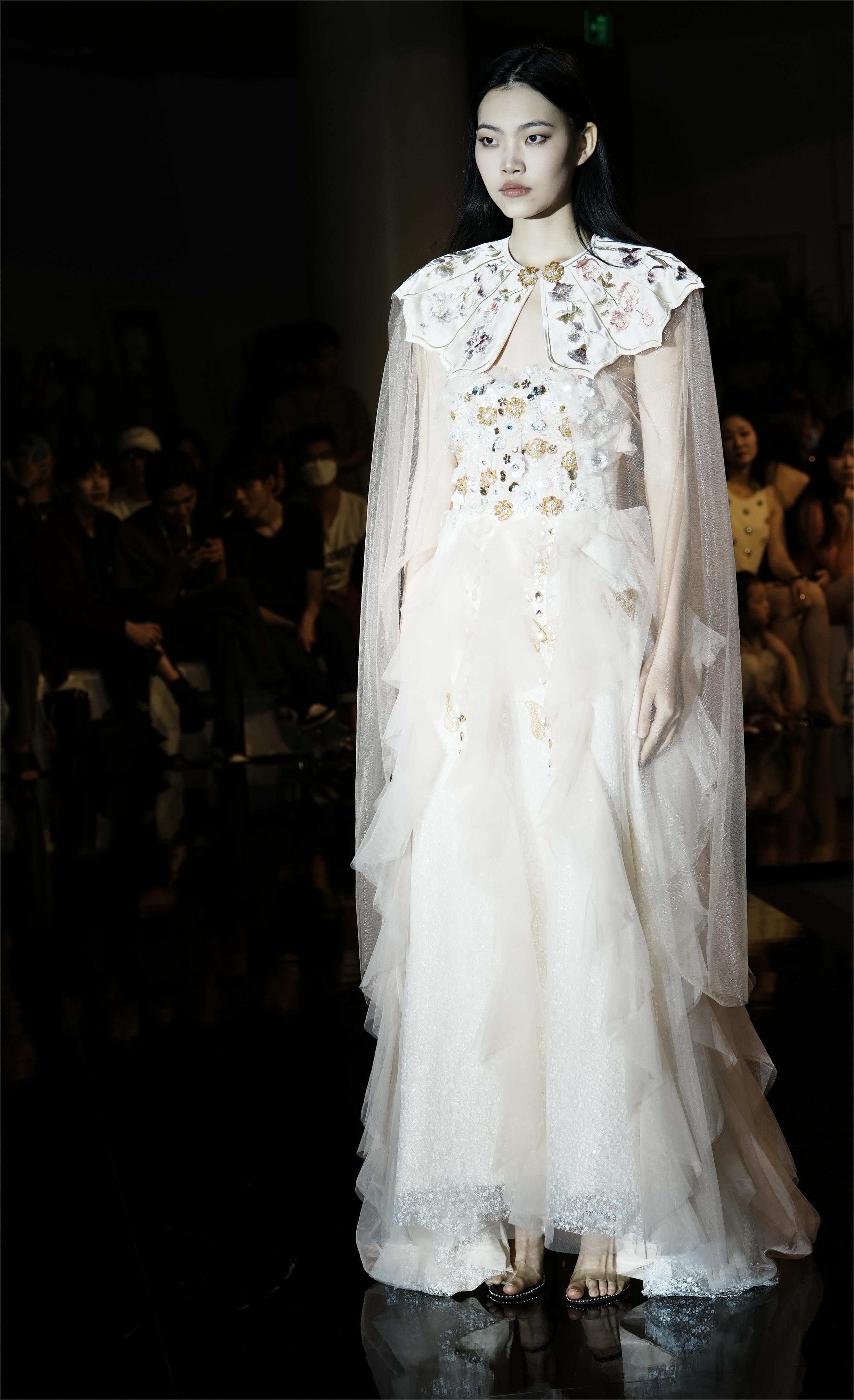 This design takes butterflies and flowers as the primary visual elements, aesthetically echoing the cultural connotation of the Chinese fable — Chuang-Tzu's Butterfly Dream. The dress is exquisitely crafted with lightweight sheer fabric, creating a dreamy and ethereal vibe to the overall look. The lower hem of the dress resembles butterfly wings, adorned with white spots to echo the patterns found on butterfly wings. These vivid details add a captivating allure to the overall design. Skillfully embellished with beads and sequins, the sheer fabric comes alive with shimmering brilliance as the wearer moves, creating an enchanting illusion of butterflies fluttering around the body. This adds a touch of agility and charm to the imagery of Chuang Tzu's Butterfly Dream, accentuating the wearer's dynamic beauty. Additionally, the butterflies and flowers are meticulously crafted using the unique techniques of Chinese embroidery and hand beadwork, standing as a testament to the designers' commitment to the elegant yet intricate Chinese craftsmanship.