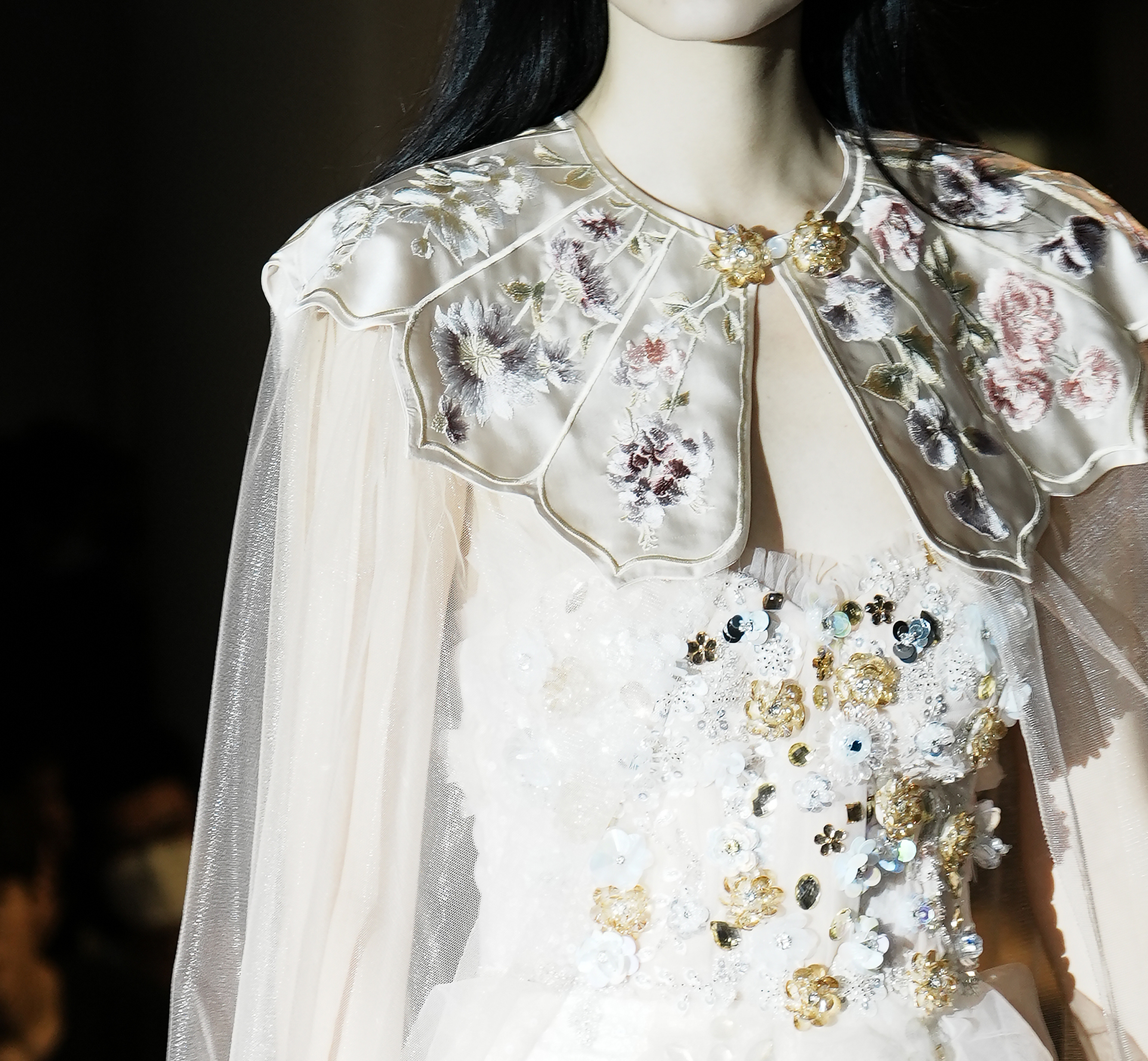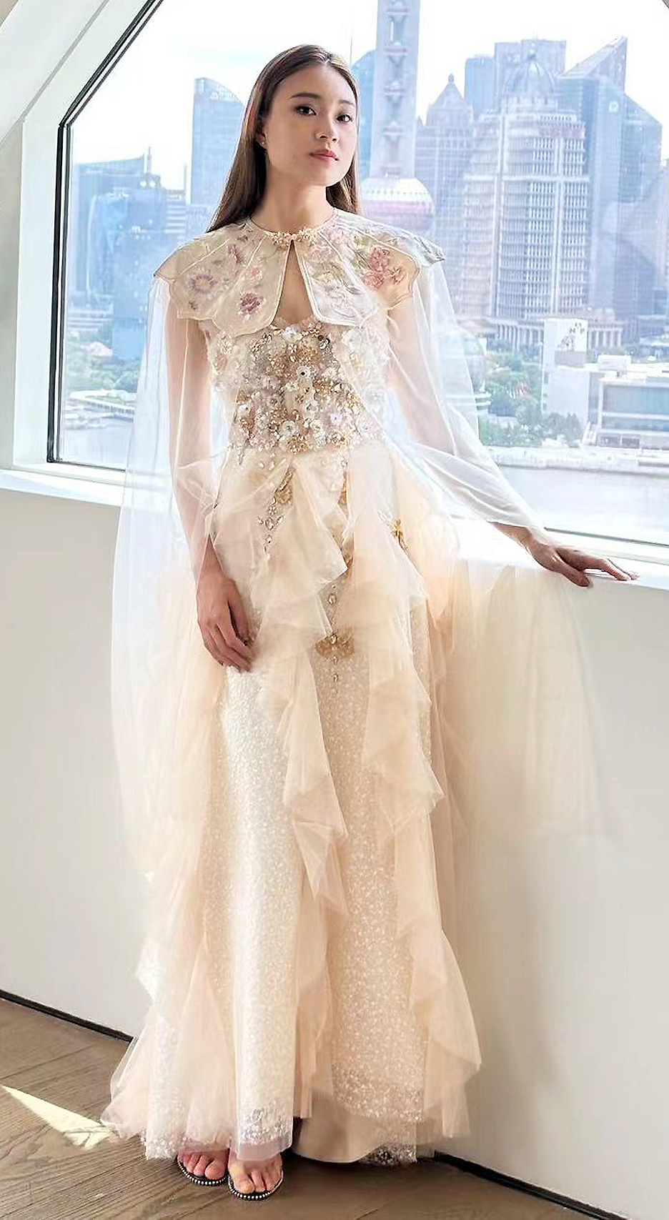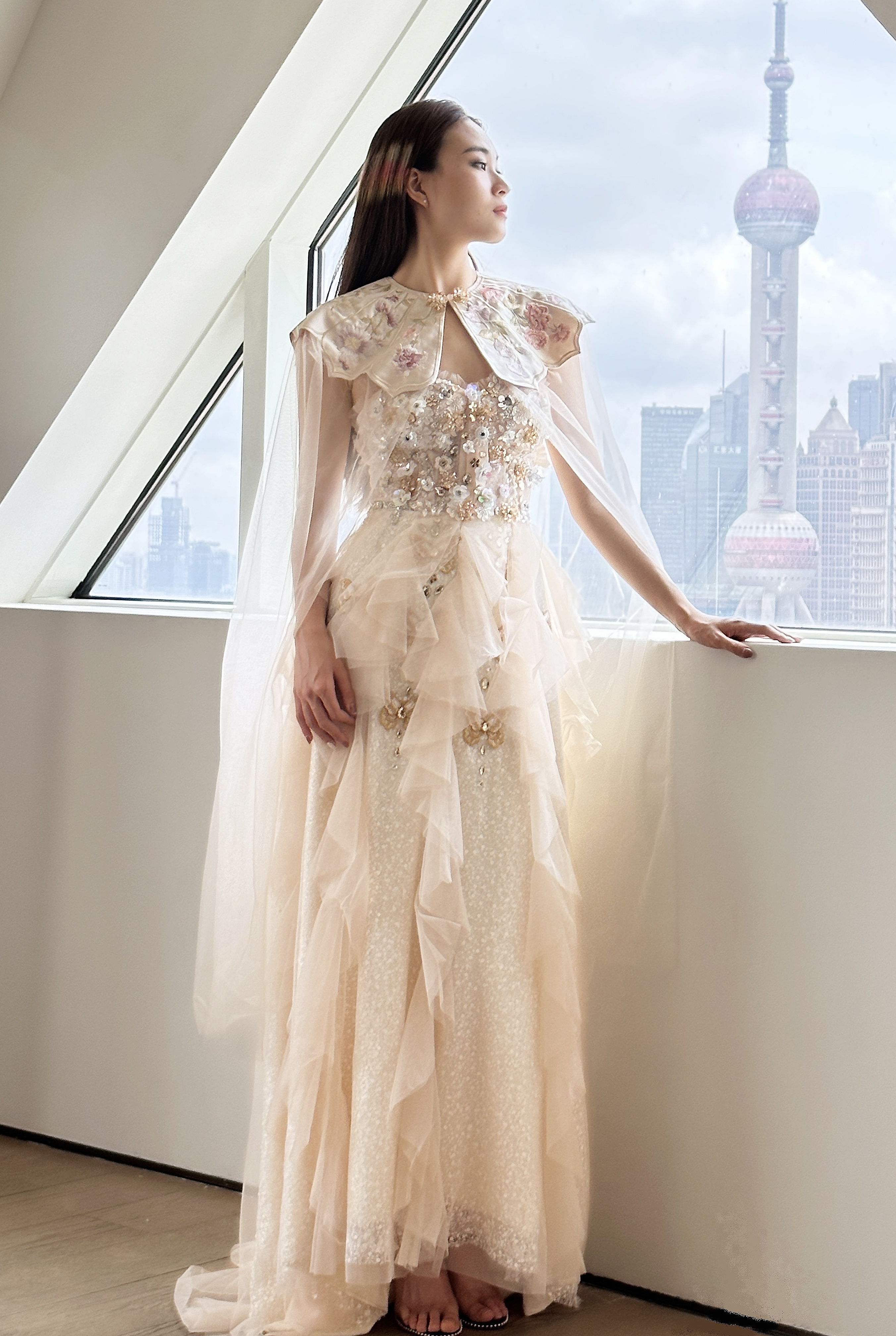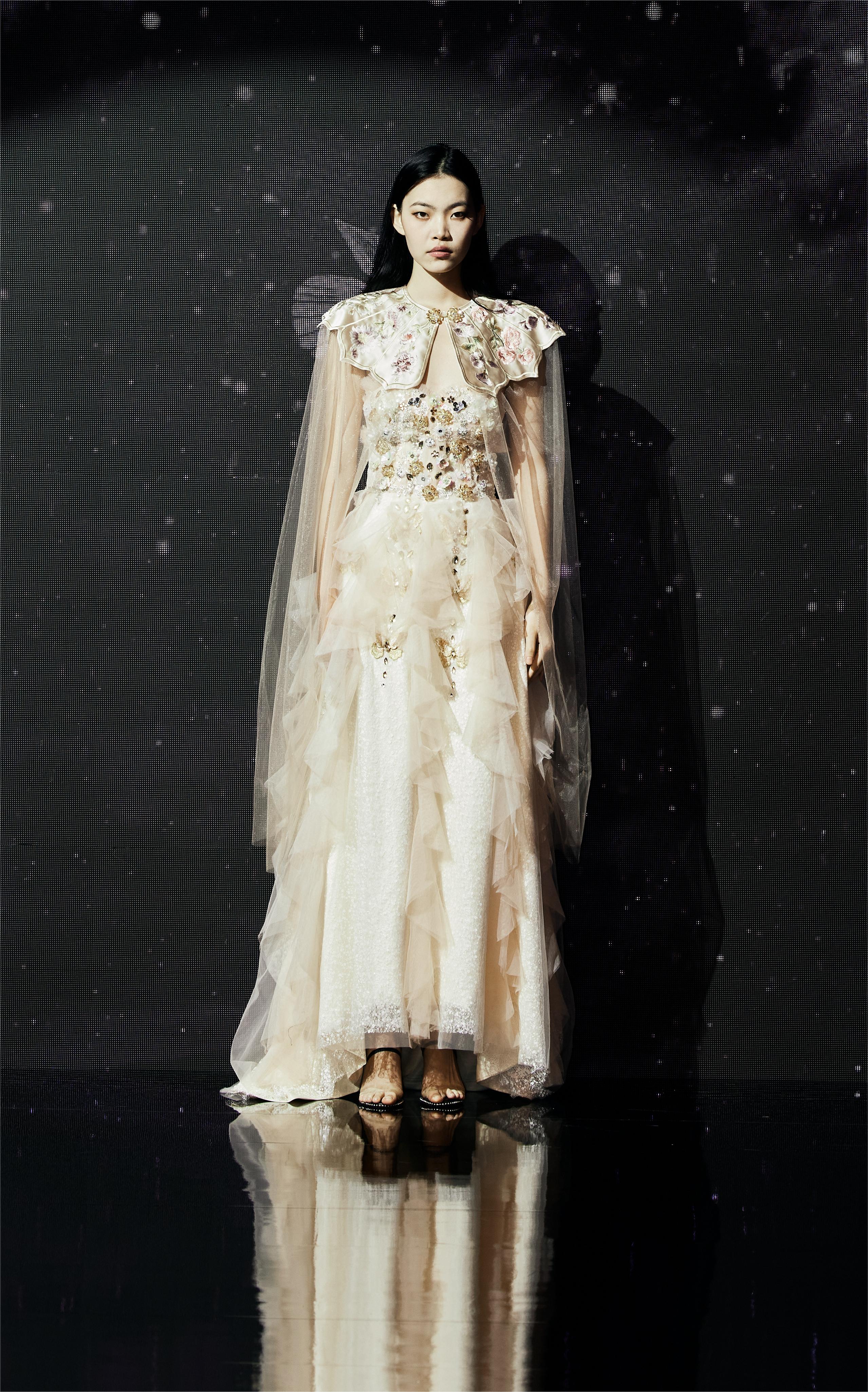 This design takes butterflies and flowers as the primary visual elements, aesthetically echoing the cultural connotation of the Chinese fable — Chuang-Tzu's Butterfly Dream. The dress is exquisitely crafted with lightweight sheer fabric, creating a dreamy and ethereal vibe to the overall look. The lower hem of the dress resembles butterfly wings, adorned with white spots to echo the patterns found on butterfly wings. These vivid details add a captivating allure to the overall design. Skillfully embellished with beads and sequins, the sheer fabric comes alive with shimmering brilliance as the wearer moves, creating an enchanting illusion of butterflies fluttering around the body. This adds a touch of agility and charm to the imagery of Chuang Tzu's Butterfly Dream, accentuating the wearer's dynamic beauty. Additionally, the butterflies and flowers are meticulously crafted using the unique techniques of Chinese embroidery and hand beadwork, standing as a testament to the designers' commitment to the elegant yet intricate Chinese craftsmanship.