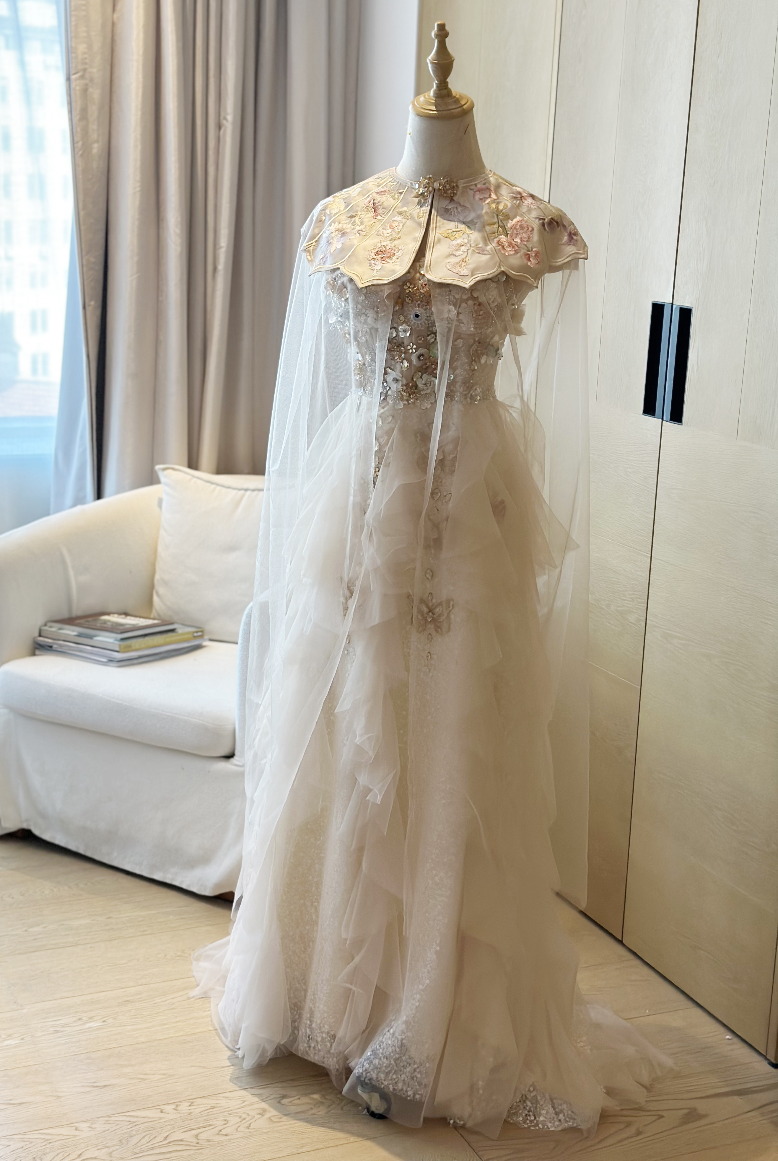 This formal dress aims to blend traditional Chinese elements with modern fashion. With inspiration from the Chinese fable — Chuang Tzu's Dream of the Butterfly, this dress design serves as a bridge in delving into the intricate relationship between reality and illusion, while embodying the harmonious connection between humans and nature. It seamlessly blends Chinese aesthetics with traditional craftsmanship, and harnesses the skillful arrangement of diverse elements, effortlessly bringing to life the surreal imagery portrayed in Chinese paintings. Not only does this design approach showcase the subtle Chinese romance to the world, but it also unlocks a realm of boundless aesthetic imagination. With its distinctive design style, this dress artfully embodies the essence of traditional Chinese culture. Whether on the runway or at social events, it may captivate onlookers, offering a visual spectacle to the fashion world, igniting their curiosity for Chinese culture and, and ultimately, elevating the influence of Chinese culture in the long run.