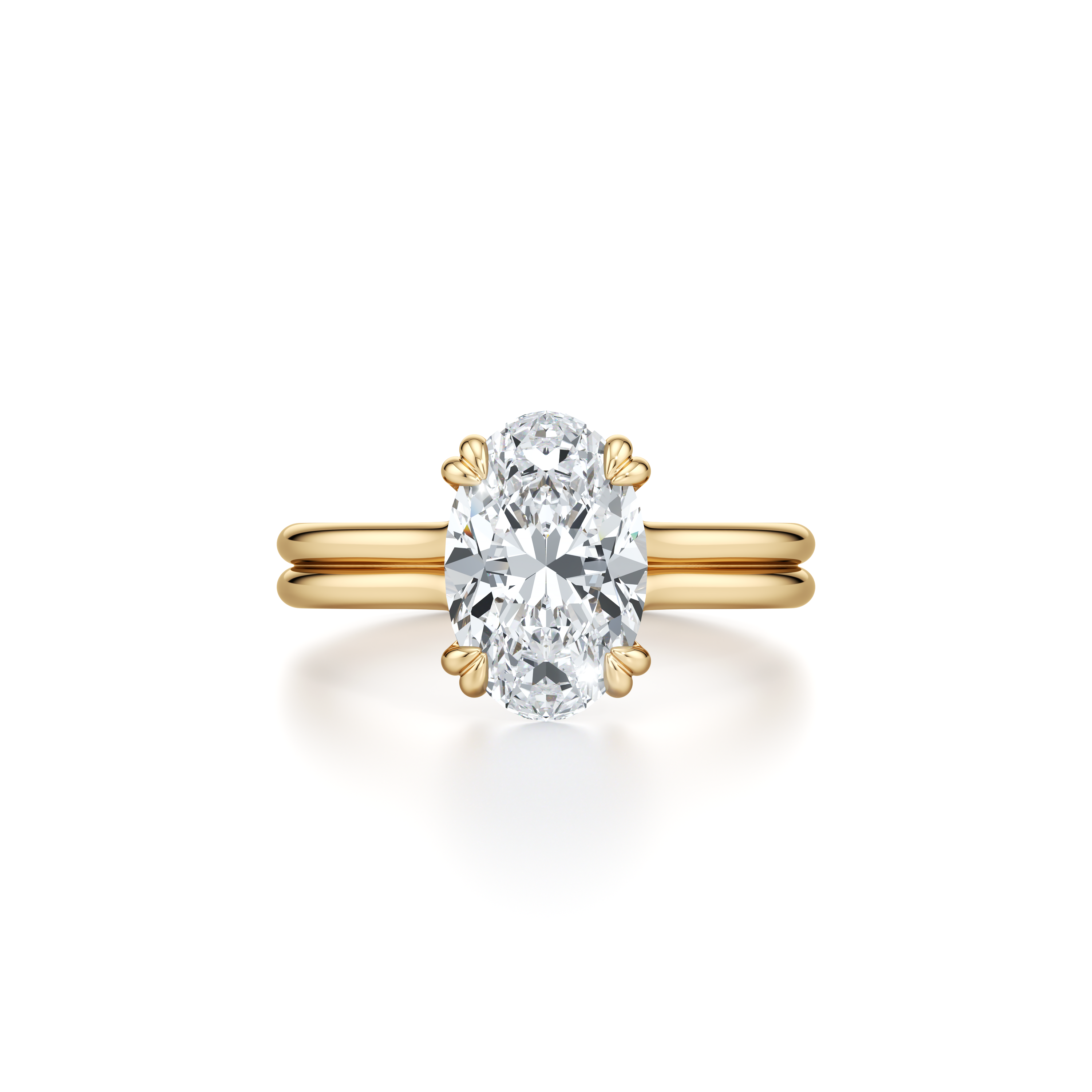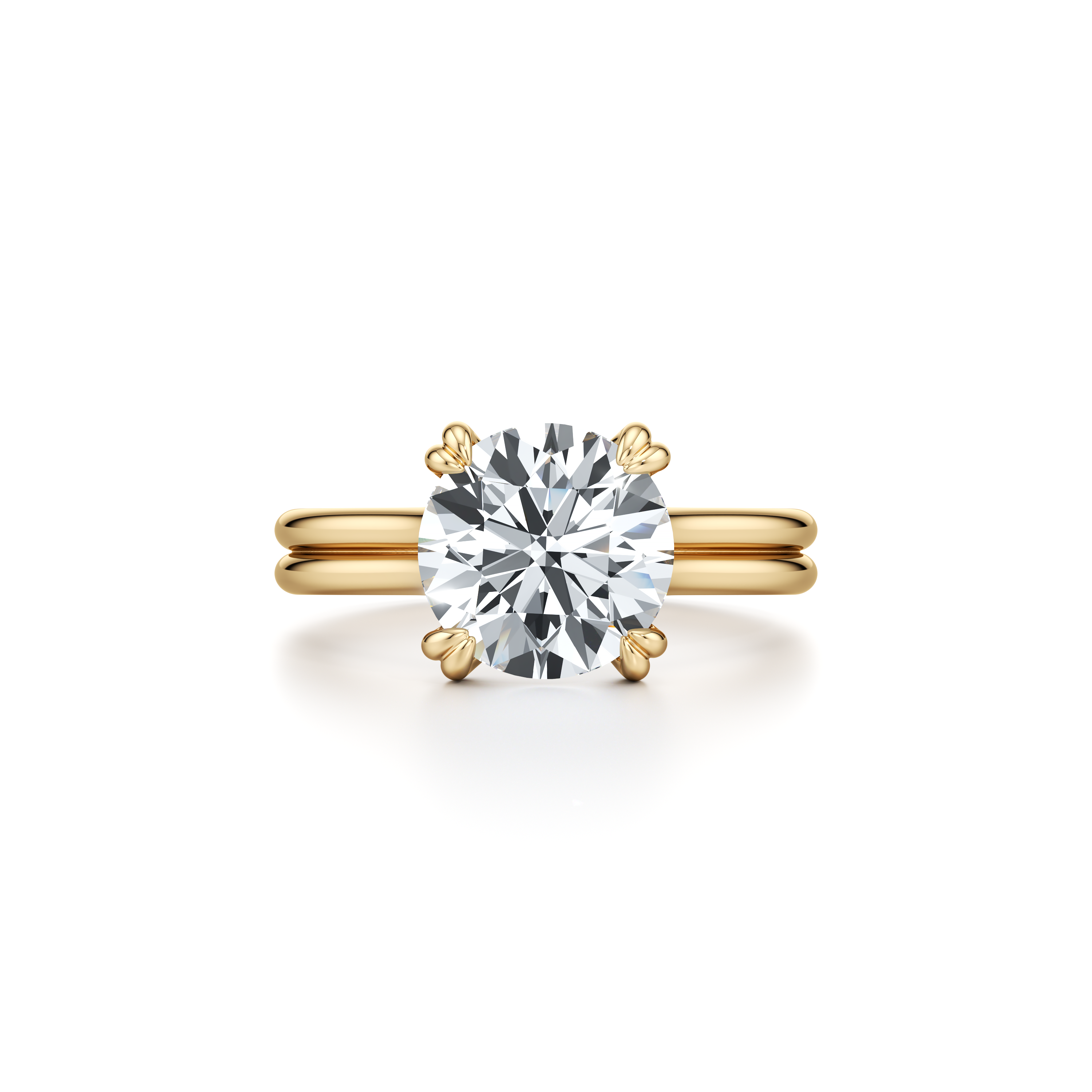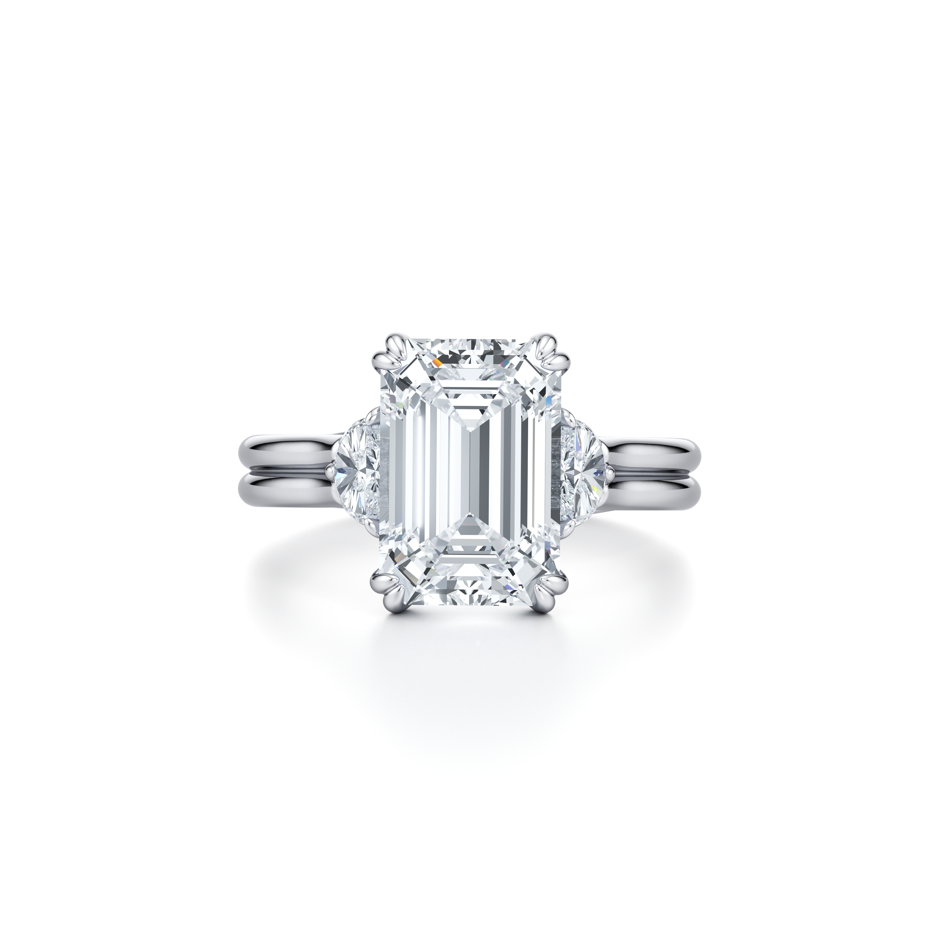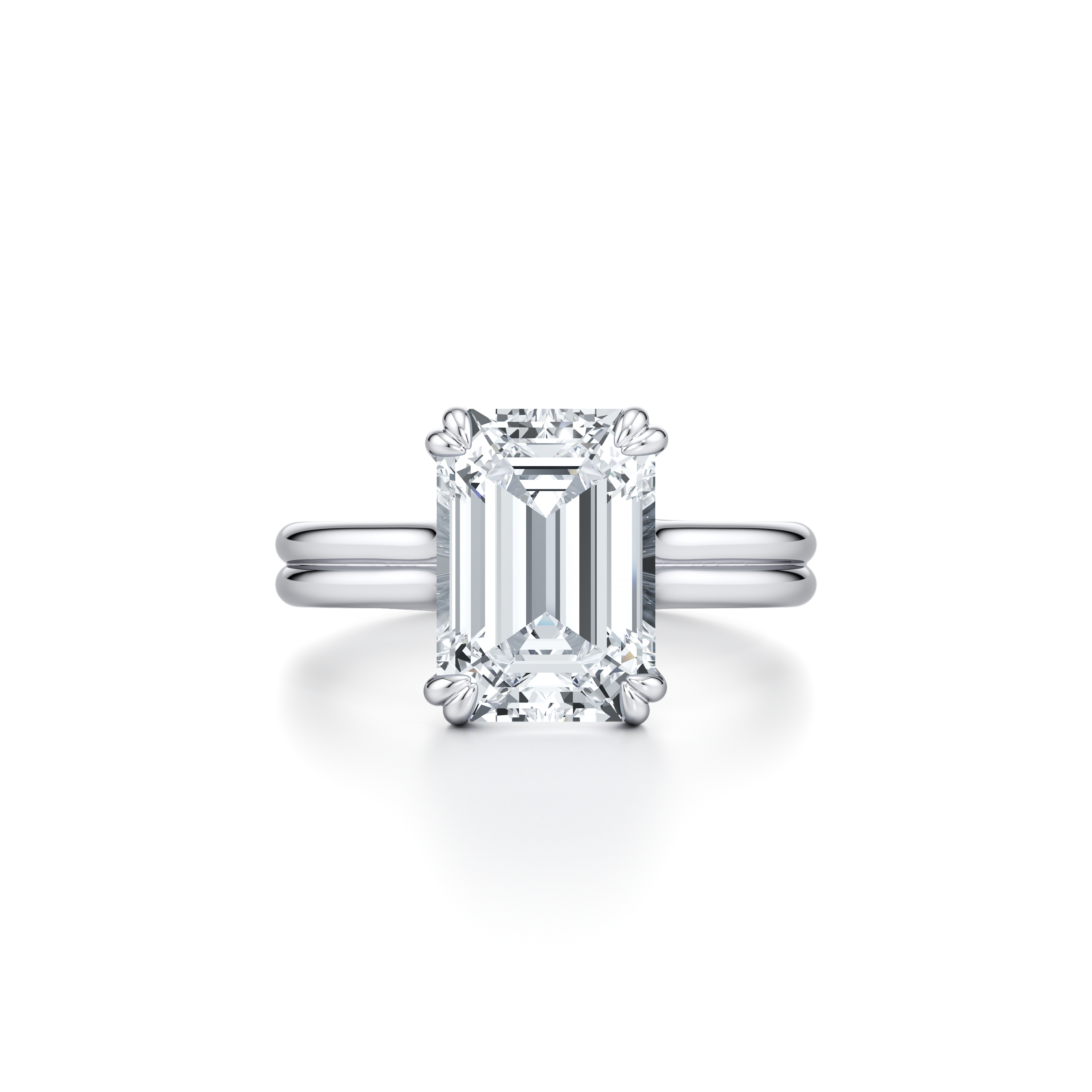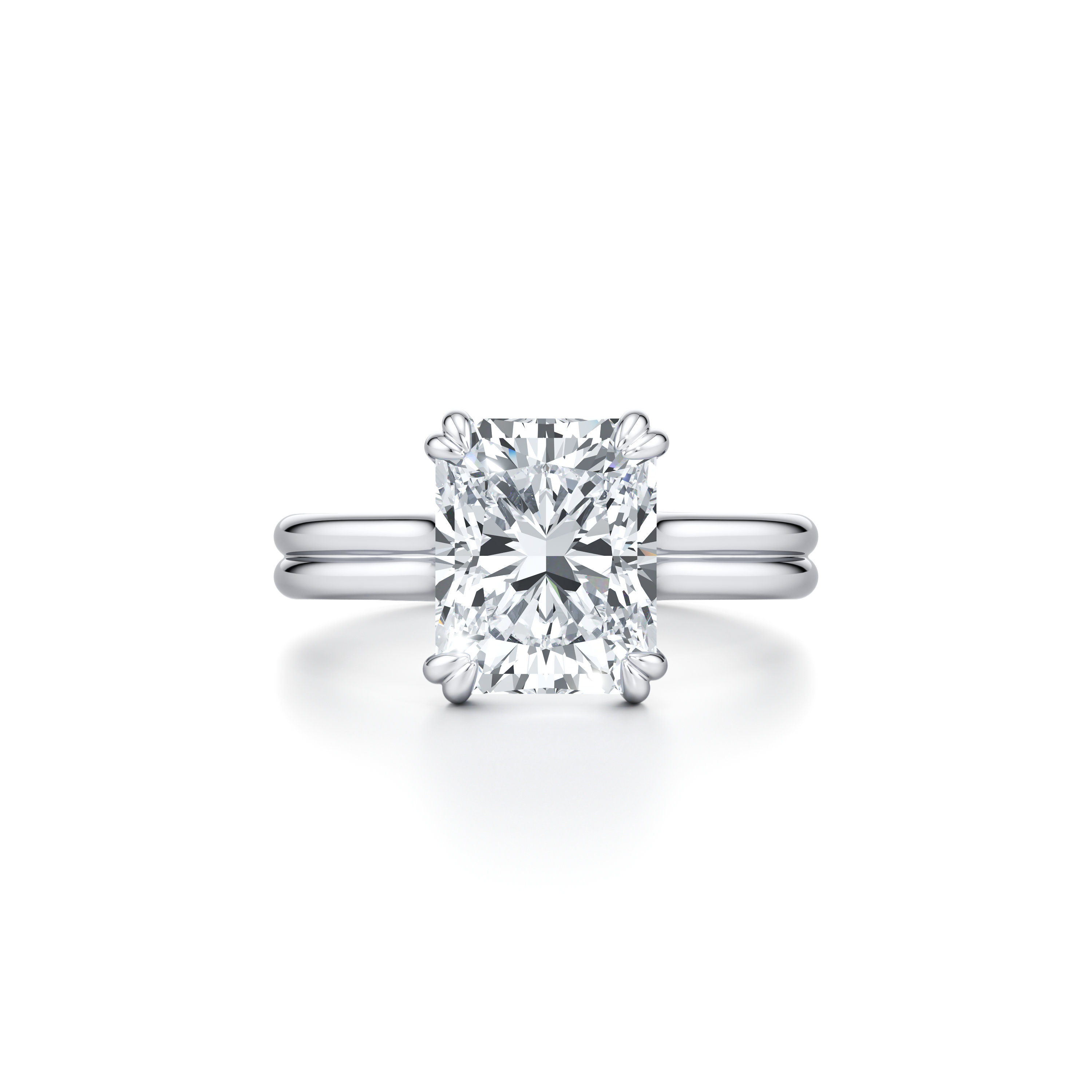 With its distinctive double-prong settings in a high-polished finish with a single or double band, this break-through design offers unobstructed views of the center diamond from every angle, a rarity in bridal jewelry and a first for Jean himself.