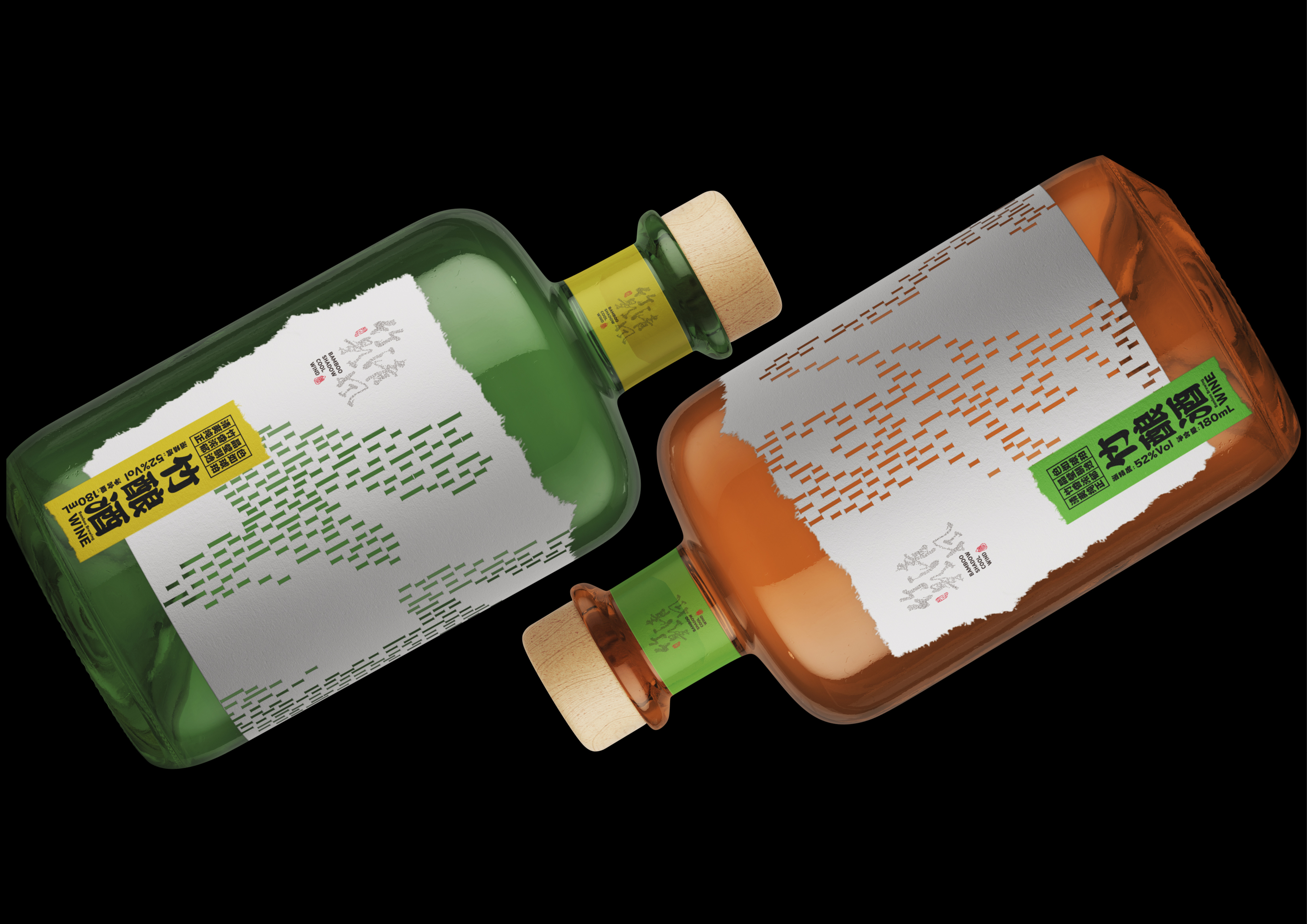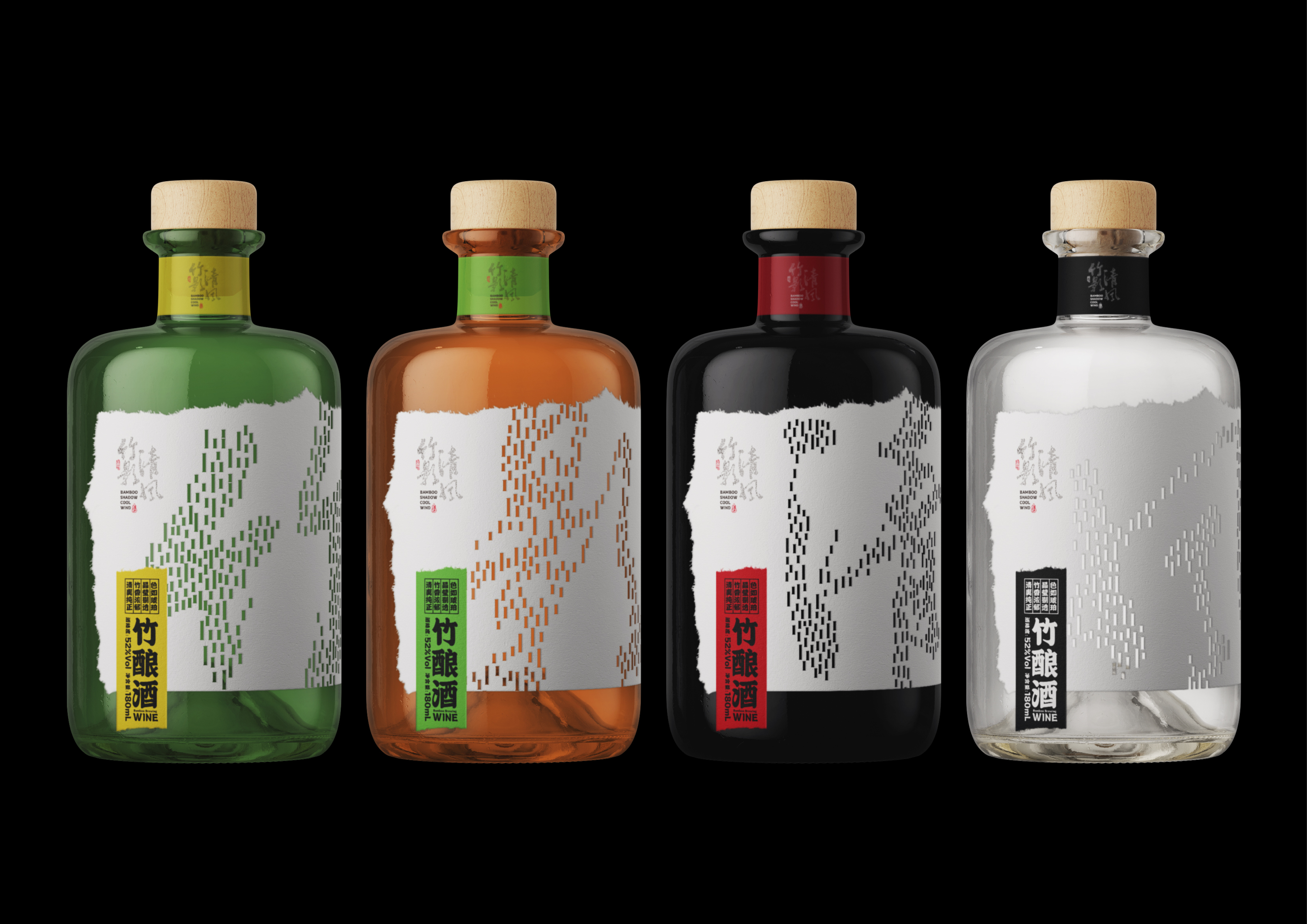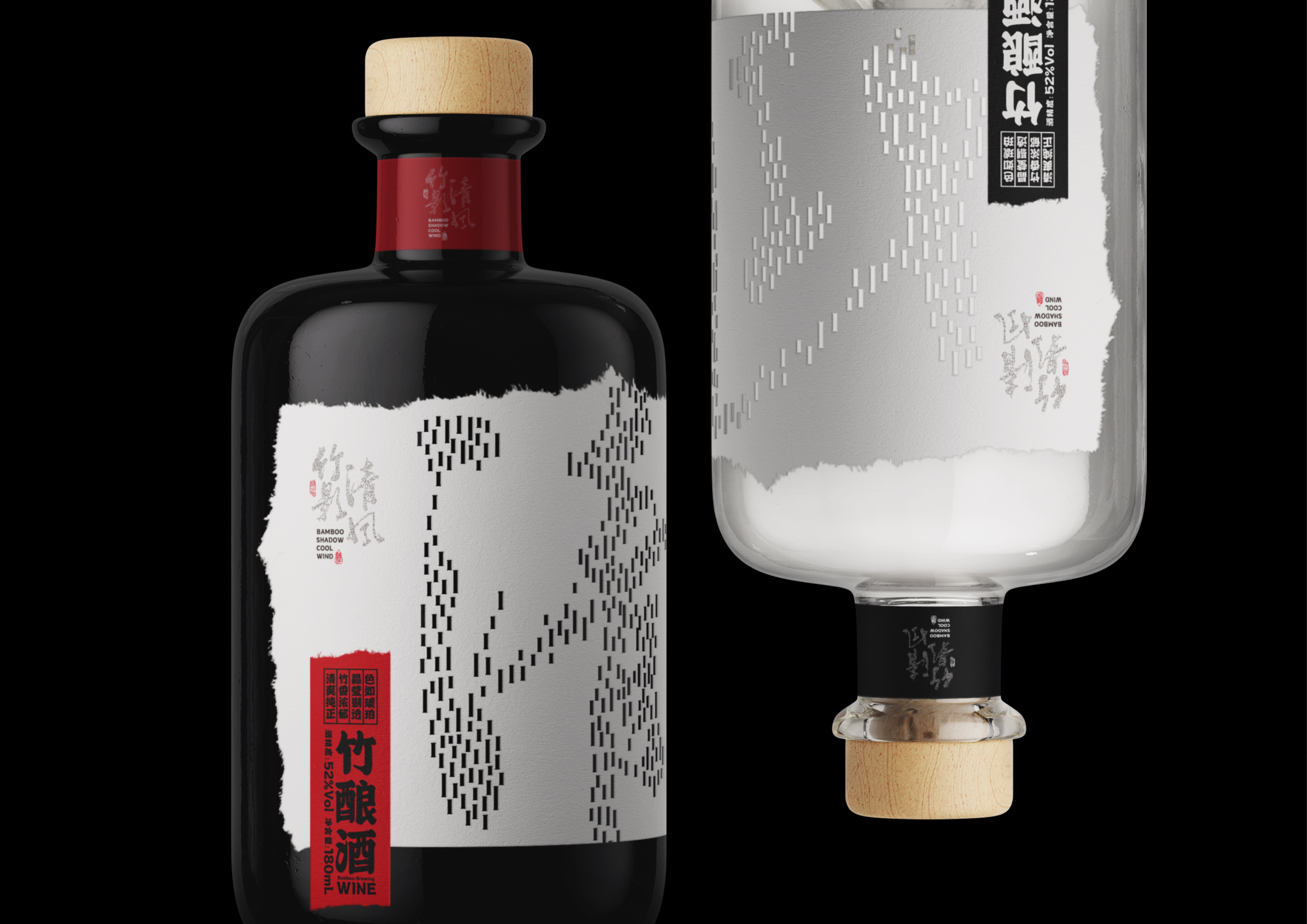 The brand word "Bamboo Shadow Cool Wind" is spliced through the form of bamboo, better reflecting the bamboo-based brand tone of "Bamboo Shadow Wind". The hollowing process on the bottle sticker and the hand torn bottle sticker imply that this product is purely natural, purely handmade, pollution-free and purely natural winemaking. It makes consumers' eyes bright, thus generating curiosity and purchasing power.