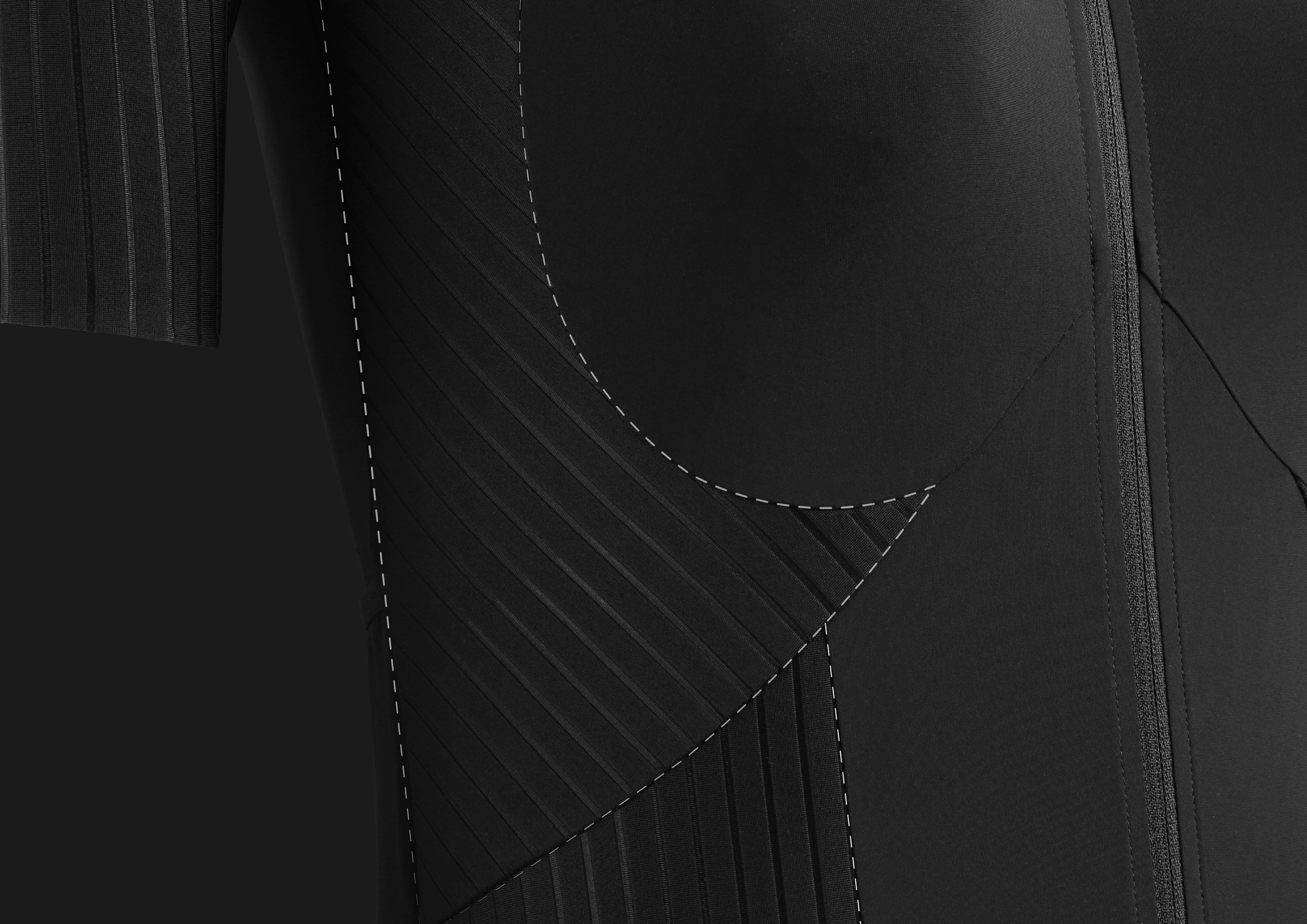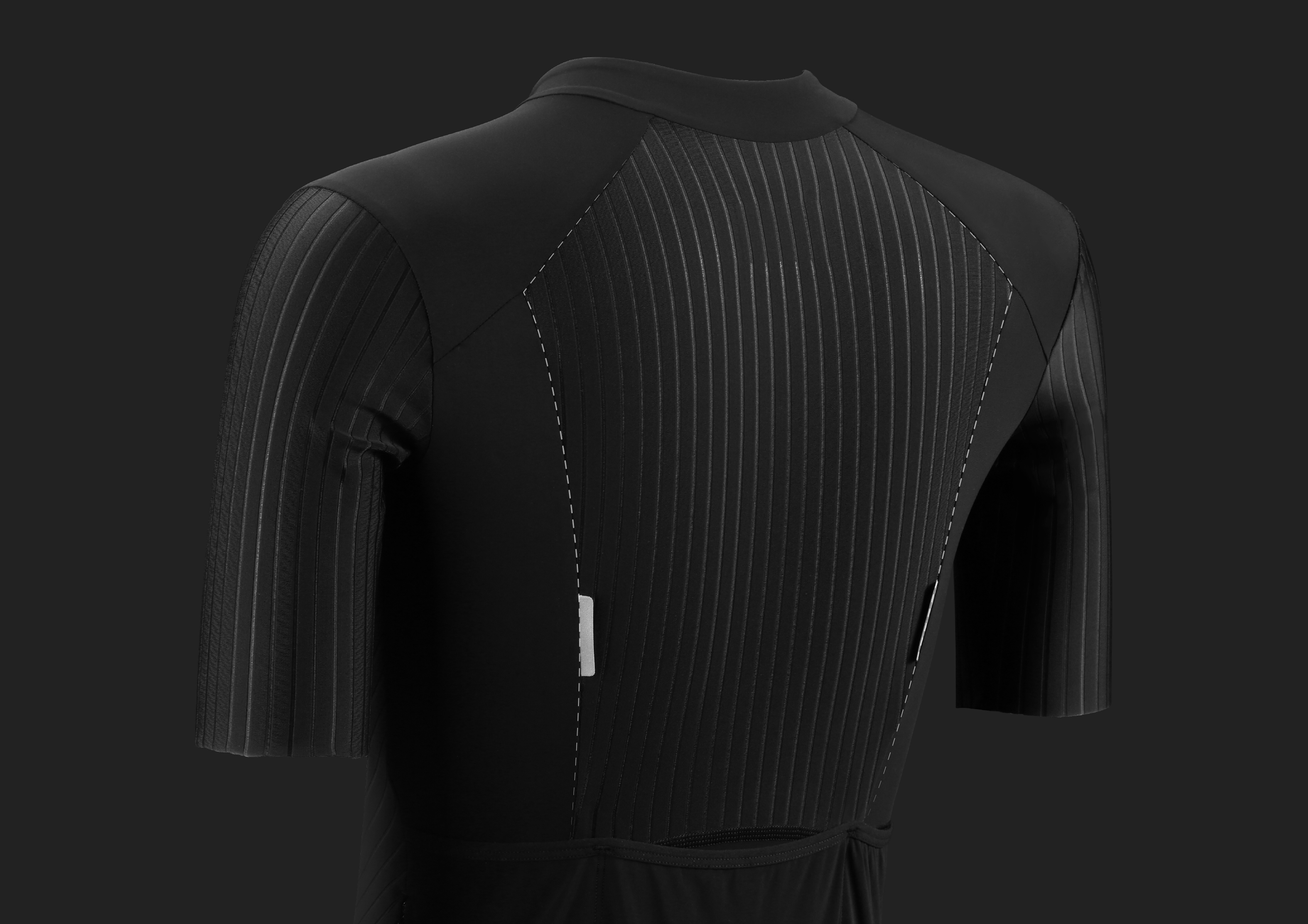 The product is designed with aerodynamics as the priority. The application of aero-striped technical fabric can dissipate air and create the optimal aerodynamic surface, to minimize drag; the 4D tailored fitted shoulder and neckline further decreases drag. The inverted trapezoid panel in the back area and the oblique cut in the underarm area facilitate perspiration, whose combination with the moisture-wicking quick-drying fabric effectively keeps users refreshed and comfortable during cycling. The smart zoning of the fabric provides sufficient compression for different muscle groups to prevent muscle fatigue and minimize lactic acid buildup to shorten recovery time after exercise.