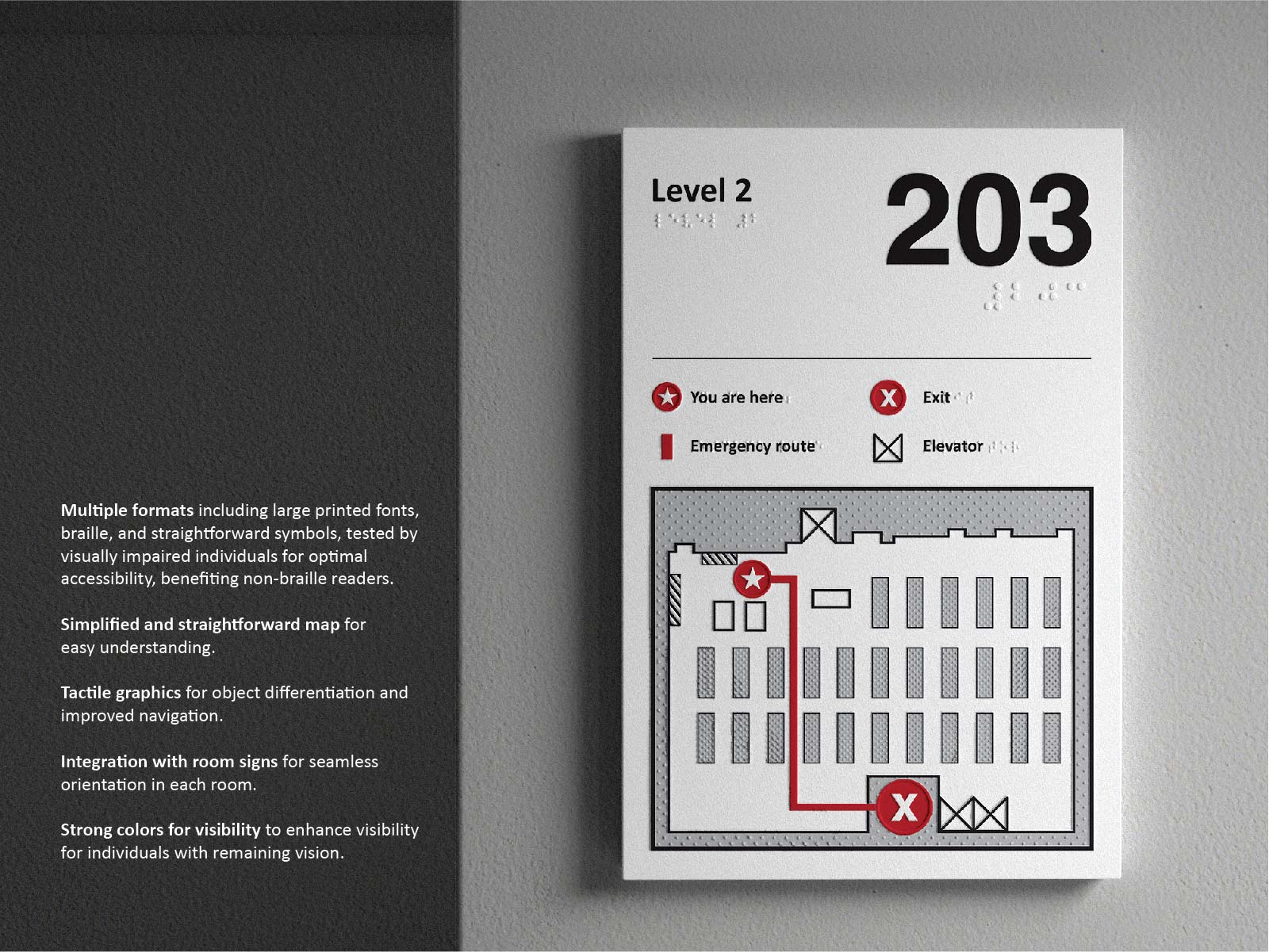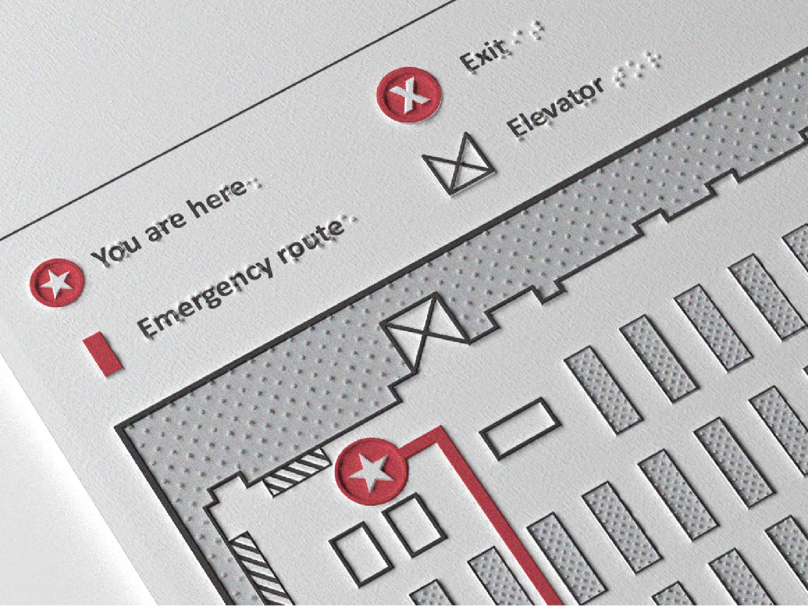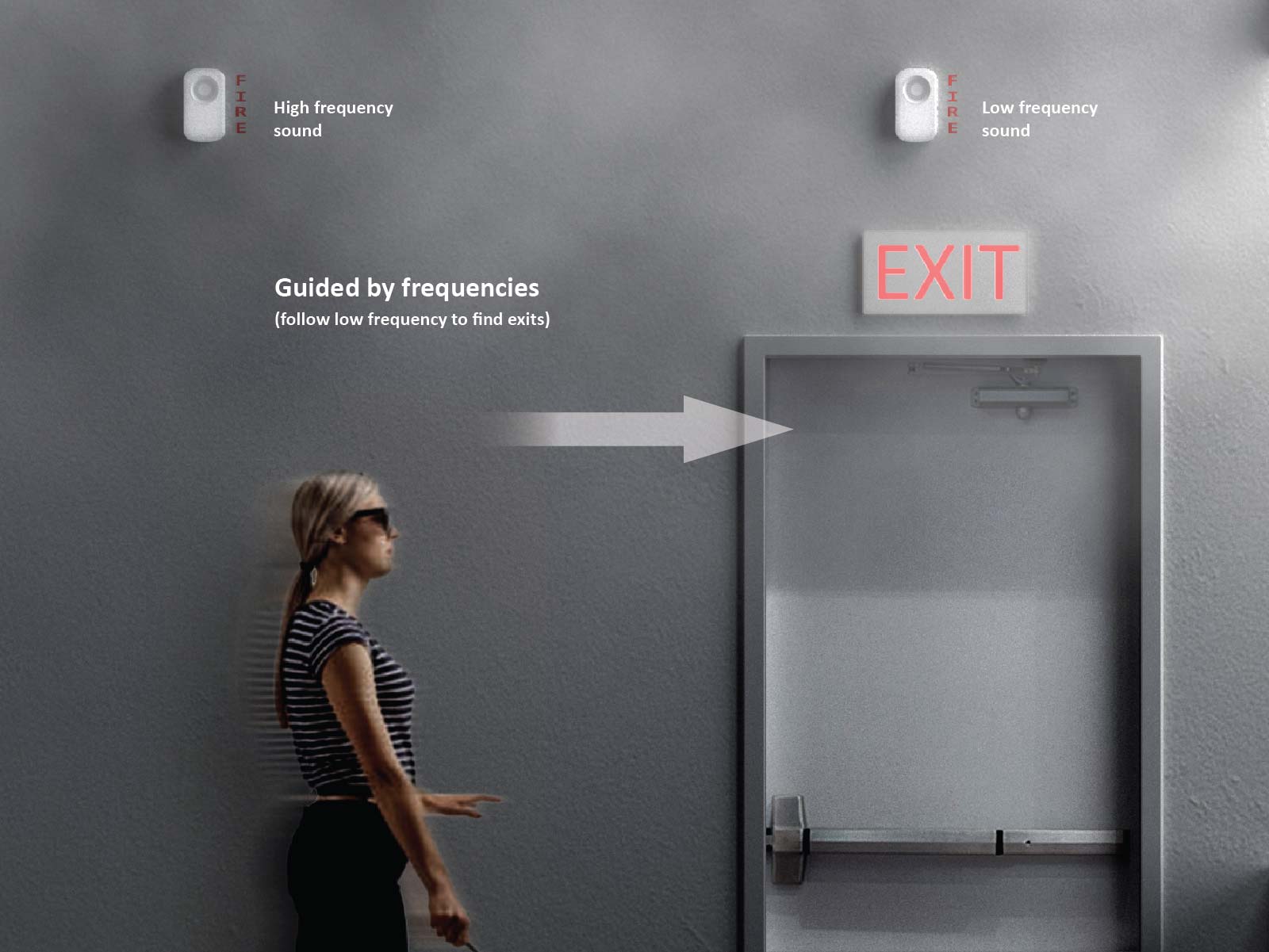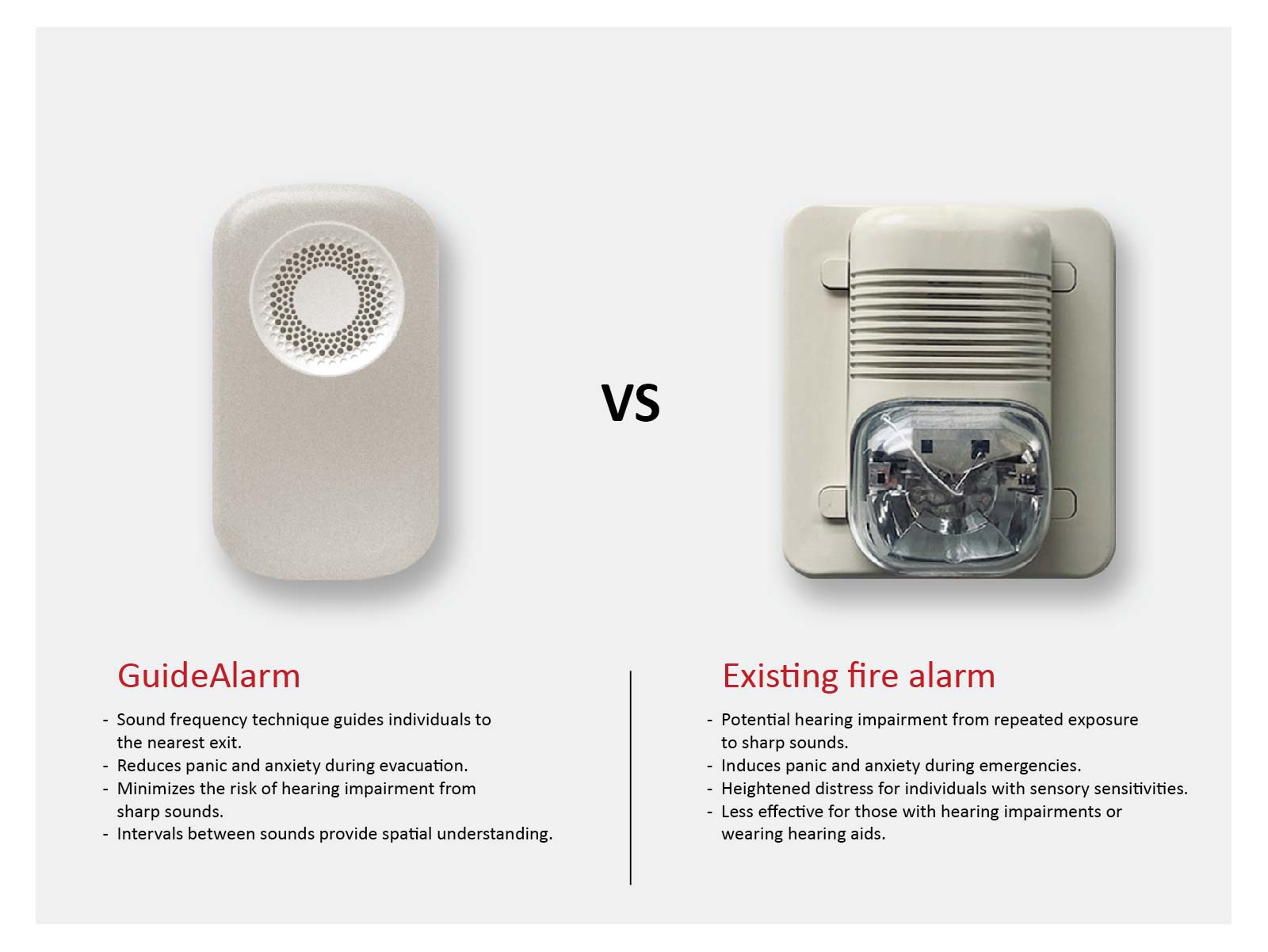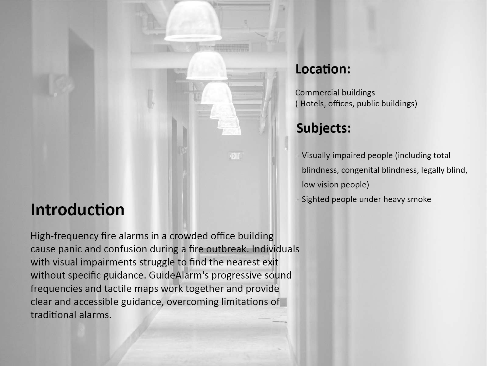 GuideAlarm is an innovative alarm system designed to assist visually impaired individuals during emergencies. It combines sounds and tactile maps to guide people to the nearest exit. By following a sequence of sounds from high to low frequency, individuals can effectively navigate towards safety. The system features tactile maps with easily understandable symbols, eliminating the need for advanced braille skills. By integrating audible alarms and tactile maps, GuideAlarm provides a comprehensive solution that enables visually impaired people to locate exits and evacuate during emergencies.