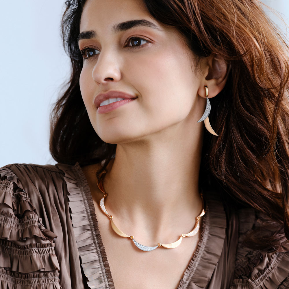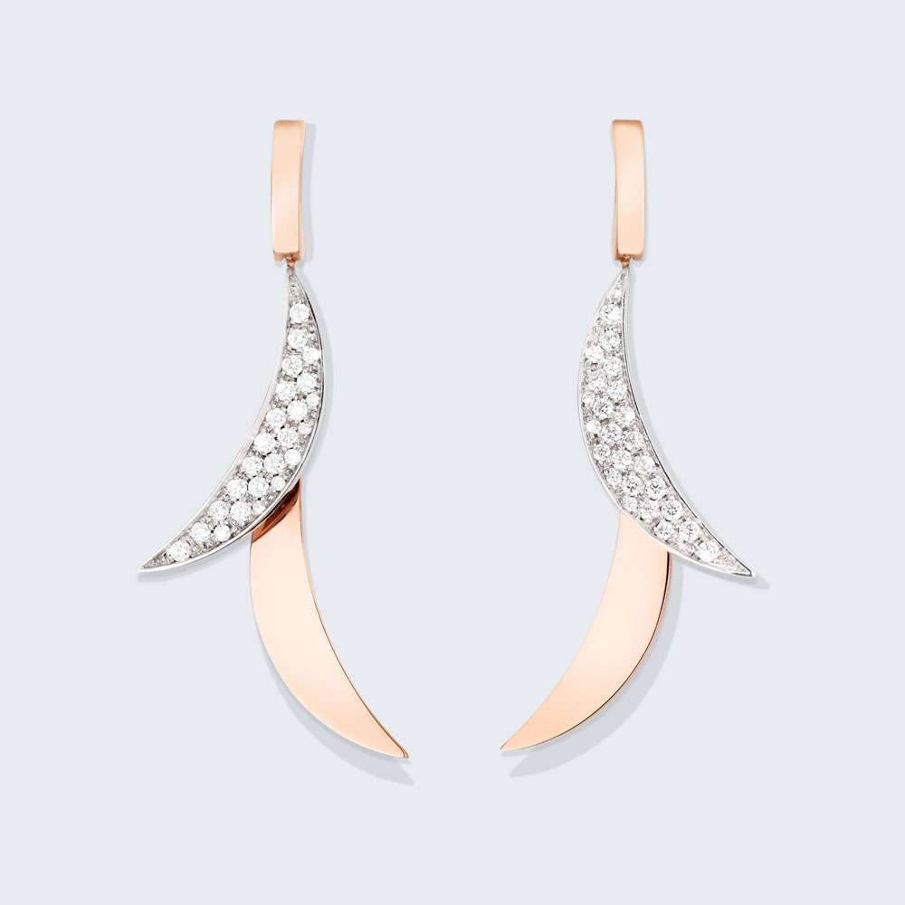 These statement earrings are the flagship of Schullin’s 'Smile' collection. They feature shining 18kt rose gold arches and 18kt white gold arches paved with 48 brilliant-cut diamonds (1.02ct, G/vsi). Elegant ear jewelry that will make you smile.