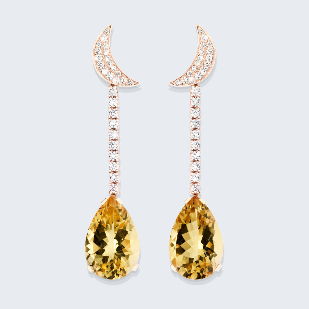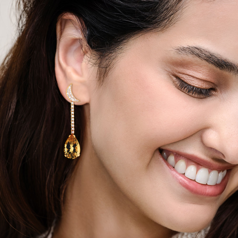 The Citrine Earrings SMILE by Schullin feature a smile paved with diamonds from ear to ear. A total of 54 brilliant-cut diamonds of 1.25ct (G/vsi) and two citrine drops of 22.7ct achieve a sunny radiance.