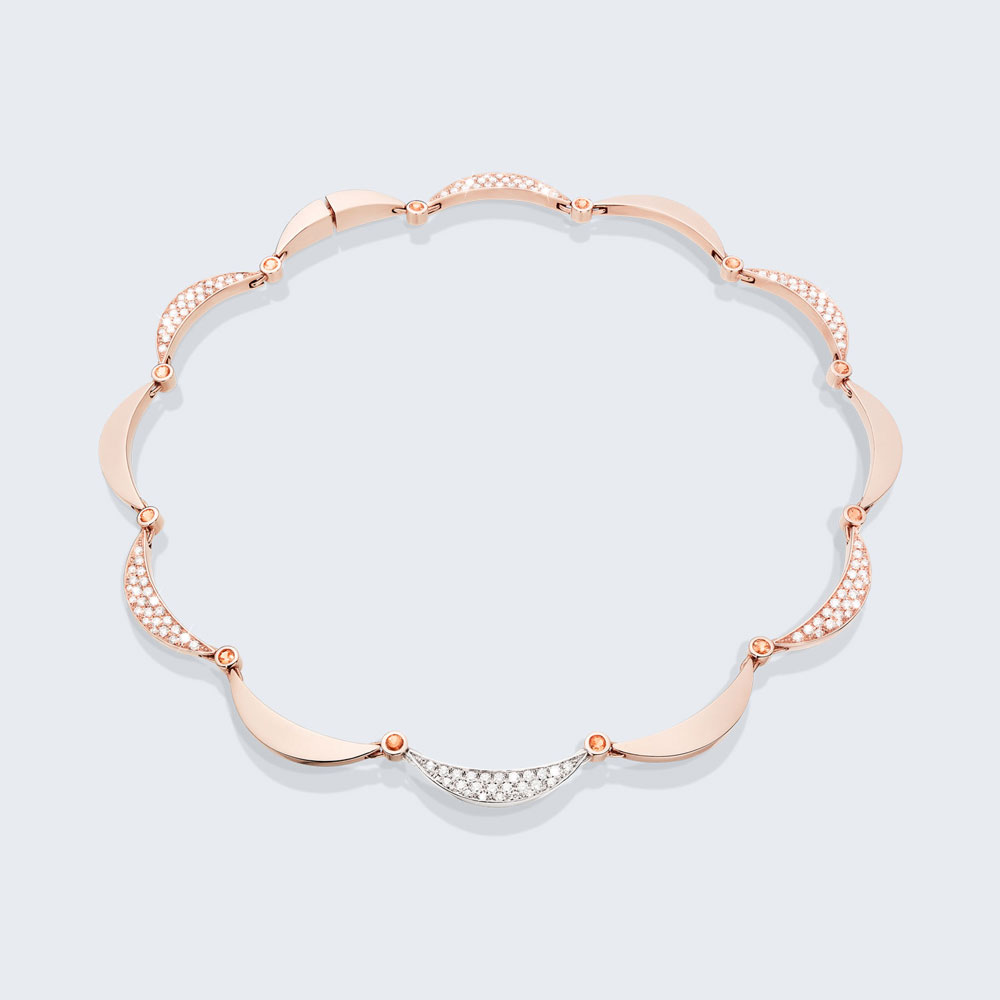 This necklace with diamond-set 18kt rose gold bows is the statement piece of Schullin’s 'Smile' collection. A total of 144 brilliant-cut diamonds of 3.06ct (G/vsi) are paved in every second arch. In the center, the necklace features a diamond-set white gold smile. Twelve orange sapphires of 1.80ct complement the positive aura of this jewelry.