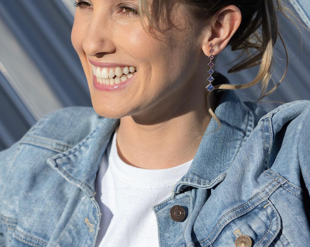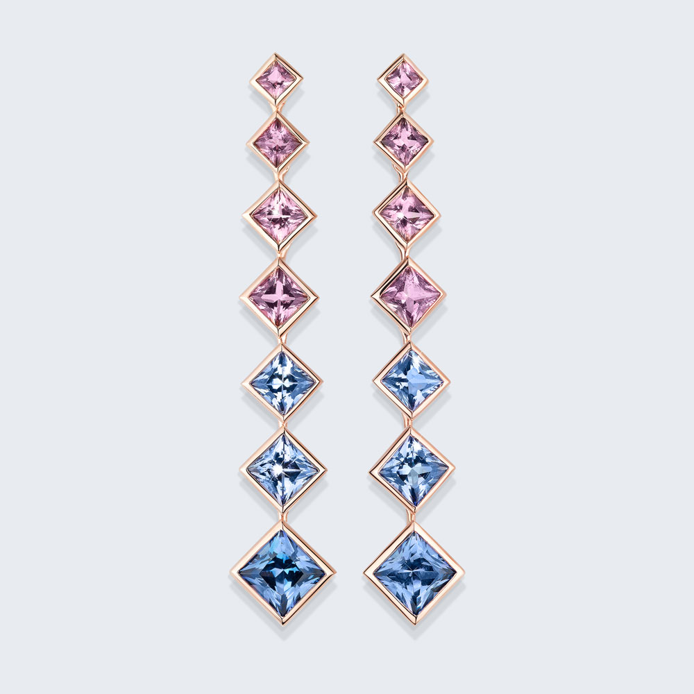 Earrings made of six carré-cut tanzanites (3.47ct ) and eight pink carré-cut tourmalines (1.58ct) set in 18kt rose gold. The movable setting makes the precious gemstones sparkle effectively.