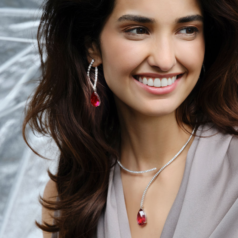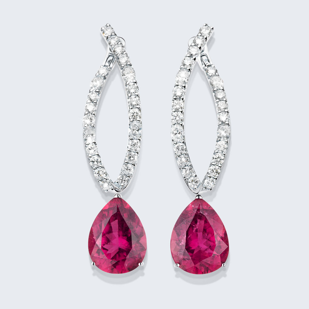 These earrings sparkle irresistibly with 46 diamonds (5.25ct) in various cuts. Eight marquise-cut diamonds and 38 brilliant-cut diamonds are set in 18kt white gold. Two large rubellite drops totaling 30.00ct create an intense color effect.