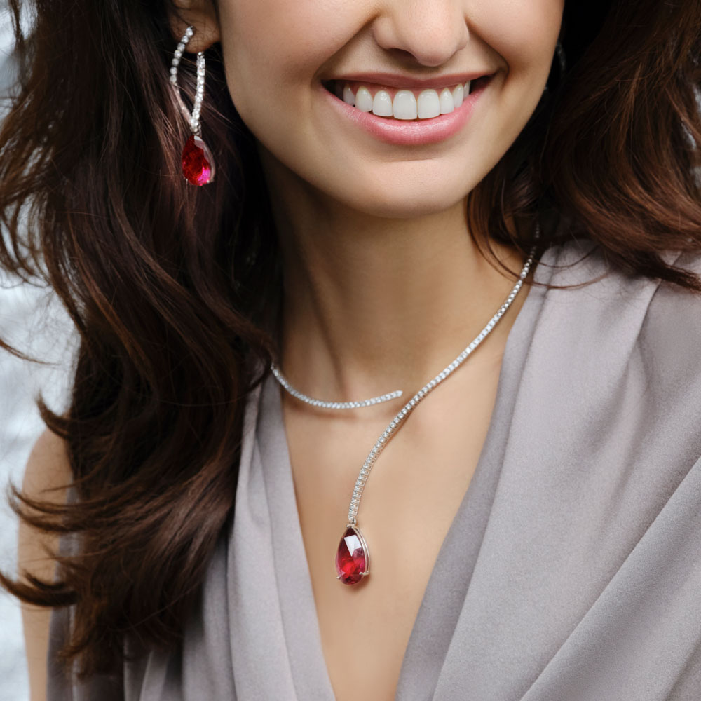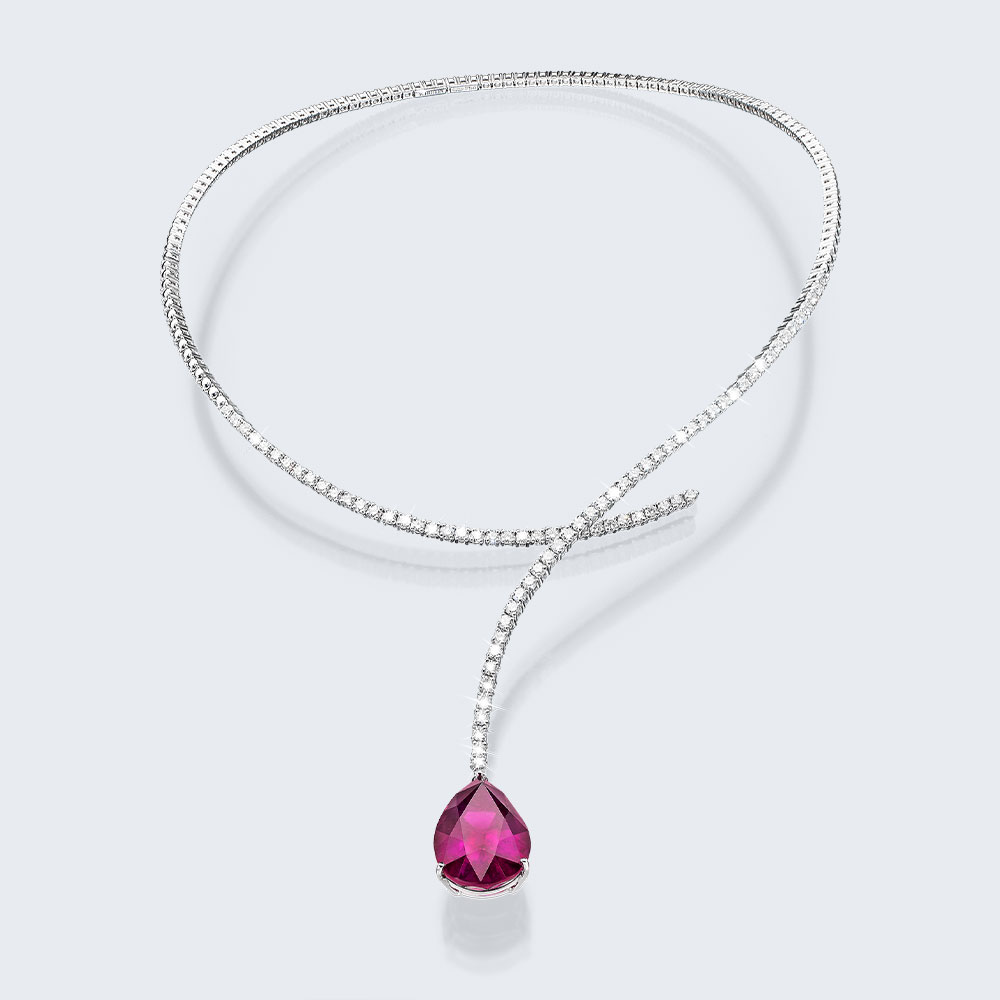 80 brilliant-cut diamonds (2.38ct) set in 18kt white gold create a sparkling line around the neck. The highlight of the chocker is a large rubellite drop of 17.87ct.