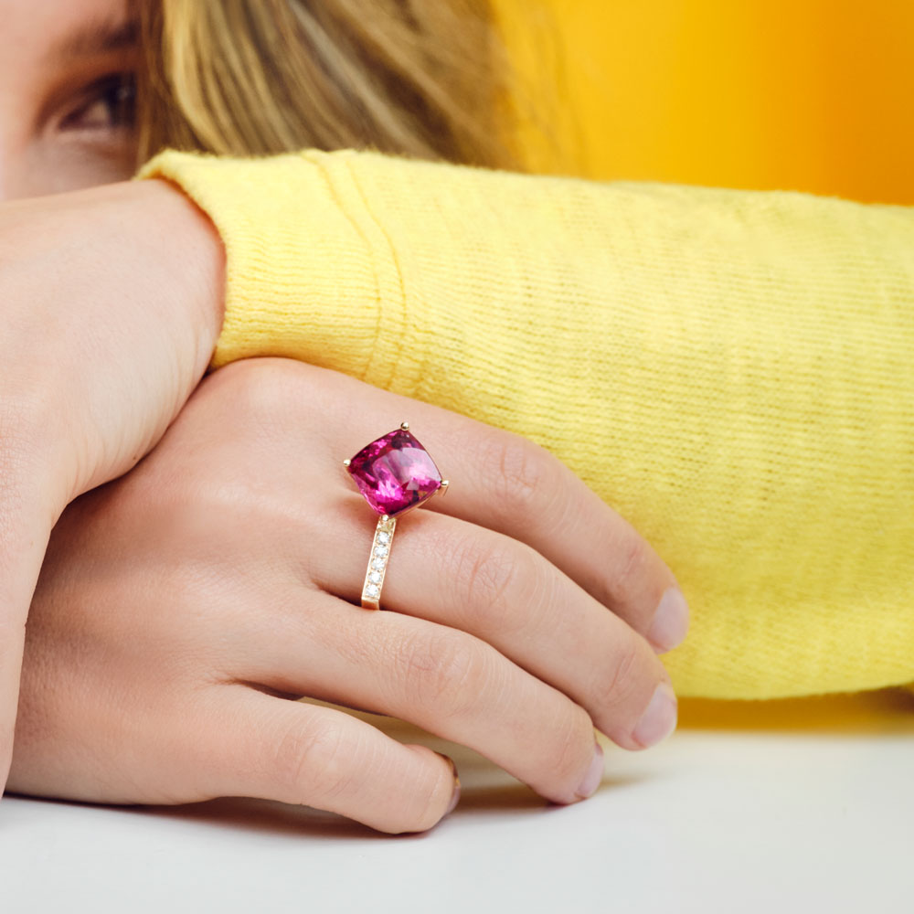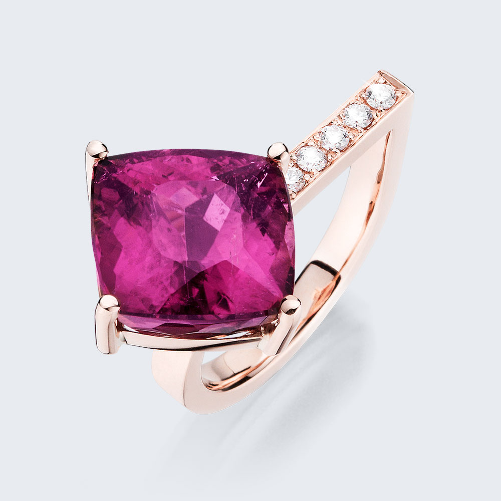 This 18kt rose gold ring features a large cushion-cut rubellite of 10.19ct placed in between two fingers. In this unusual design, the round ring band is contrasted with a diamond-set (0.17ct, G/vsi) bar.