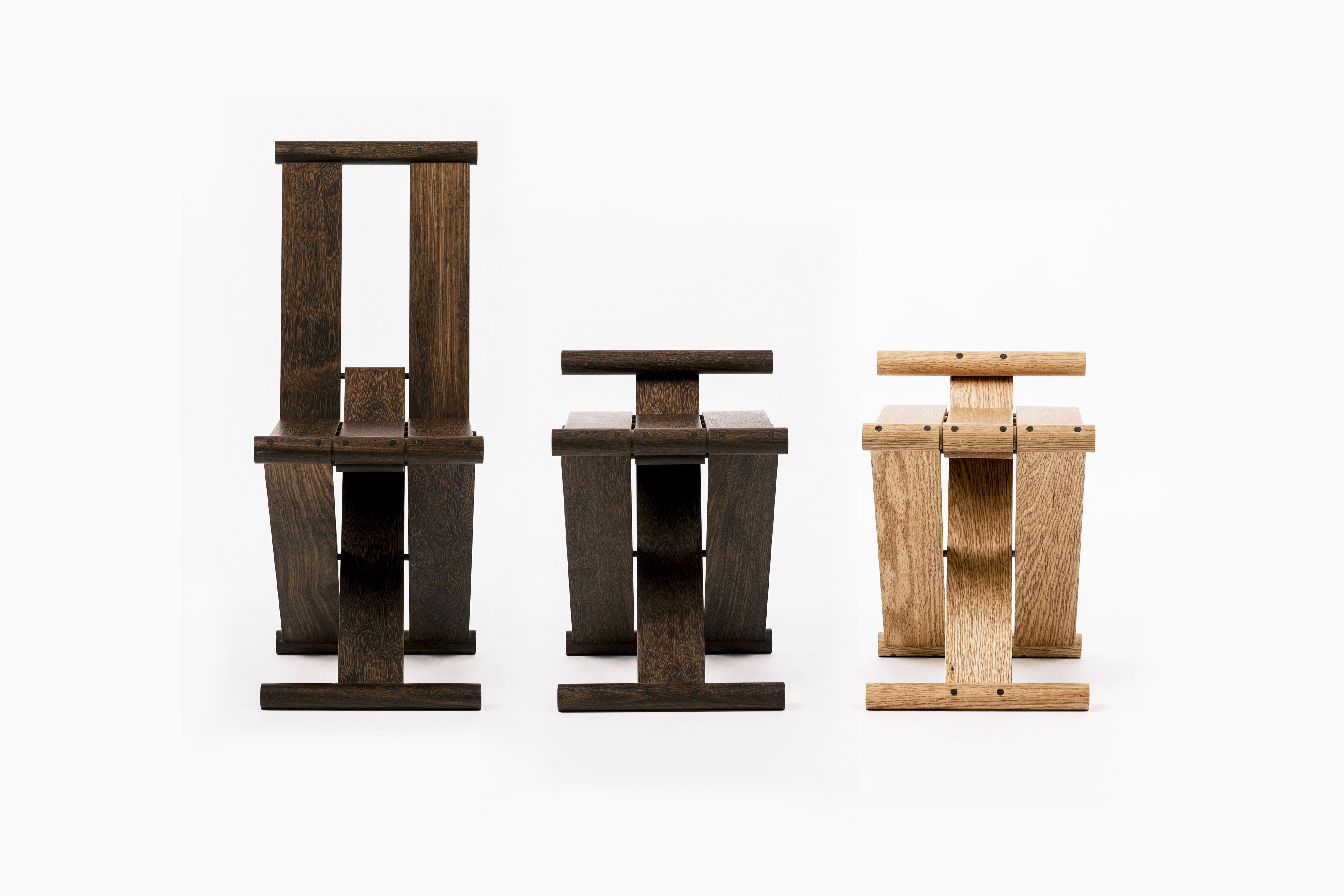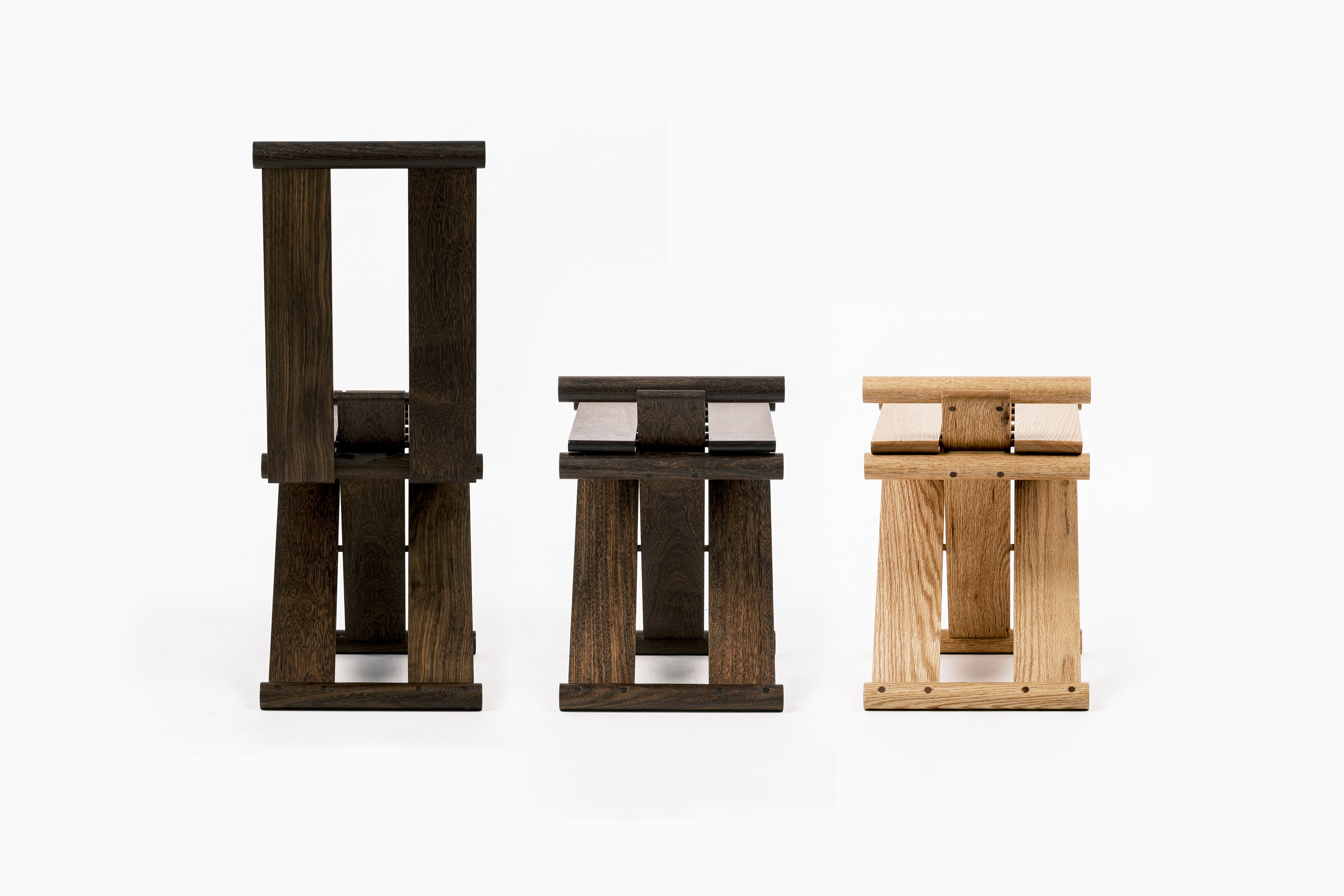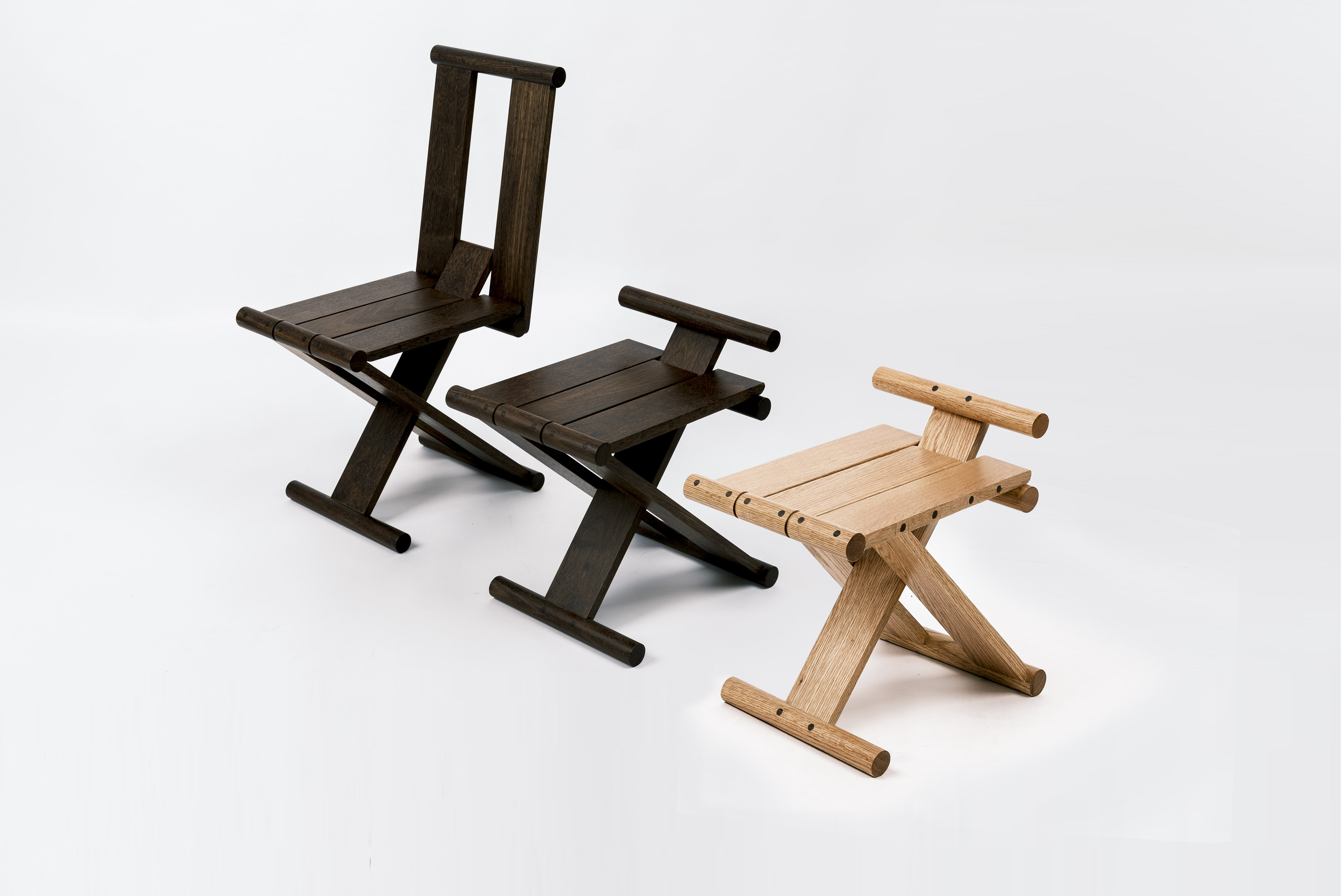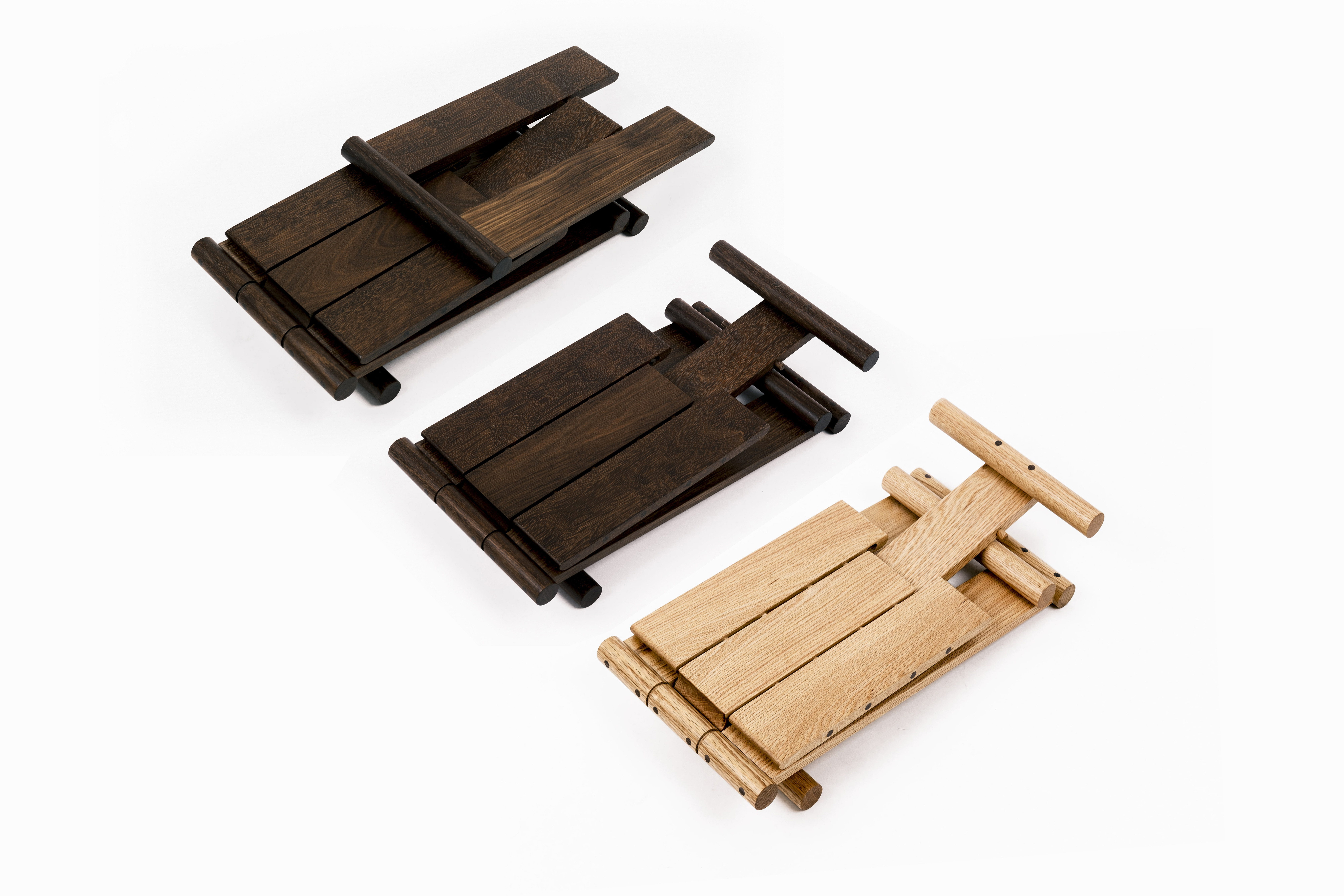 The pair bench and chair is made of natural wood, which guarantees great mechanical resistance. All hinge and fittings systems are made with the same wood, giving the piece a more artisanal character. The pieces are foldable, allowing it to be stored in a smaller space. The finish is done with the application of a matte water-based varnish to protect the surface. The pieces presented in the photograph are produced in oak and sucupira wood, with chromatic values in order to respond to equally differentiated environments.
