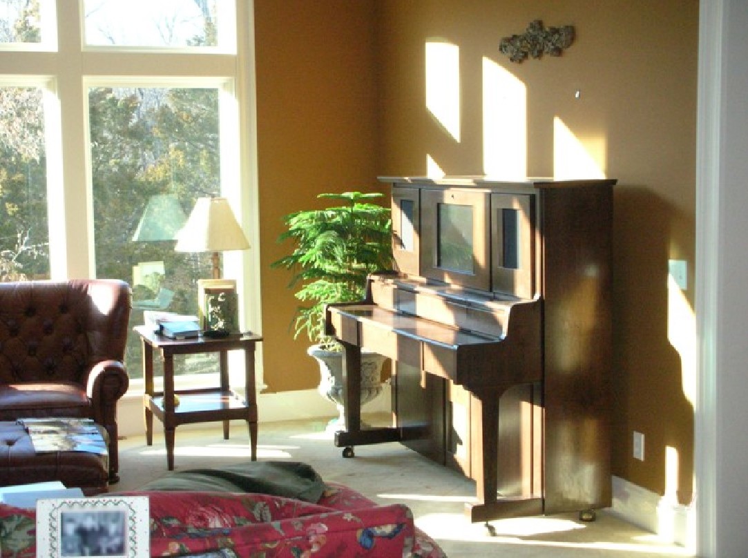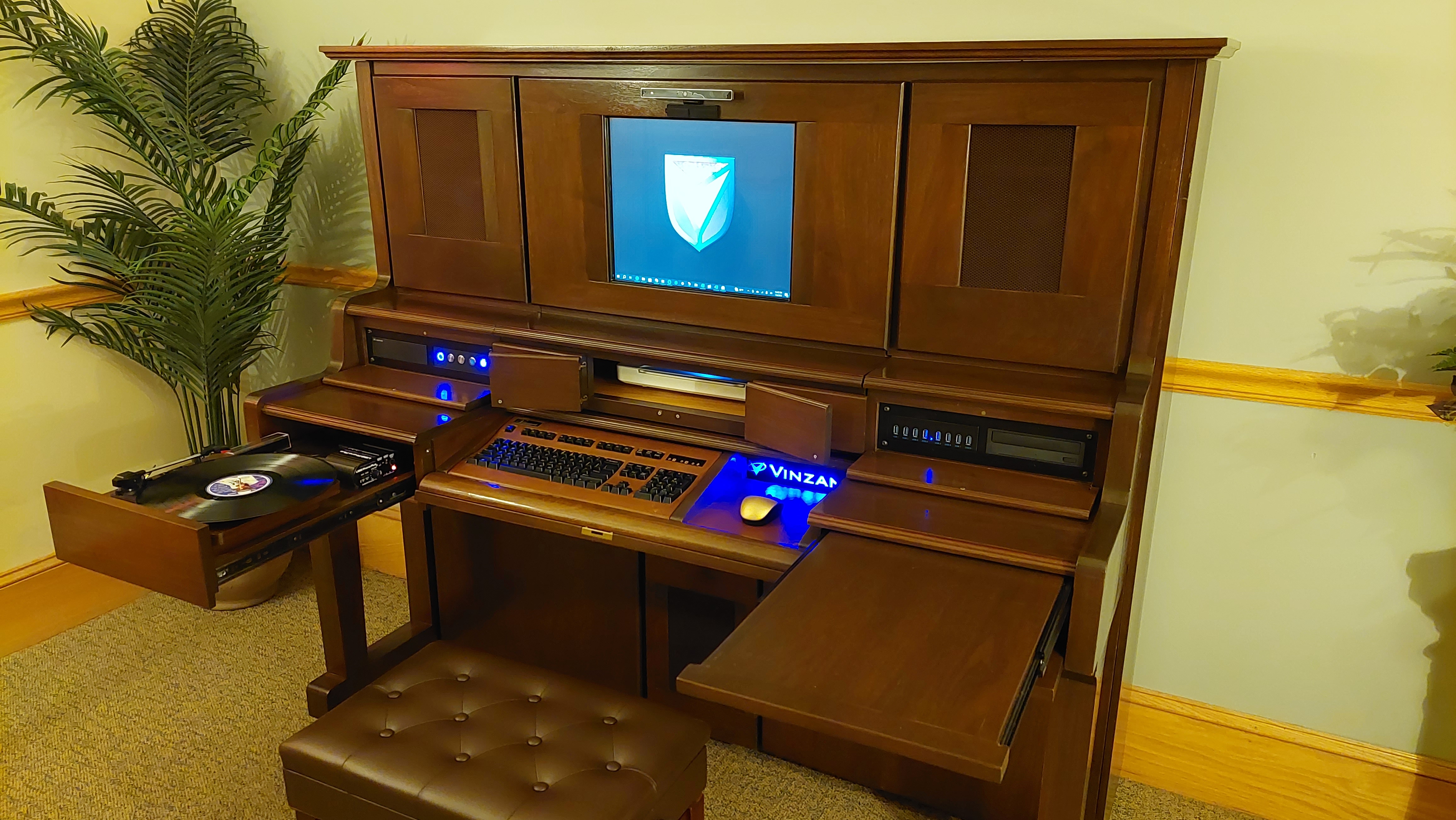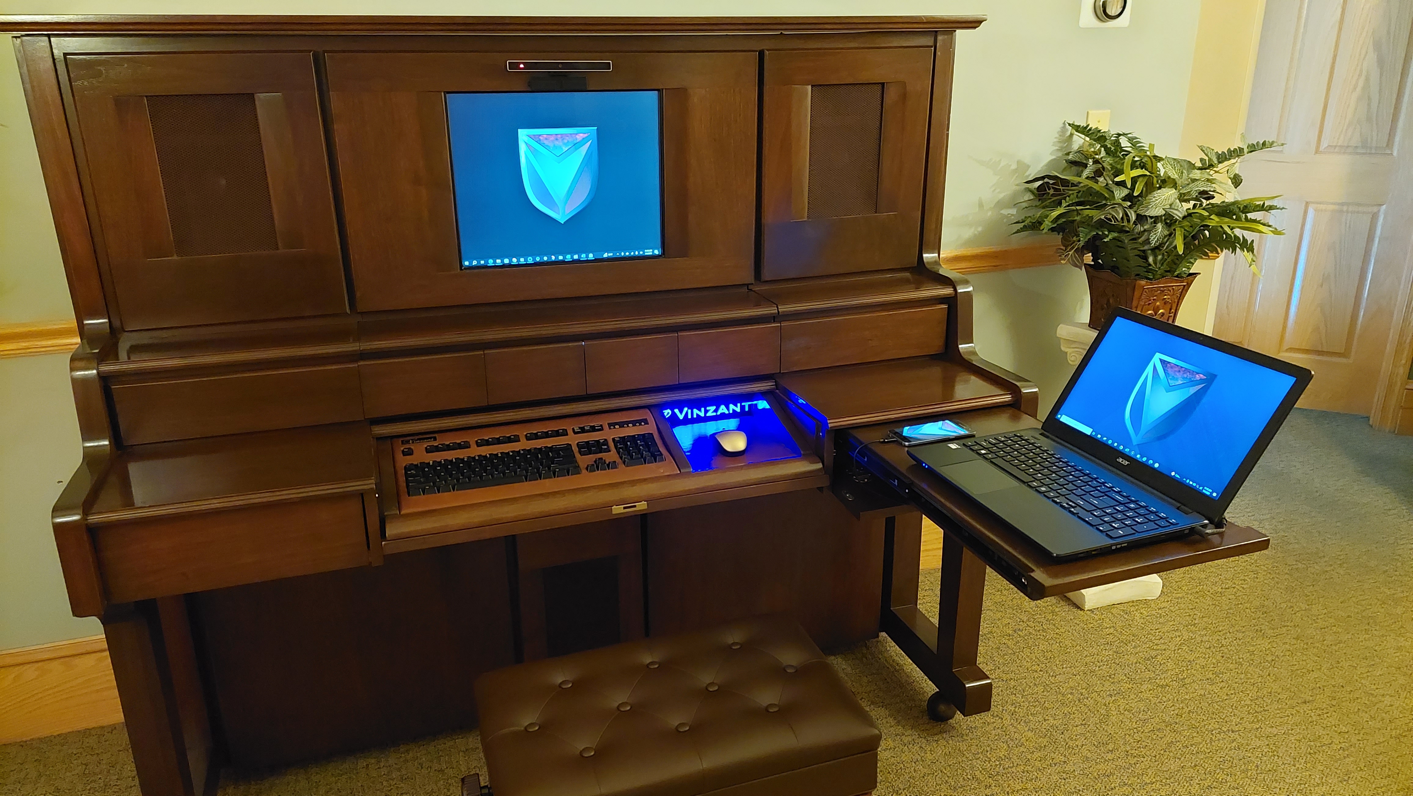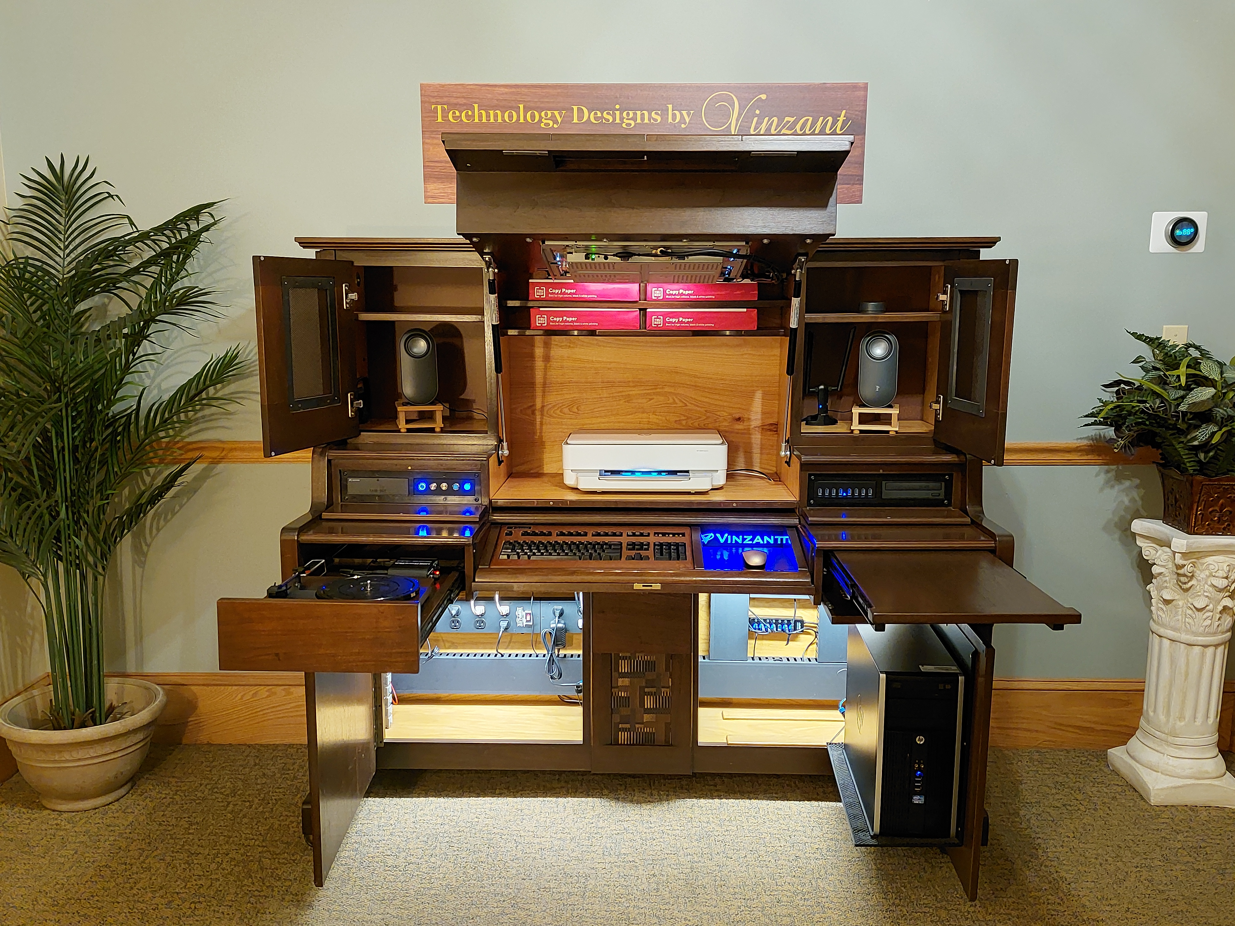 The OmniCenter seats two people and provides a warm enjoyable computing experience while blending into the most aesthetically demanding environments. Anywhere a piano can go the OmniCenter can go as well. One power cable in the rear is the only cable seen while many cables and PC components can exist inside the cabinet.
