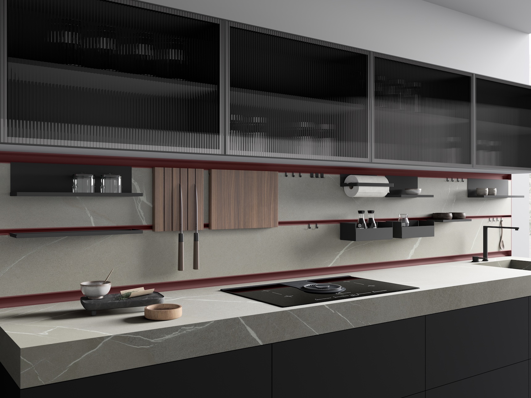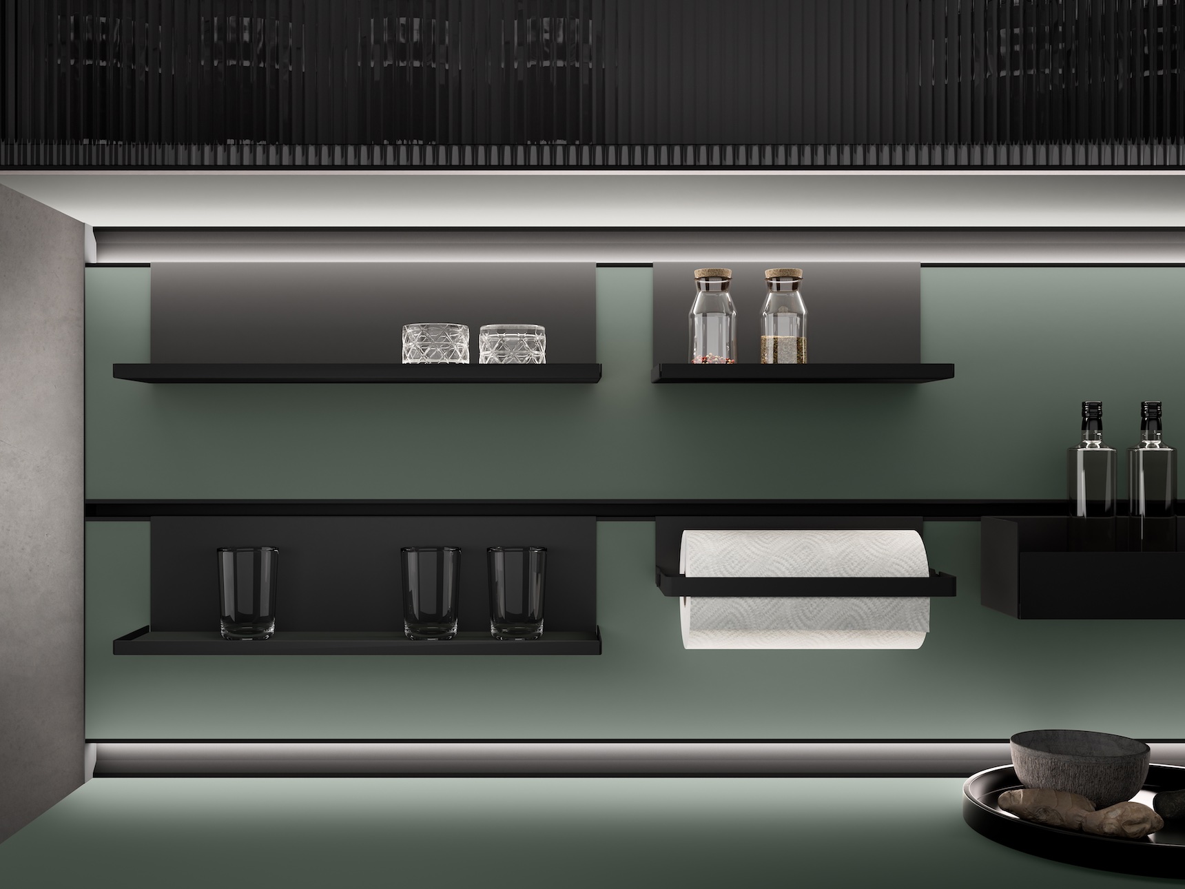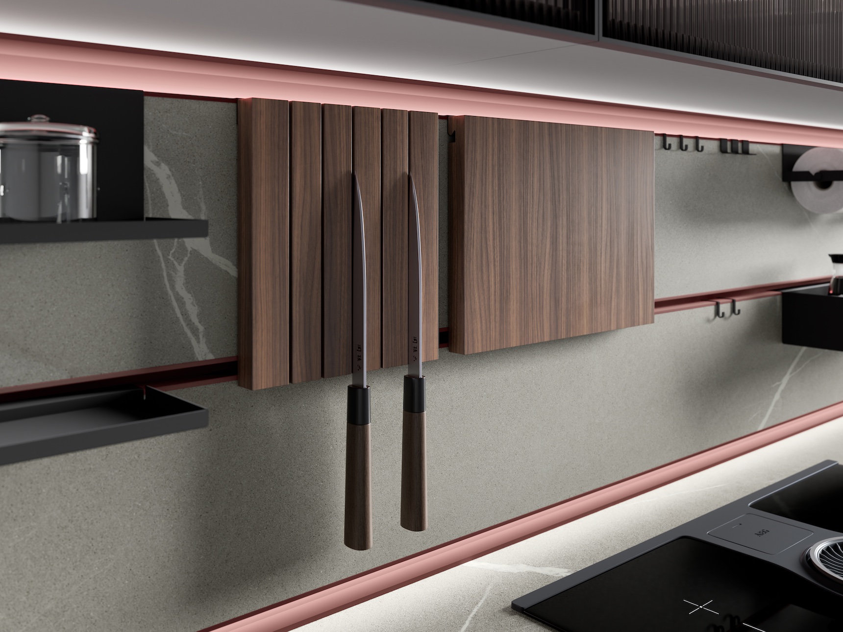 MOOVE is a modern boiserie designed by Andrea Federici for Damiano Latini. Designed to completely integrate with the kitchen and enhance it, MOOVE combines aesthetics and functionality. The backsplash panel can be made of any type of material to make it consistent with the rest of the kitchen. The profiles are sloped to indirectly reflect the LED lighting on the kitchen back, highlighting the boiserie design and creating a nice feel. The metal profiles instead, are the functional elements, designed to optimise space between top and cabinets and to arrange tools and accessories.
