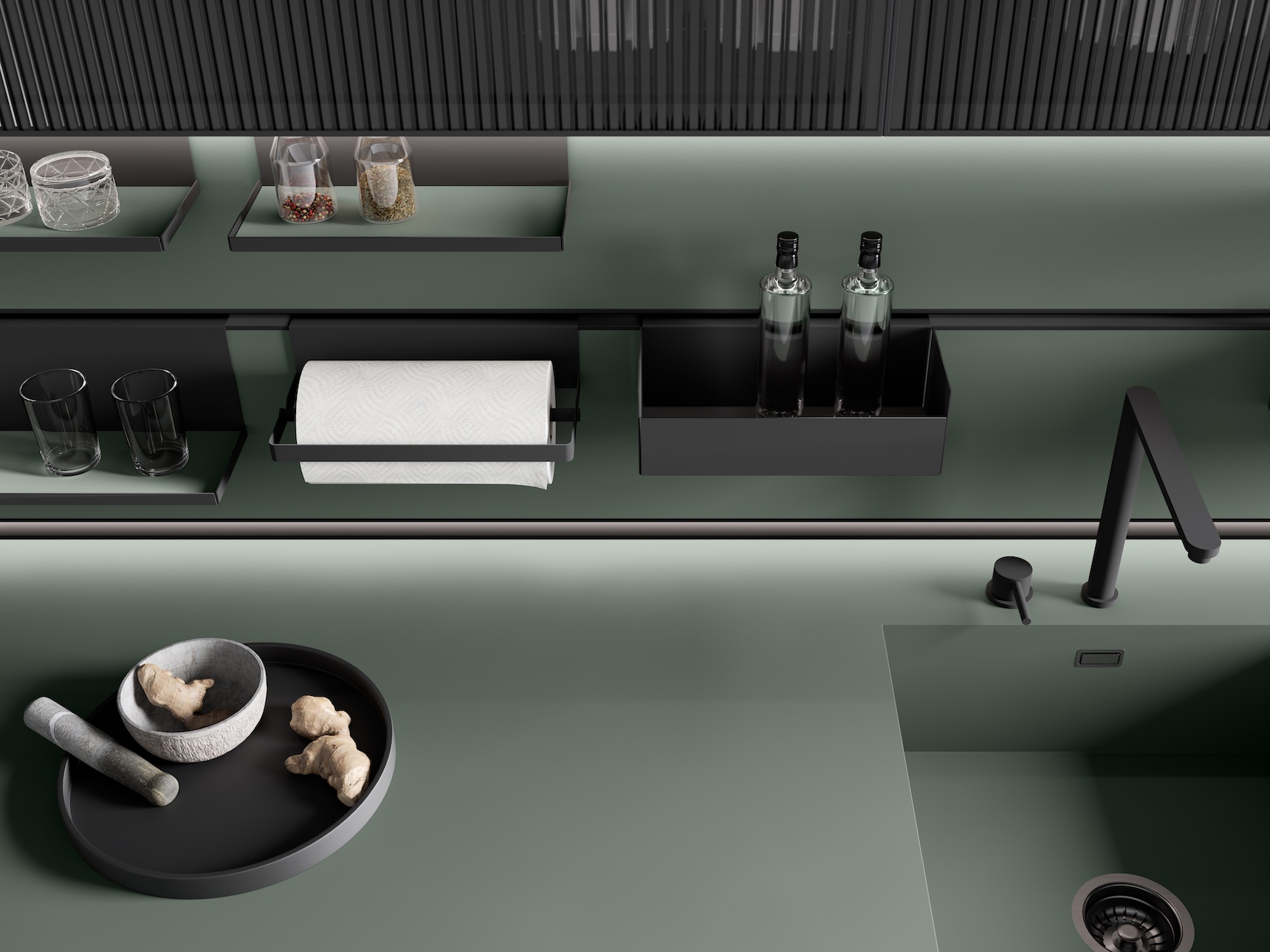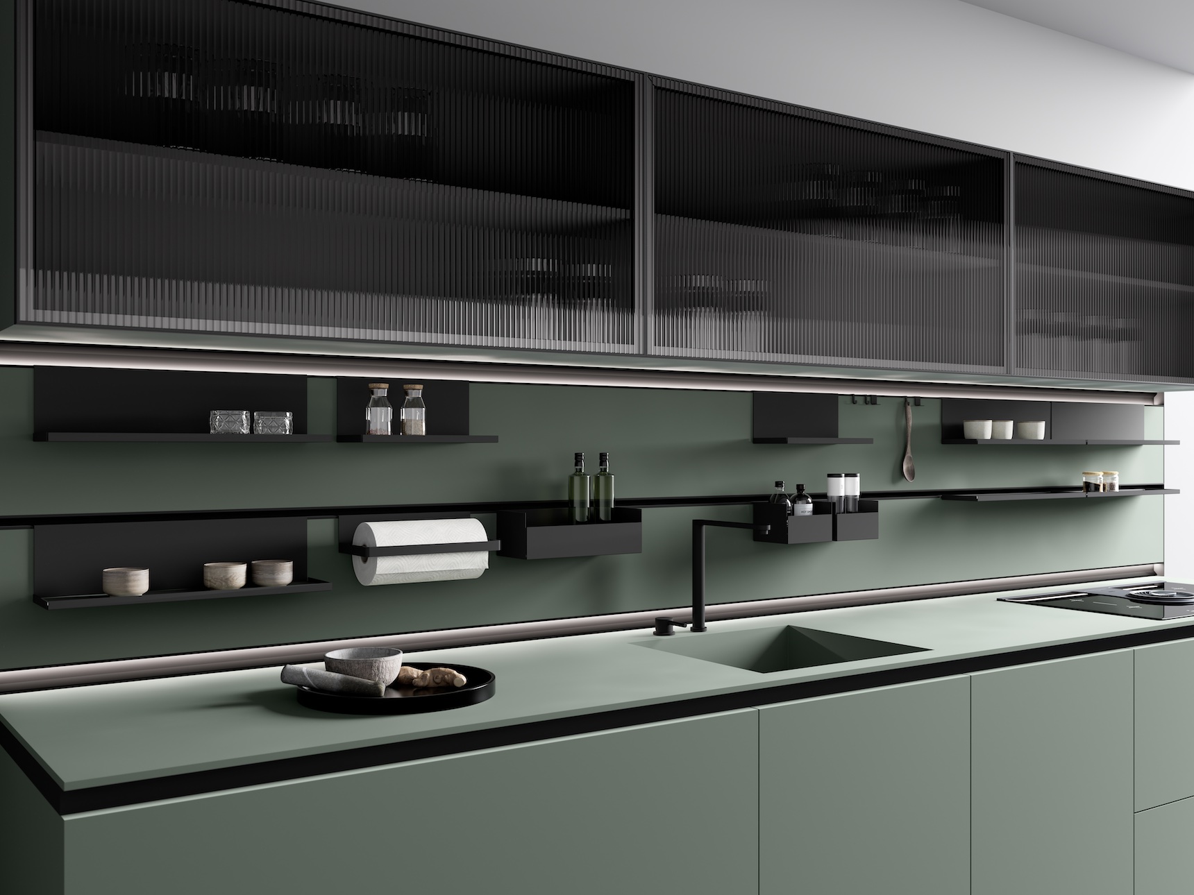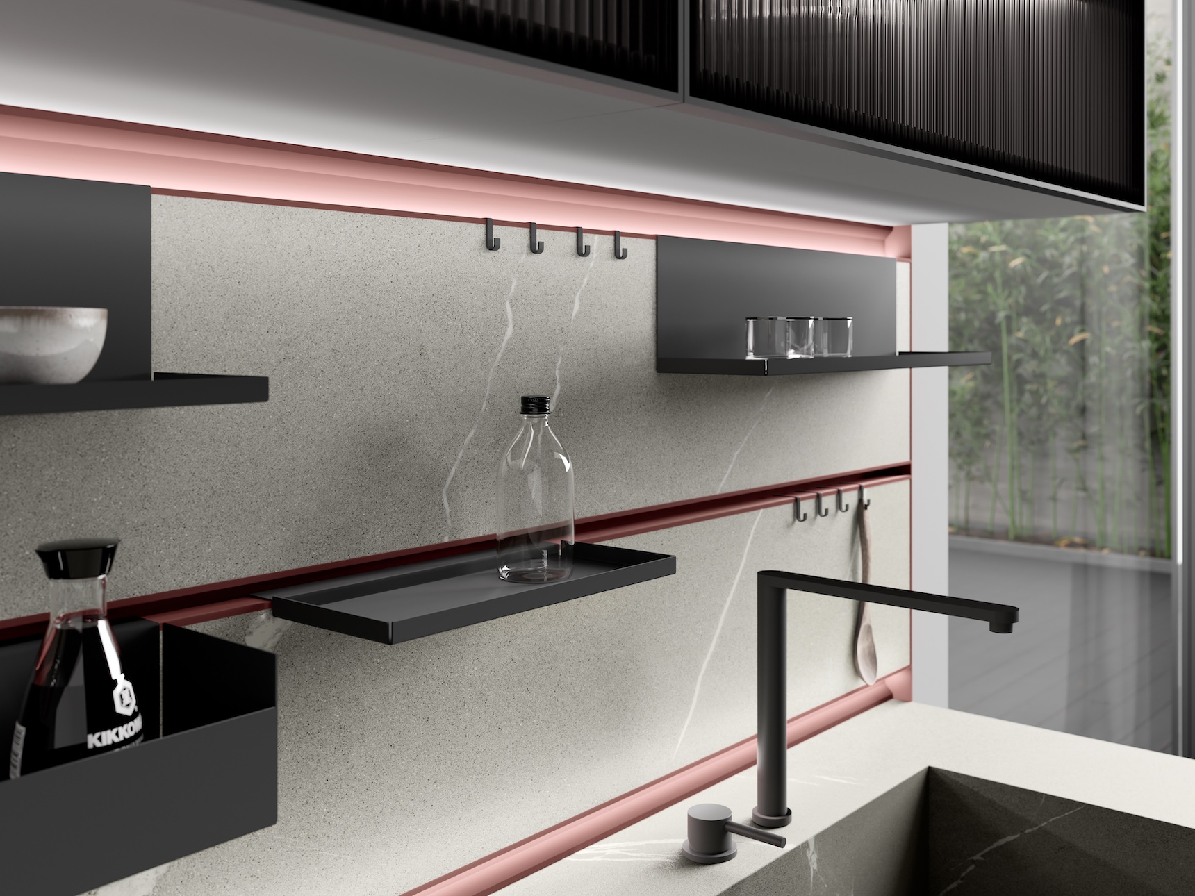 MOOVE is also multifunctional. It combines kitchen racks, kitchen backsplash and LED lighting in one single solution.