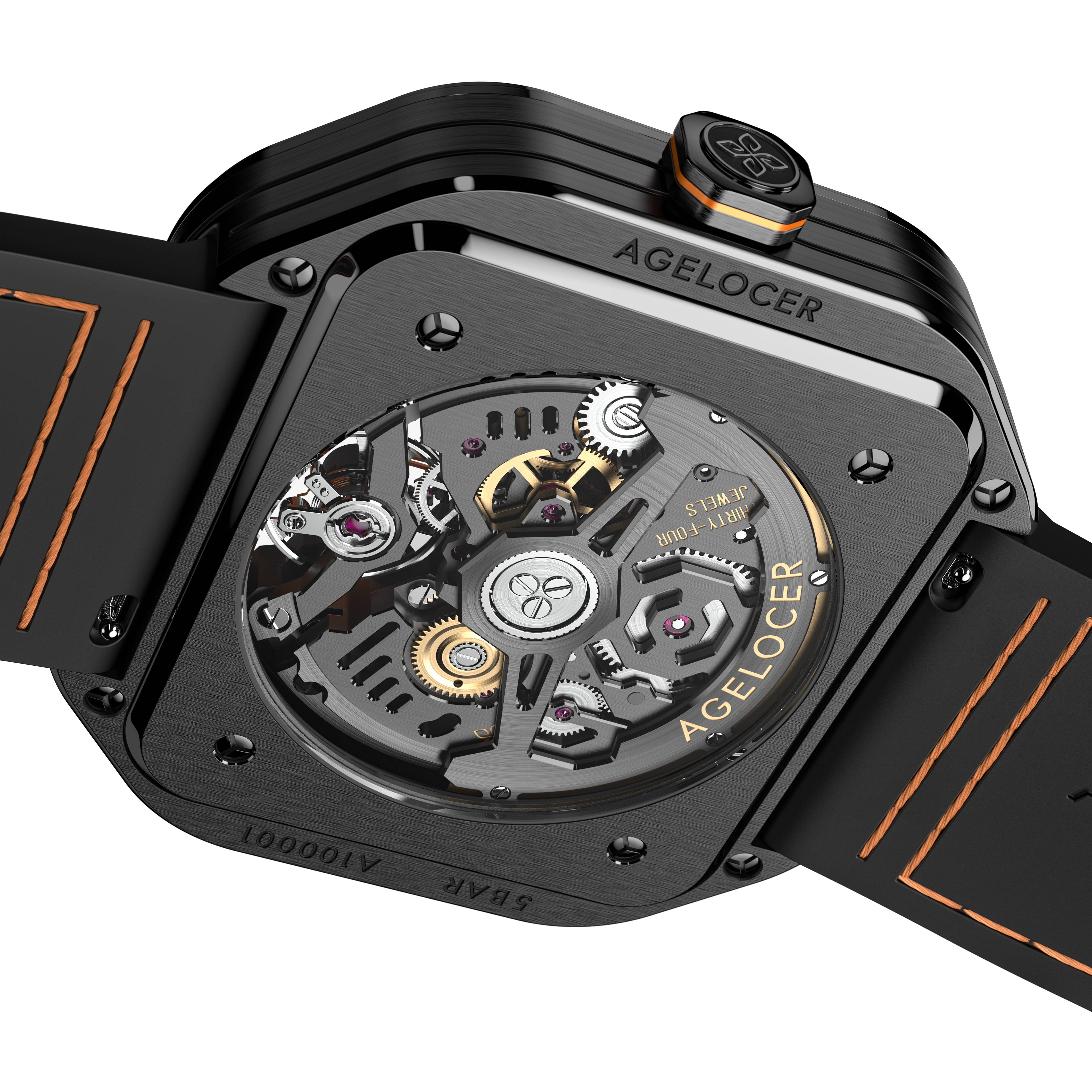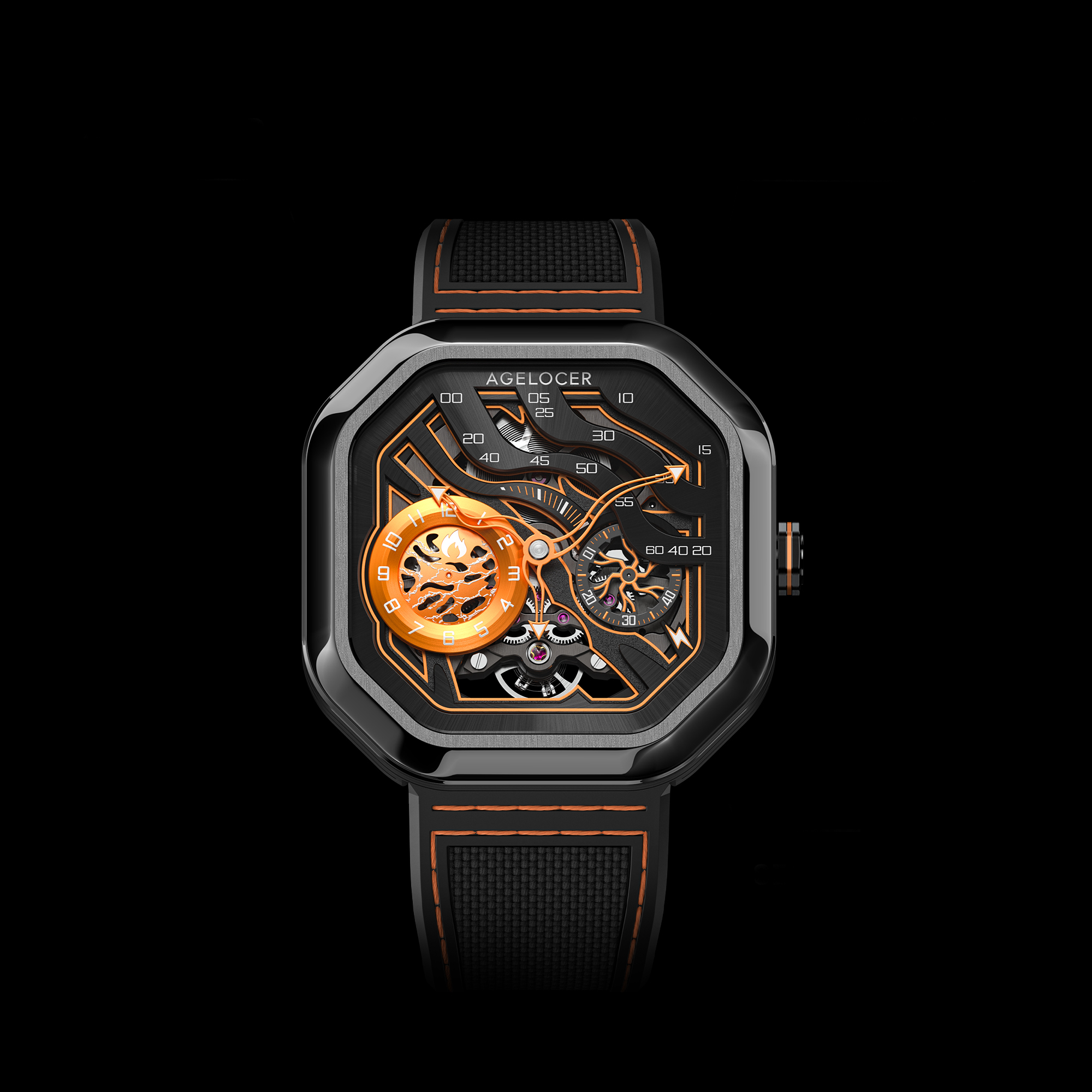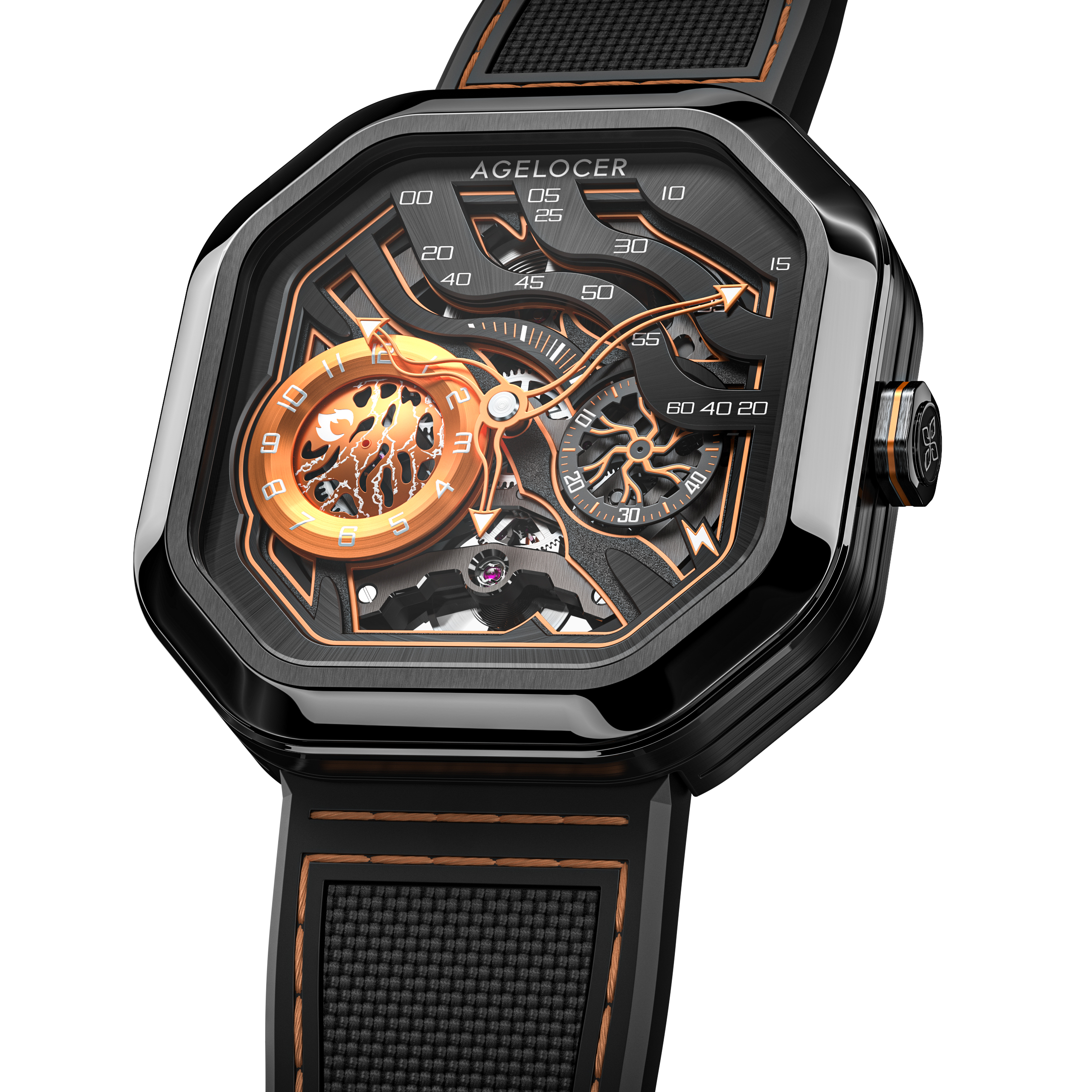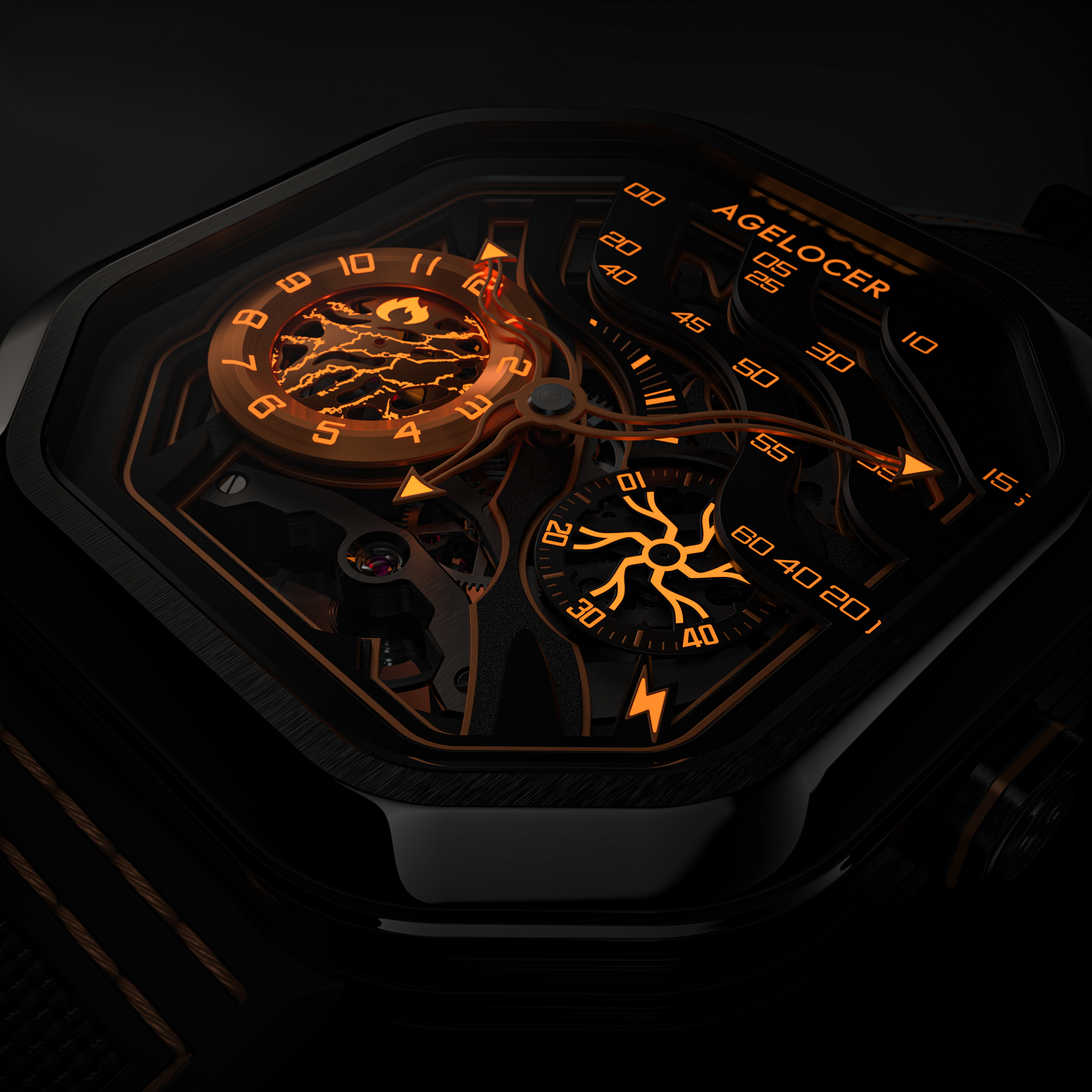 VOLCANO SERIES is inspired from the revelation that vortexes are fused with lava to reach ecological balance, and ingeniously make this a part of the mechanical timer and volcanic eruptions to imply the elapse of time. The tailor-made time reading system is fabricated by 3D printing with the eruption of a volcanic vent shown on the 12-hour spherical hand. The orange lines on the dial are drawn by large open fire enamel process to simulate lava flows after a volcanic eruption. The dial features Super Luminova luminous numerals, the orange three-way curved flowing minute hand vividly illustrates, and the immense power hidden in the wrist seems to burst out. The rapid movement of the independent second dial shows the dynamic fusion of larva in vortex for ecological balance in nature. On the wearer's wrist, a miniaturized mechanical volcano erupts, flows and solidifies, an ingenious way of recording the elapse of time. VOLCANO SERIES is powered by an automatic mechanical movement developed in-house by AGELOCER. Aside from separate hour, minute and second hands, it offers an extra complex jumping hour function. The jumping hour function is designed with a spring hook that causes the 12-hour gear to instantly jump one division when the spring force reaches the critical point of toggle, which can avoid misreading due to tiny size of the hour hand dial in a watch with three-hand separation design.