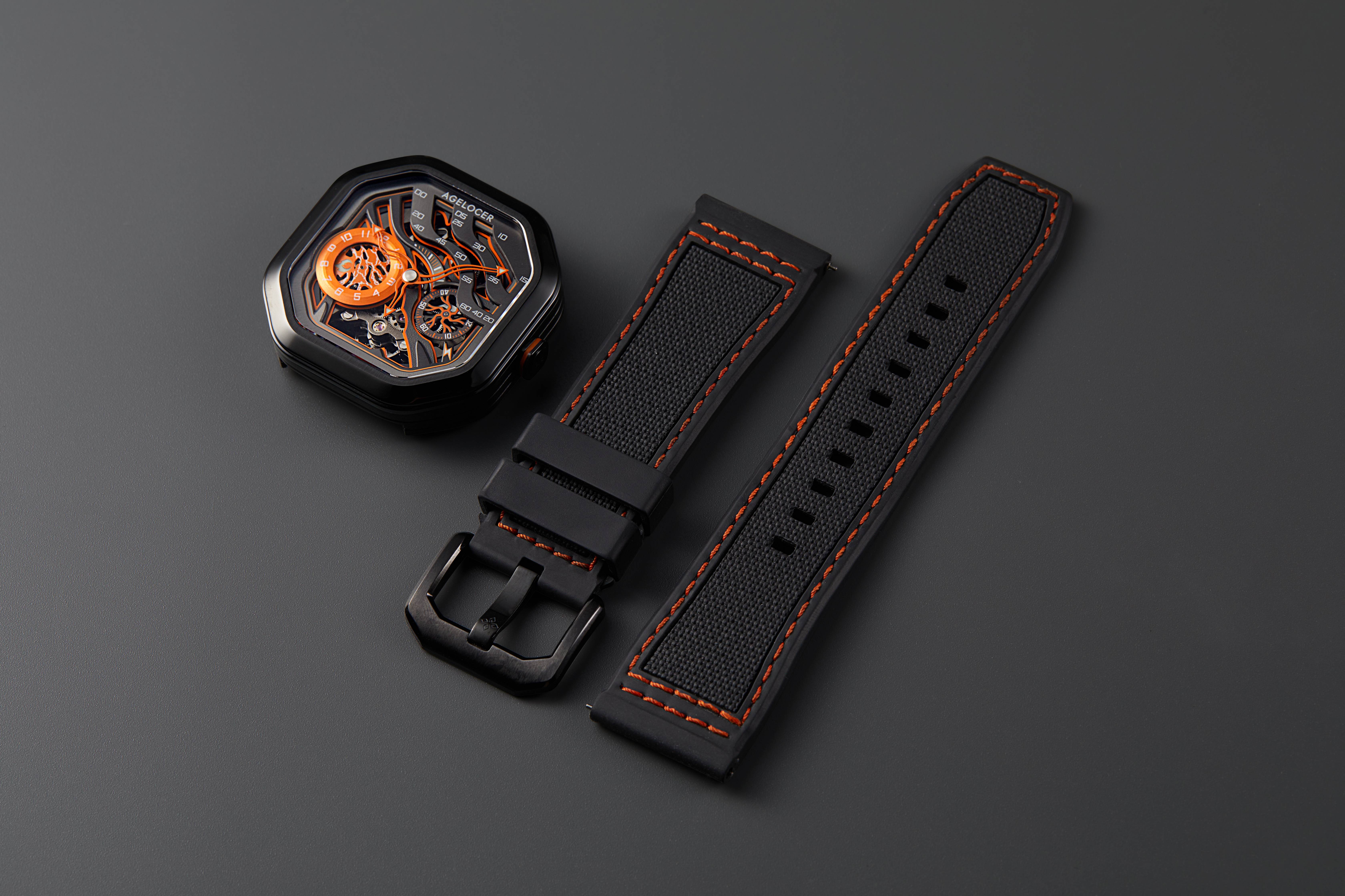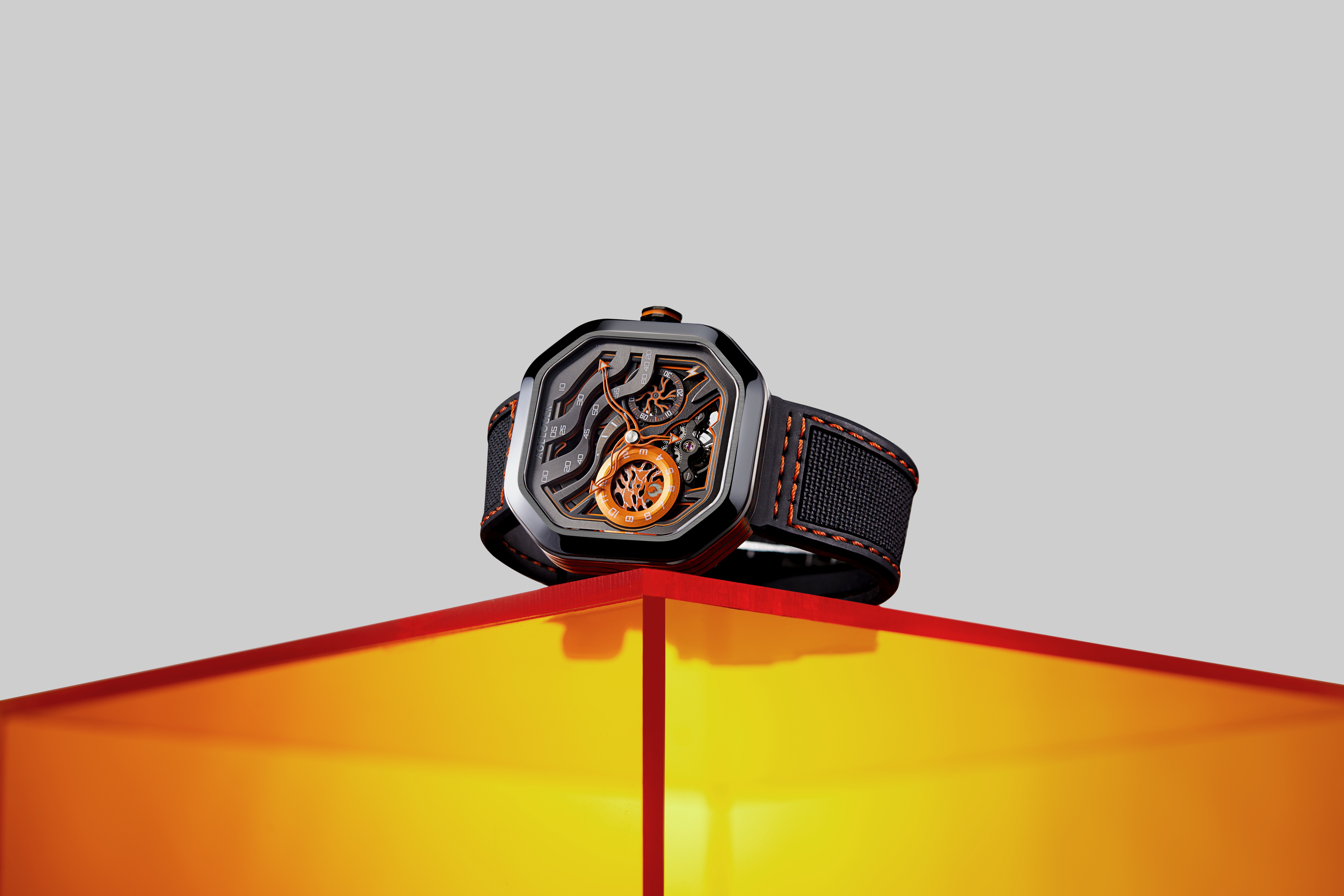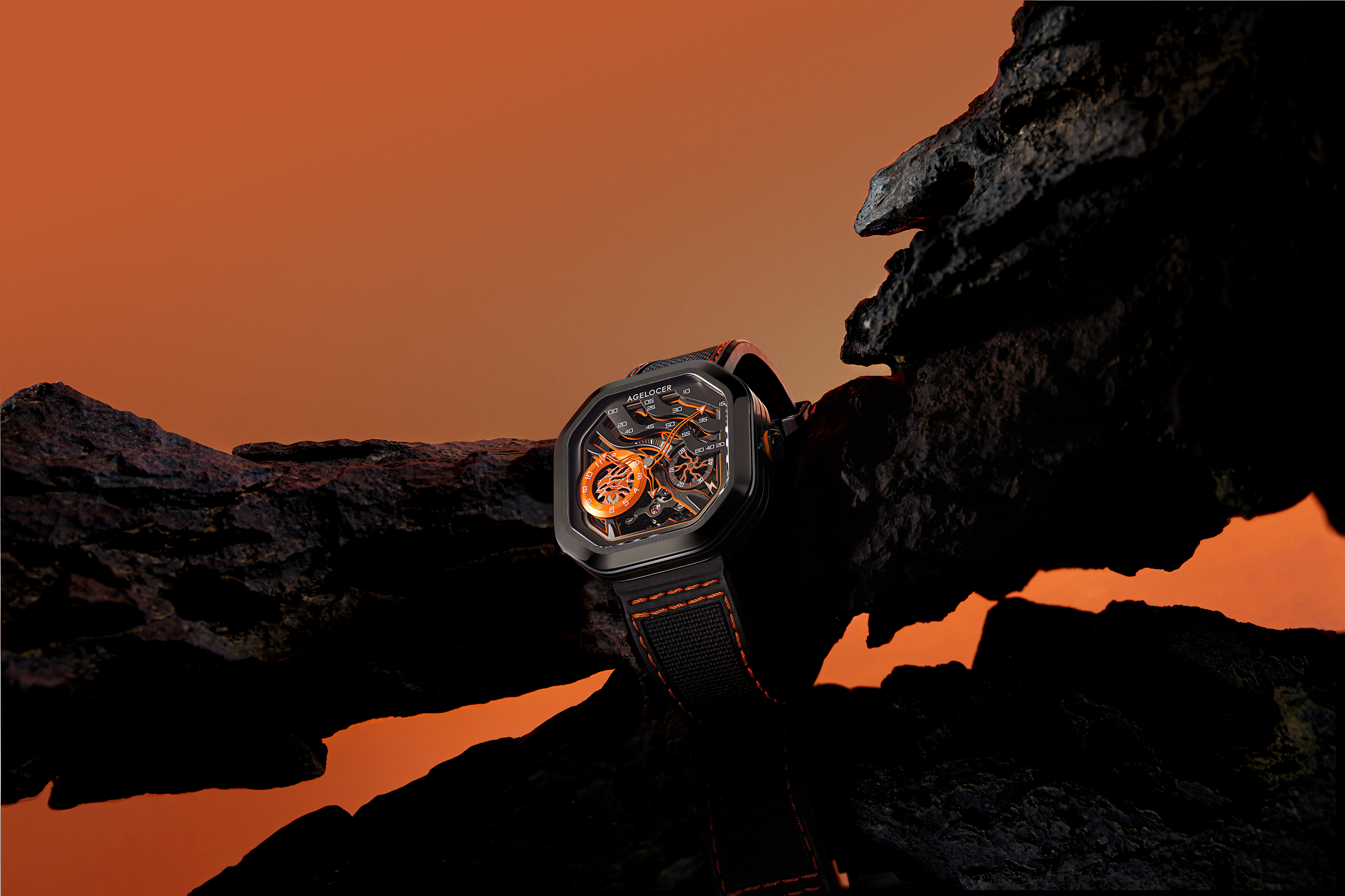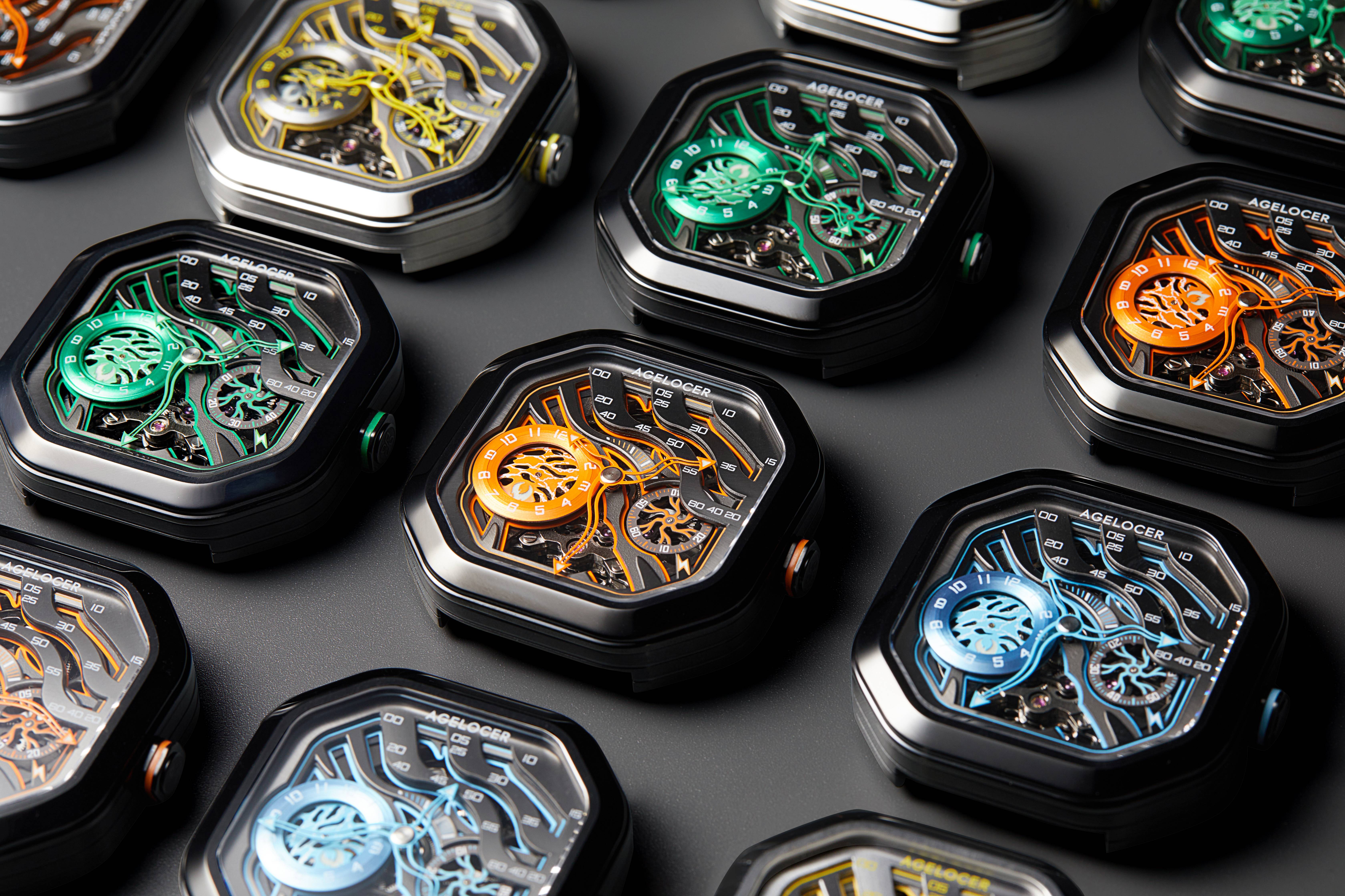 VOLCANO SERIES is inspired from the revelation that vortexes are fused with lava to reach ecological balance, and ingeniously make this a part of the mechanical timer and volcanic eruptions to imply the elapse of time. The tailor-made time reading system is fabricated by 3D printing with the eruption of a volcanic vent shown on the 12-hour spherical hand. The orange lines on the dial are drawn by large open fire enamel process to simulate lava flows after a volcanic eruption. The dial features Super Luminova luminous numerals, the orange three-way curved flowing minute hand vividly illustrates, and the immense power hidden in the wrist seems to burst out. The rapid movement of the independent second dial shows the dynamic fusion of larva in vortex for ecological balance in nature. On the wearer's wrist, a miniaturized mechanical volcano erupts, flows and solidifies, an ingenious way of recording the elapse of time. VOLCANO SERIES is powered by an automatic mechanical movement developed in-house by AGELOCER. Aside from separate hour, minute and second hands, it offers an extra complex jumping hour function. The jumping hour function is designed with a spring hook that causes the 12-hour gear to instantly jump one division when the spring force reaches the critical point of toggle, which can avoid misreading due to tiny size of the hour hand dial in a watch with three-hand separation design.