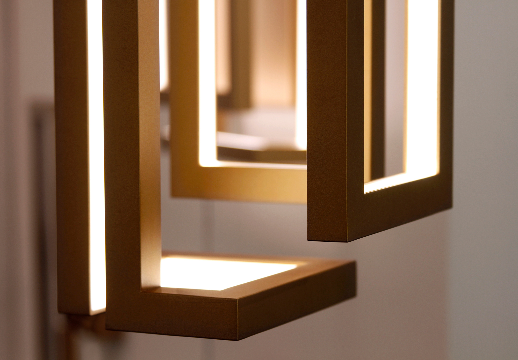 A cubist work of art, the Penrose collection carefully calculates the structural form of a cube space when corners do not meet. This tracery of this shape is emphasized by its dedicated LED light source housed within aluminum channels and then cast in various directions. Available in Matte Black or Gold, this series is a feat of human engineering in design. Translating a mathematical challenge into a sculptural work of art with the function of delivering light to interior spaces.