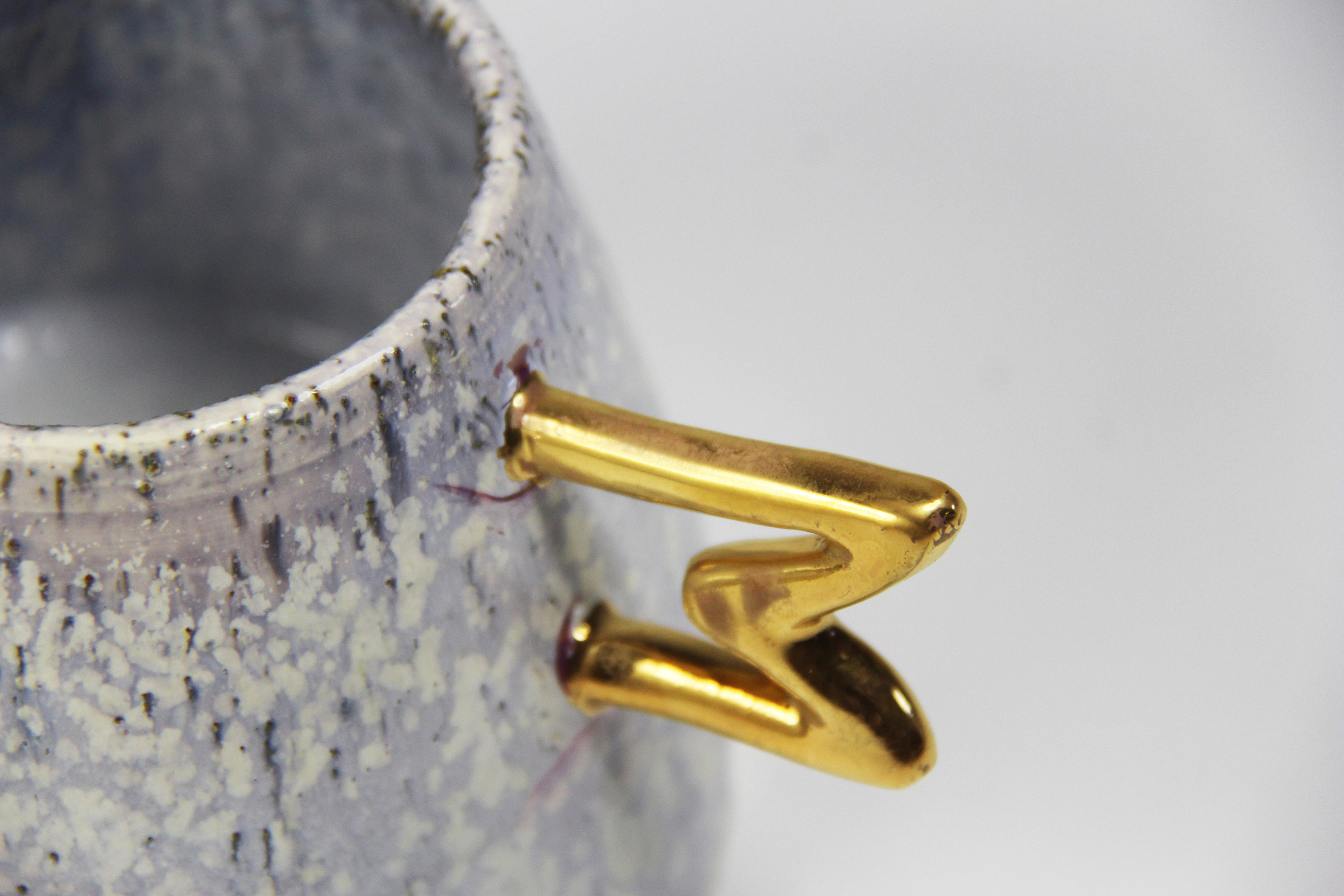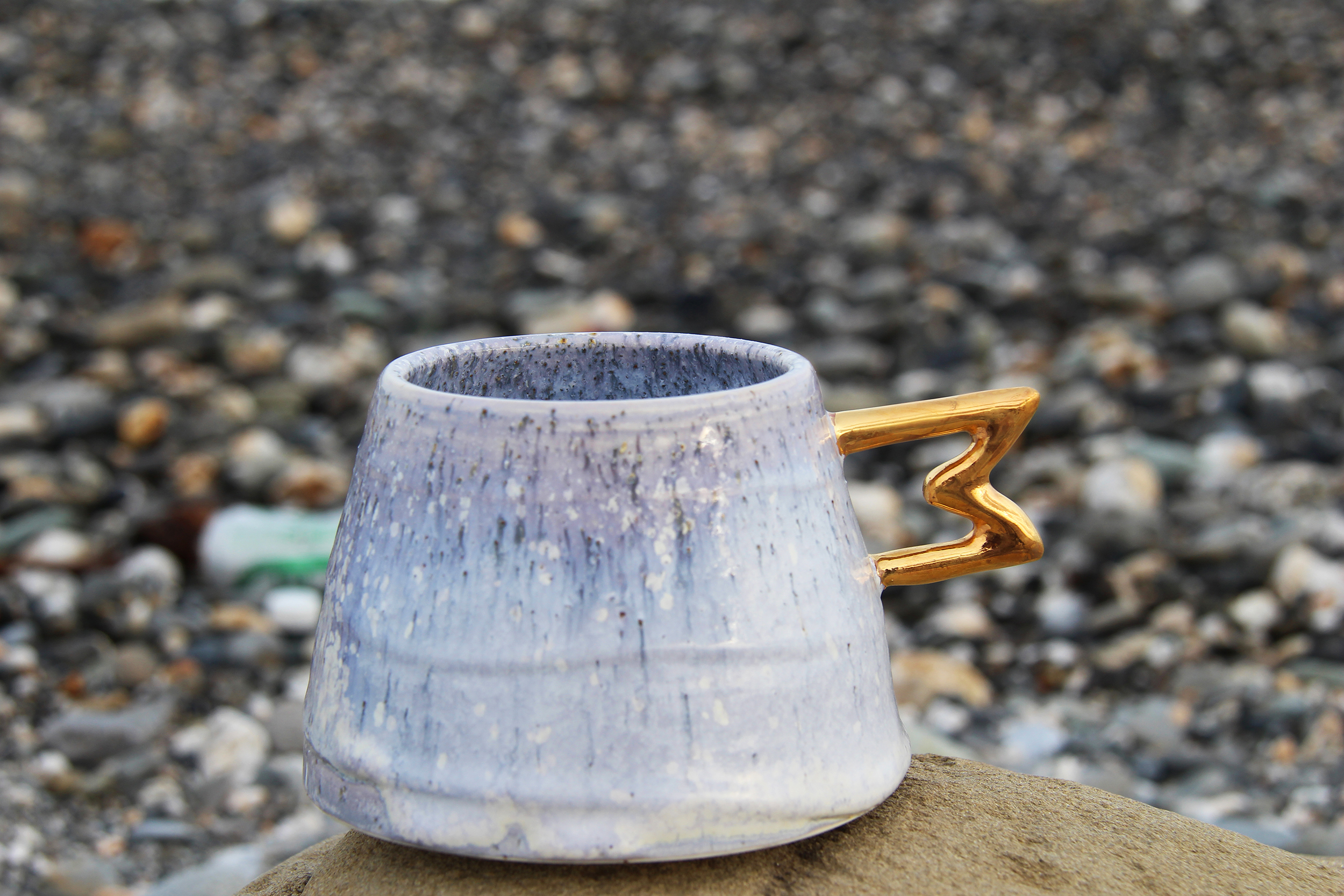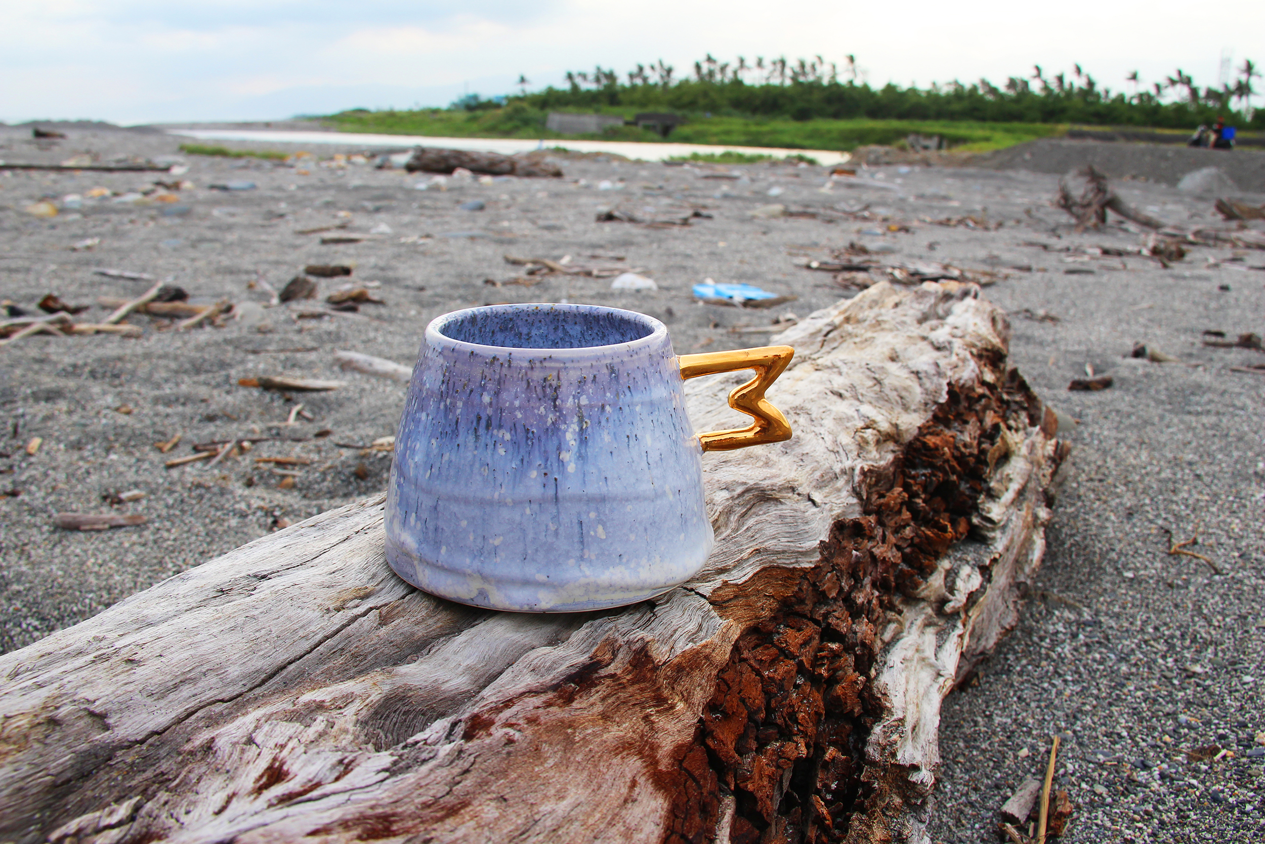 This product is a commemorative item for the 10th anniversary of the Taiwan Taitung Art Museum. It incorporates natural elements such as mountains and ocean waves into its design. The body is made from speckled clay, and when glaze is applied, it undergoes variations based on the speckles of the clay, creating a fluid and vibrant effect. The white crystalline glaze exhibits naturally occurring variations in size and also features flowing patterns based on the surface slope. The handle of the product is crafted using the Taiwan Taitung Art Museum's logo as its design element.