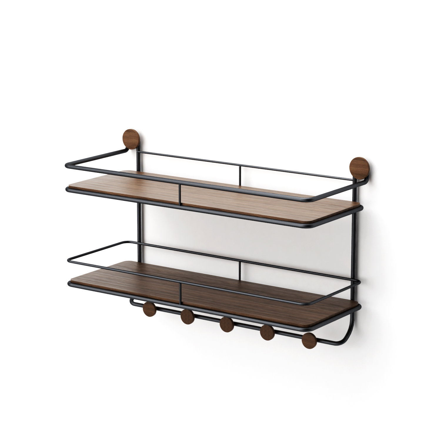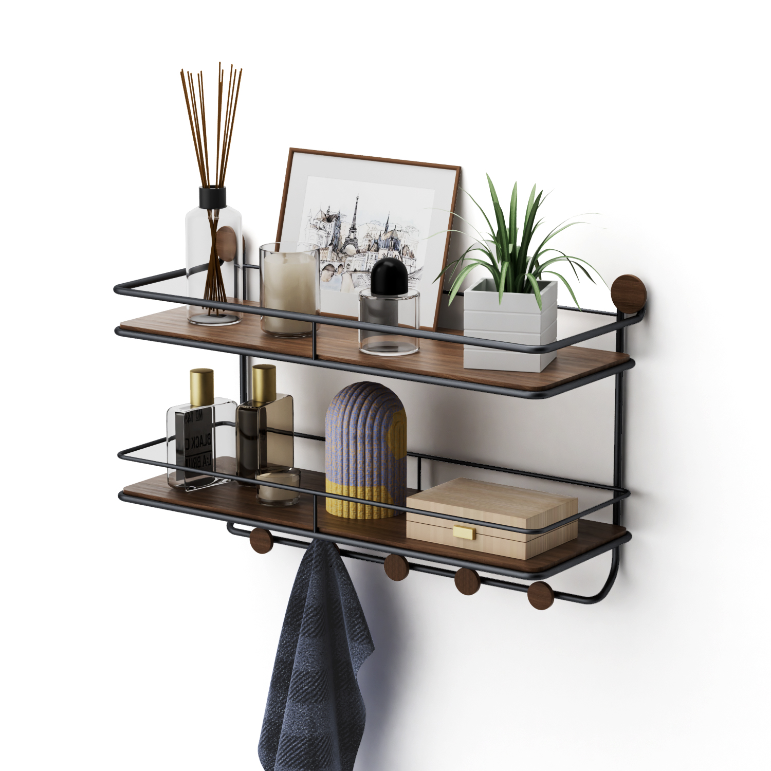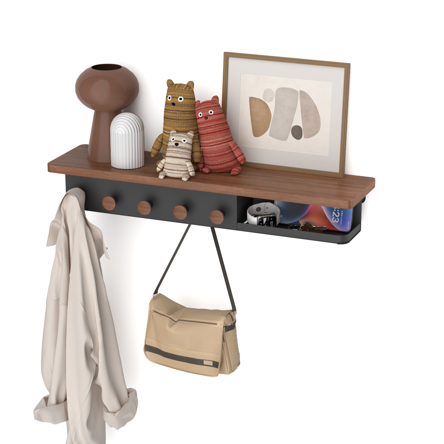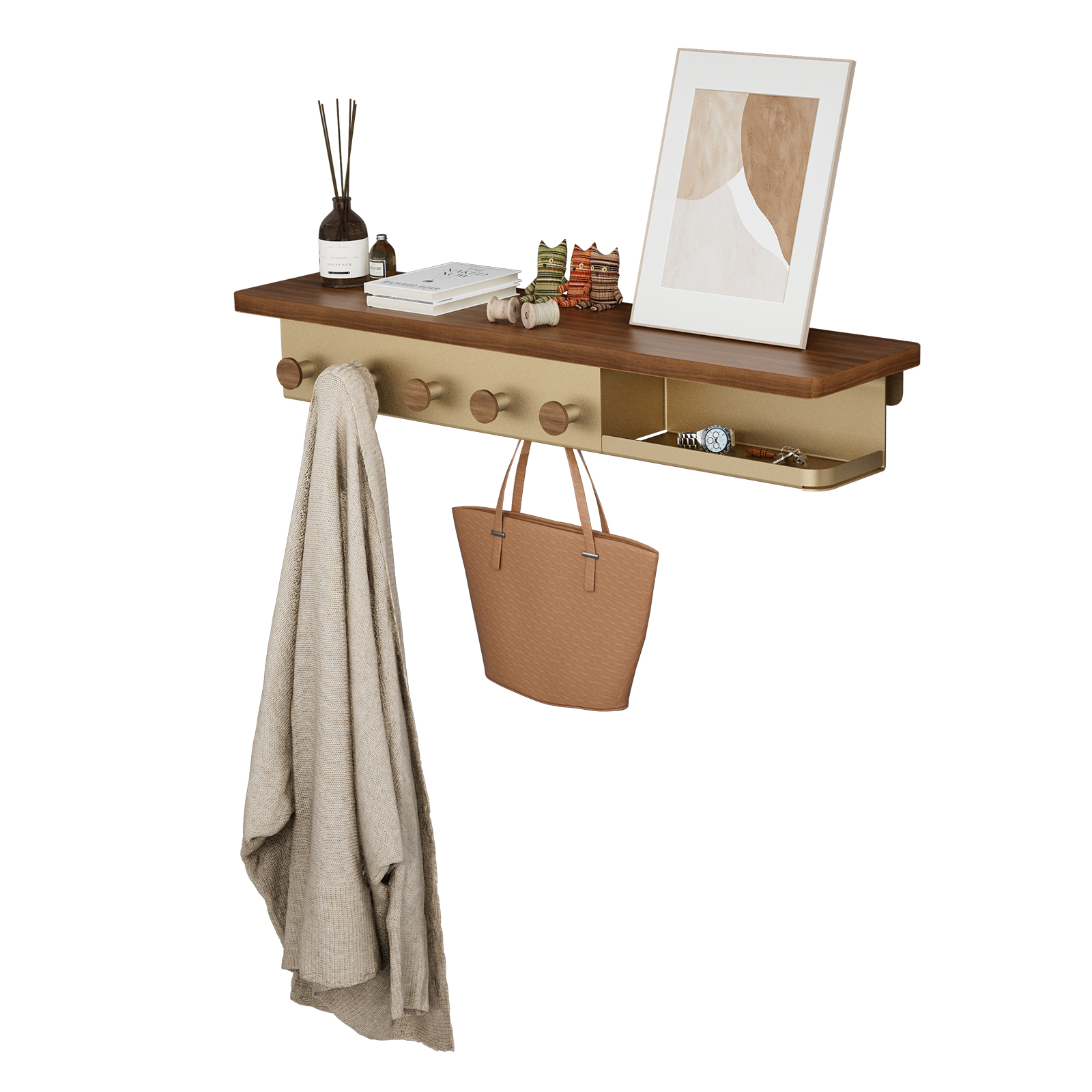 This a wall shelf&coat rack series product, including wall shelf(wall shelif with coat rack/storage space/2 tiers), wall mounted coat rack, standing coat rack (corner/standing coat rack), over door coat rack. It features waterproof, moisture-resistant, and rust-resistant properties, making it suitable for various scenarios and purposes. Installation and assembly are simple, and its load-bearing capacity has undergone multiple mechanical tests, surpassing that of similar products on the market. The seamless fusion of metal and wood materials results in a unique and attractive appearance. Following a minimalist design philosophy, the product's appearance is both sleek and artistic, serving as both home decor and a functional storage solution for various settings.