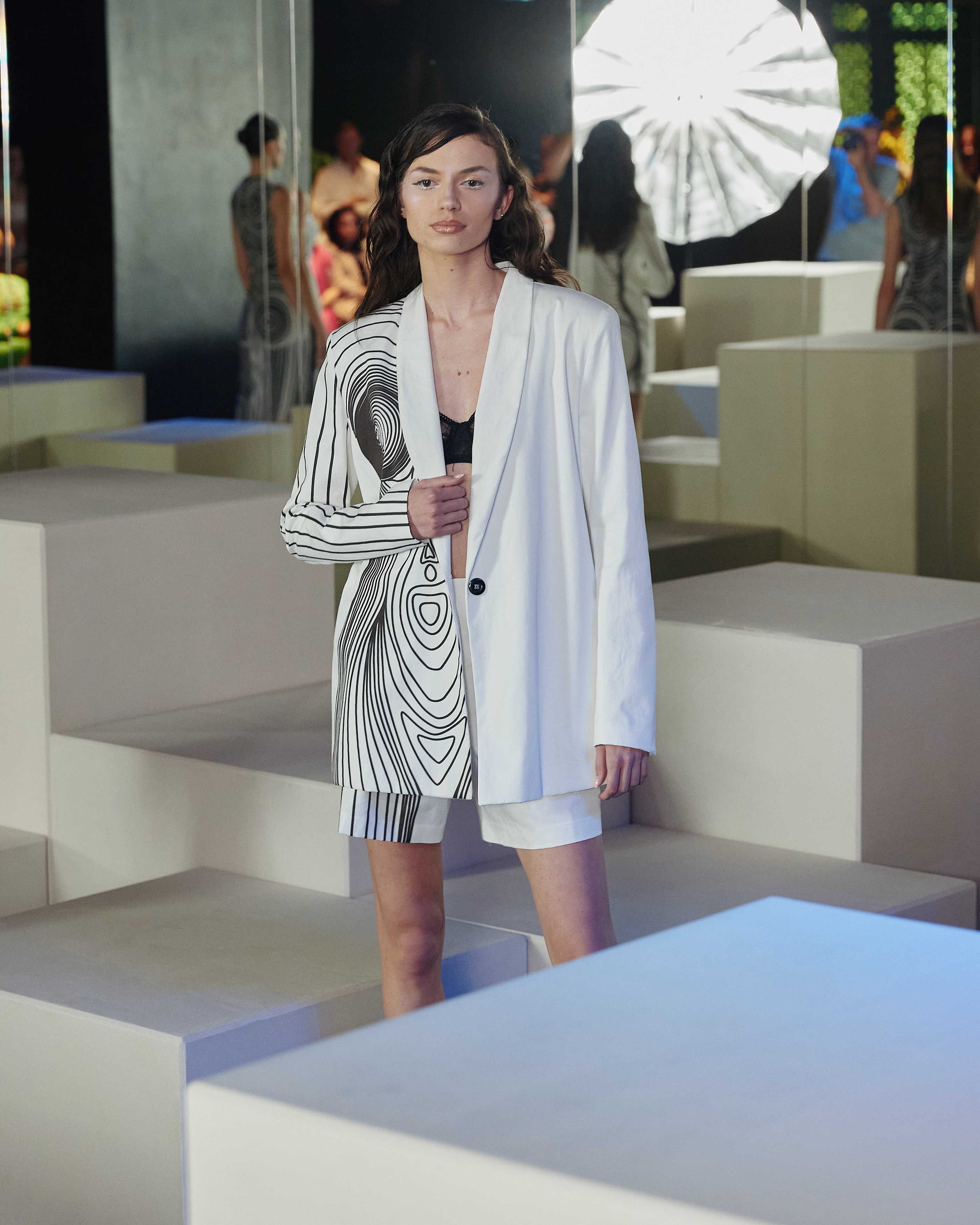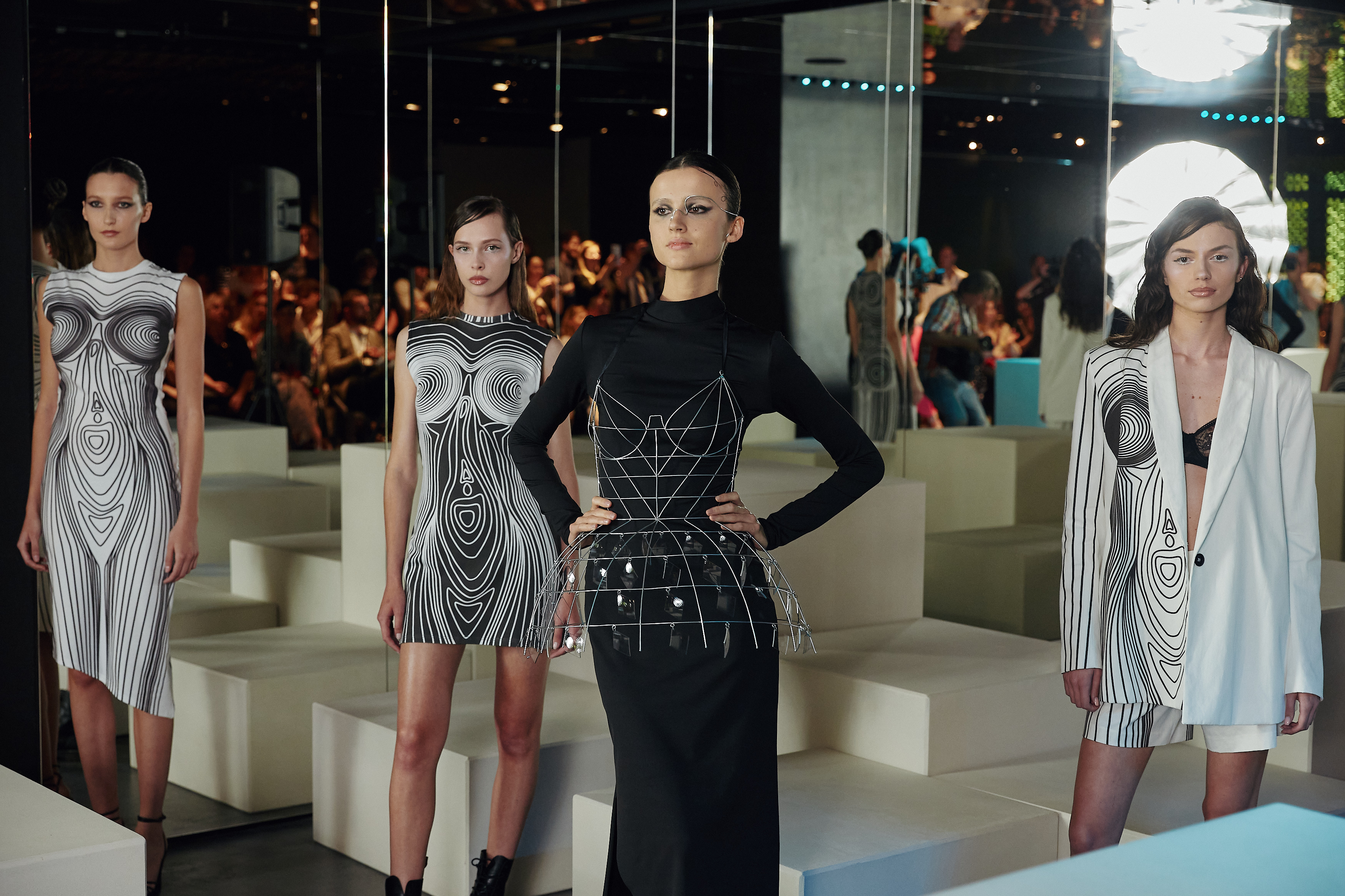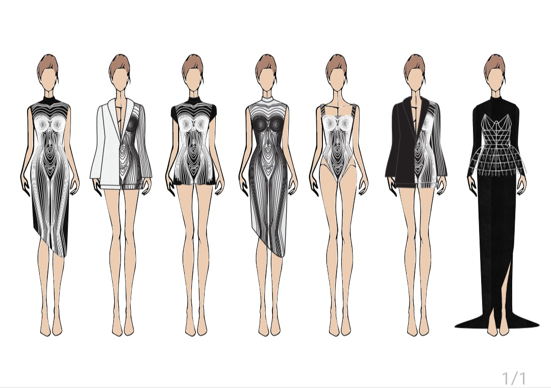 my inspiration for the collection was the lines of the female body, I wanted to modernize the collection with the use of digital print that i made by using Ilustrator and the technical construction of the corset that i made from welding the wire and recycled glass that i grinded, I wanted to combine my two professions in one collection that I called Mirror, it shows us the female we have a body and a reflection of it in glass.