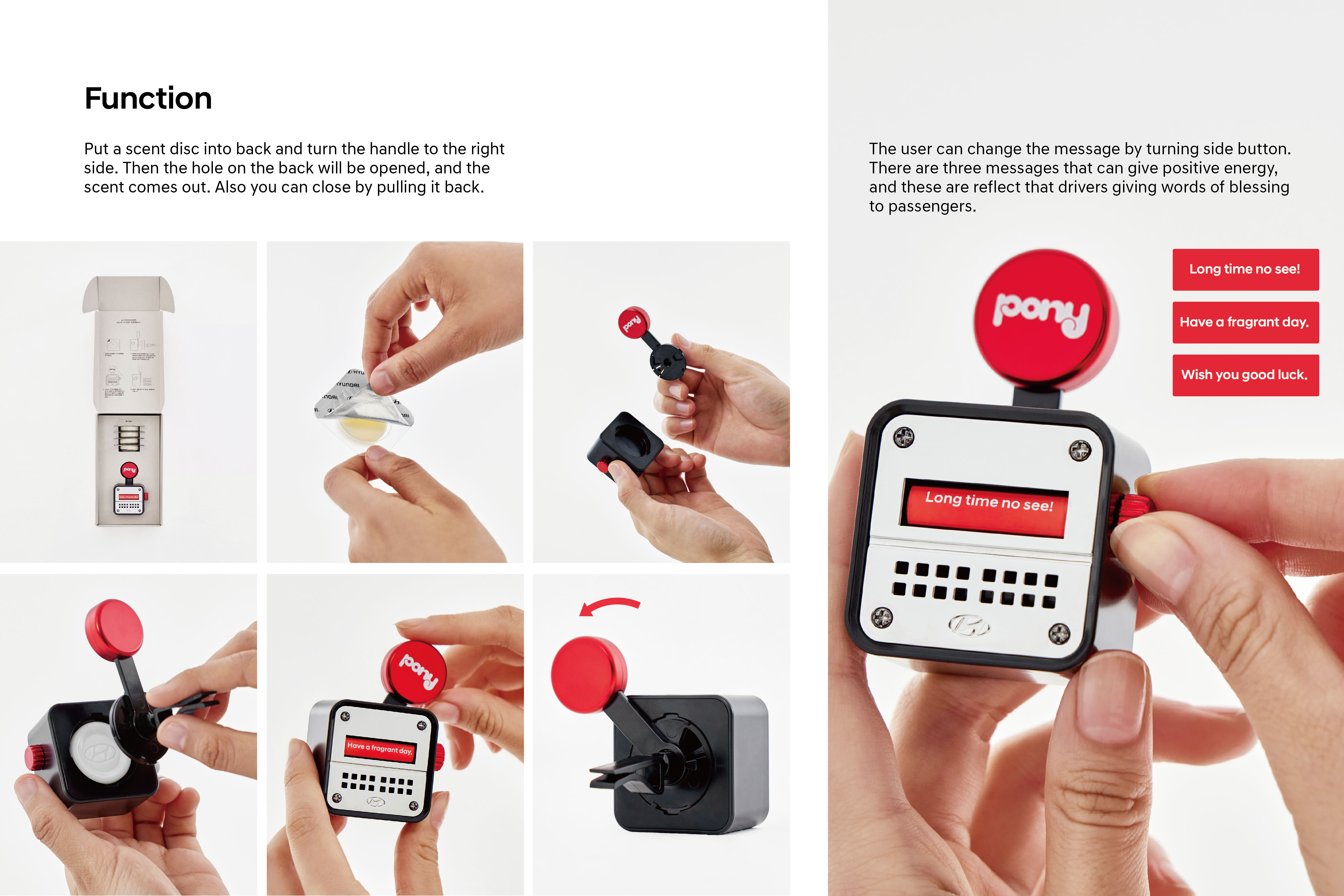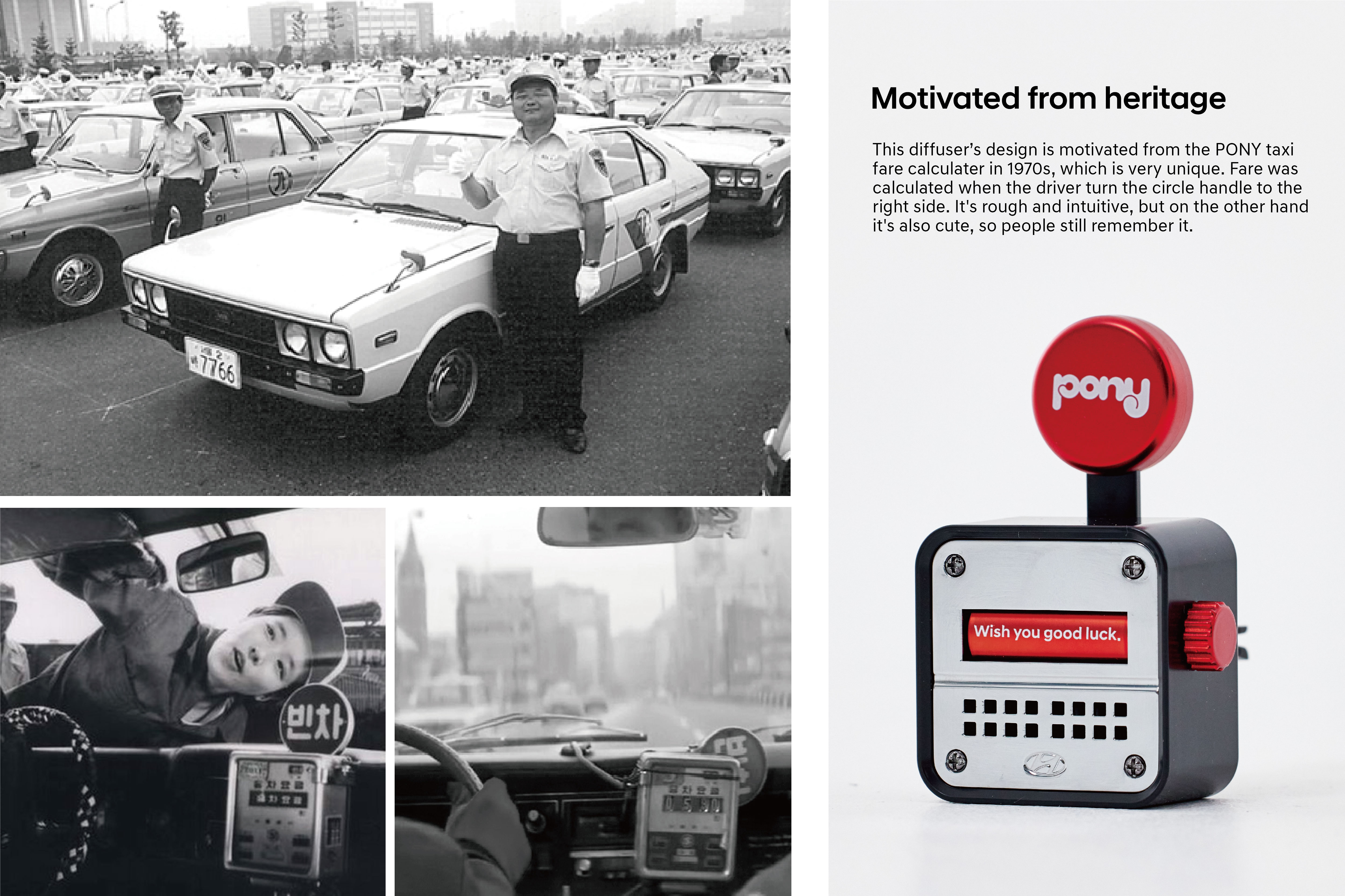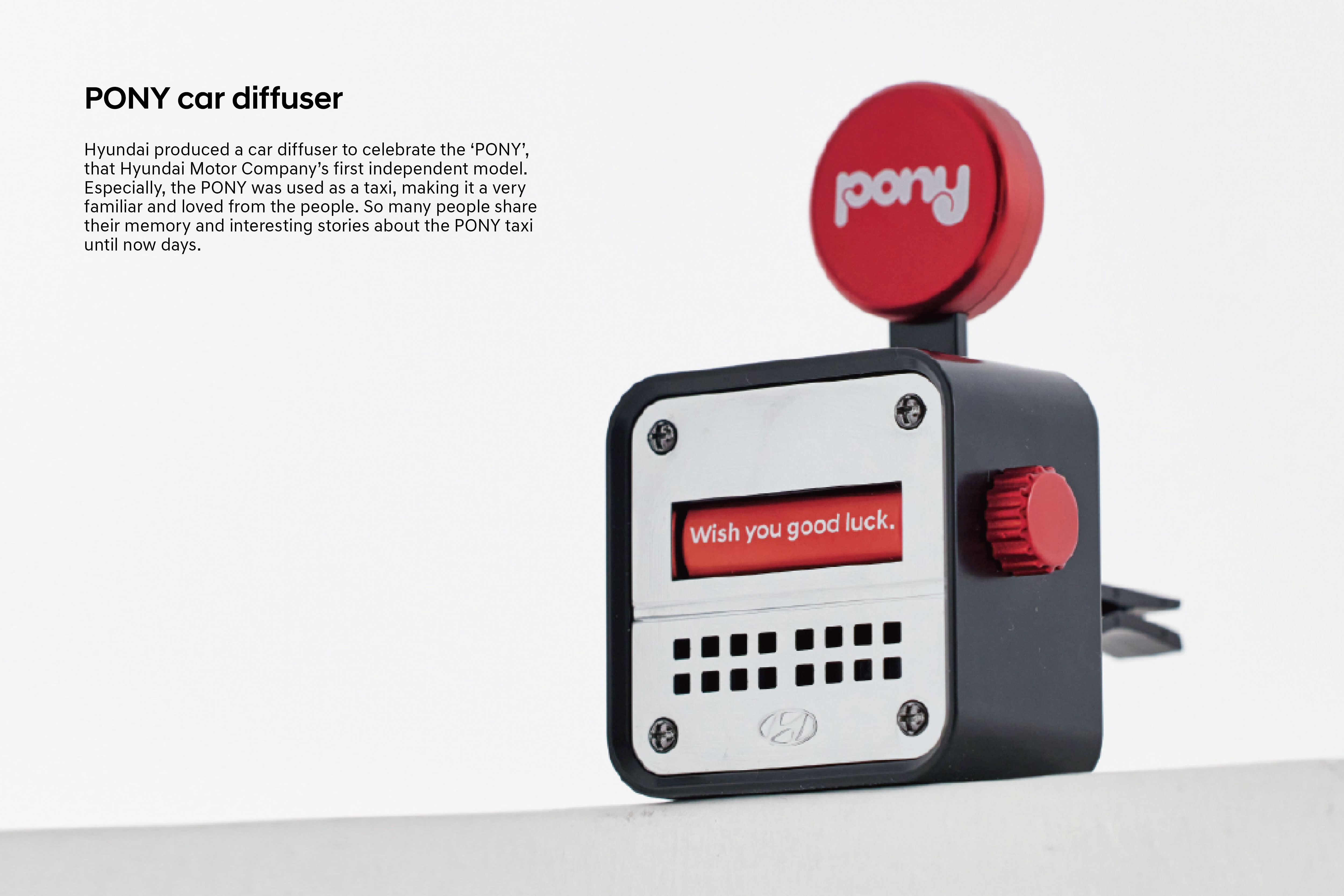 Hyundai produced a car diffuser to celebrate the ‘PONY’, that Hyundai Motor Company’s first independent model. Especially, the PONY was used as a taxi, making it a very familiar and loved from the people. So many people share their memory and interesting stories about the PONY taxi until now days.