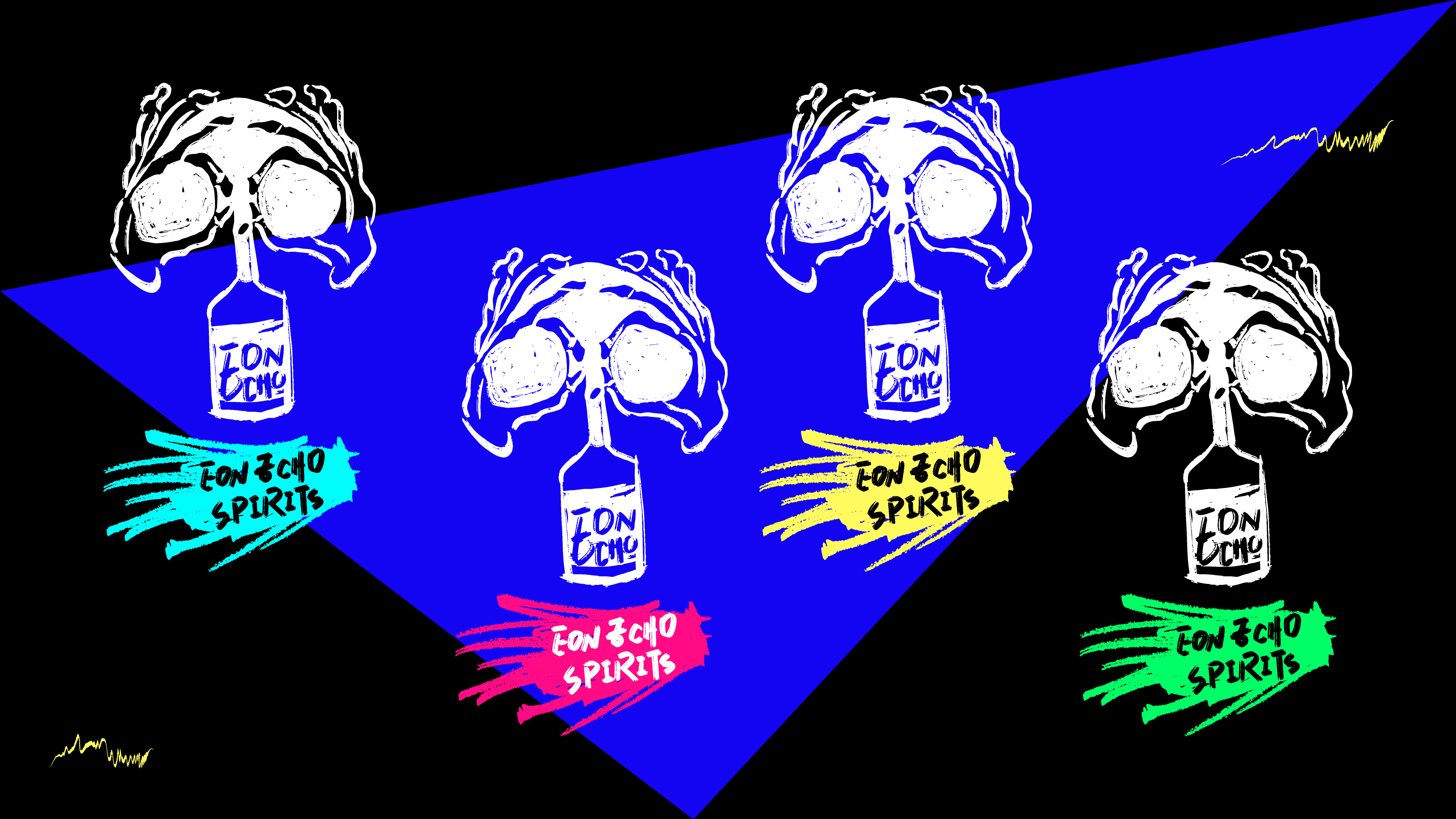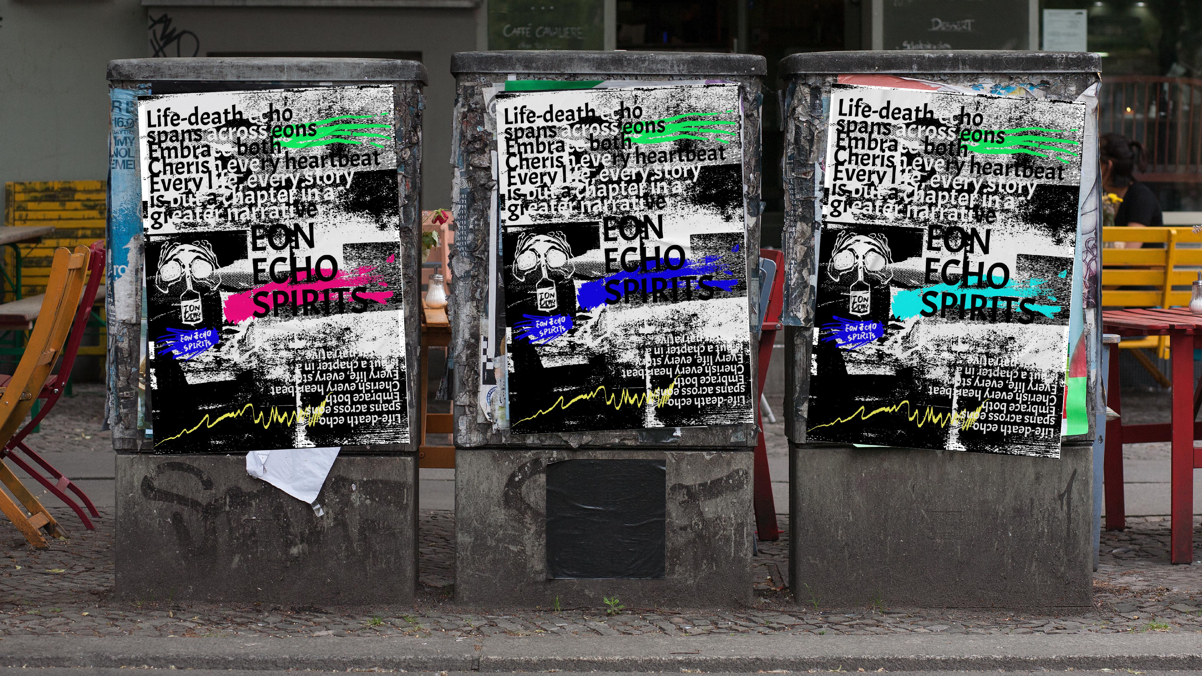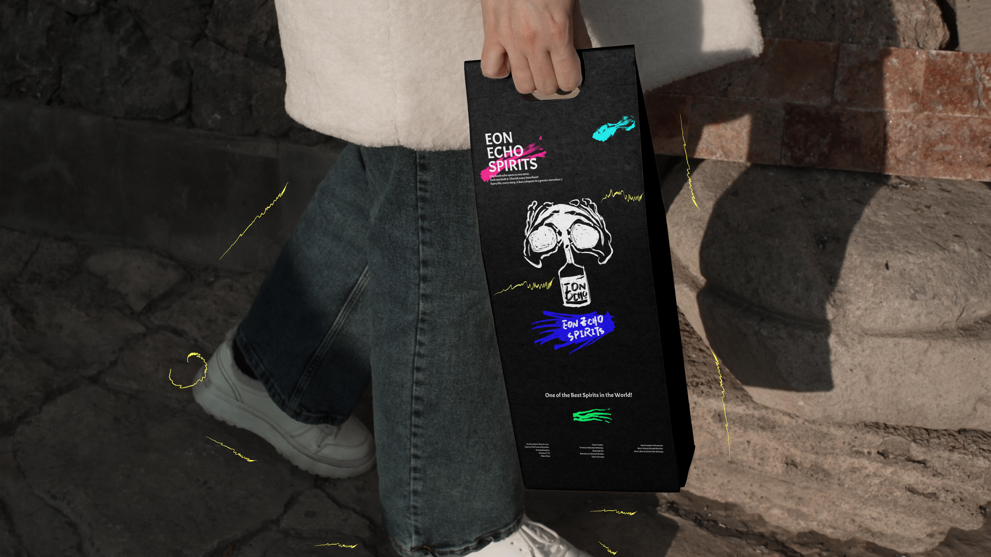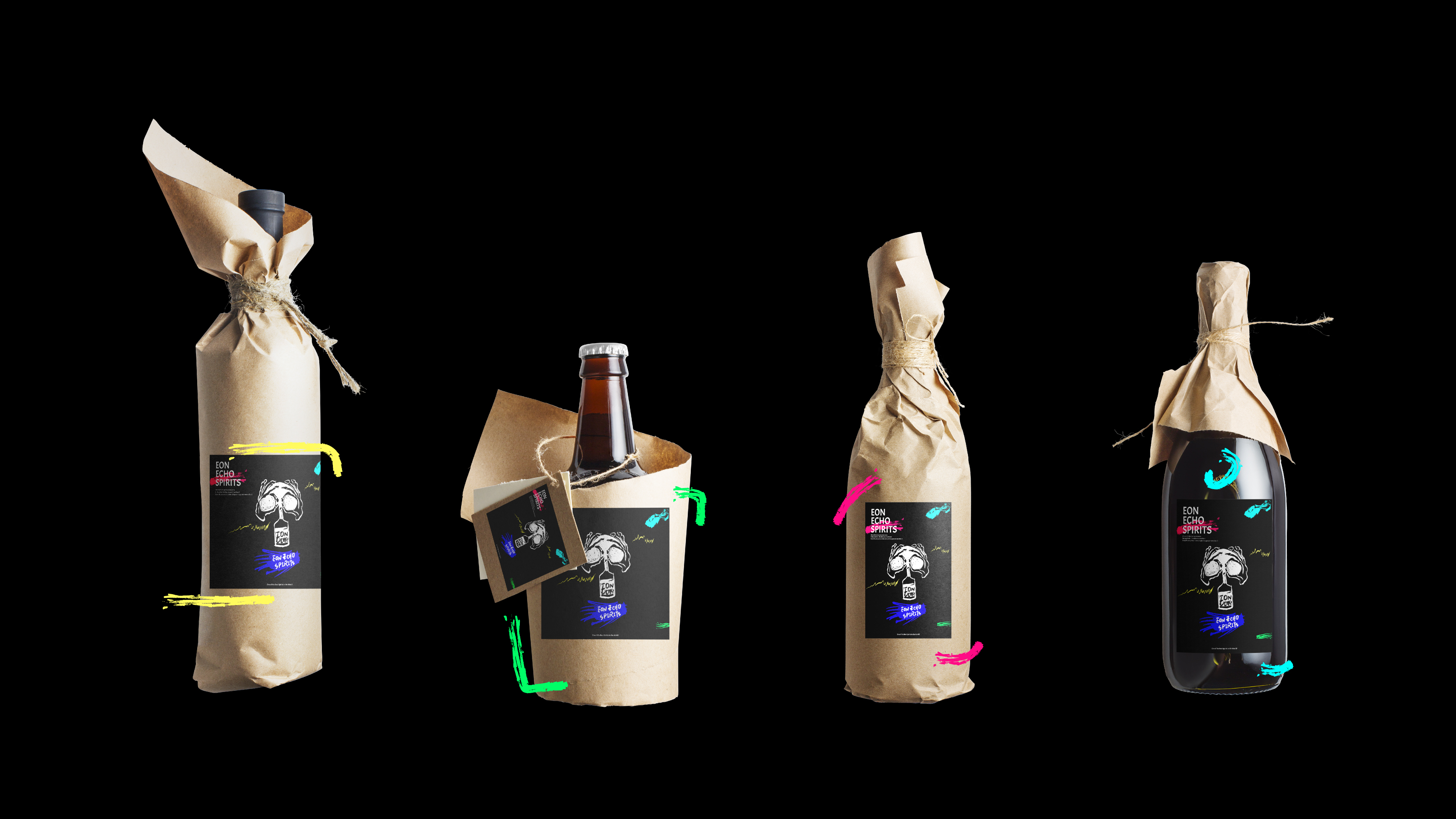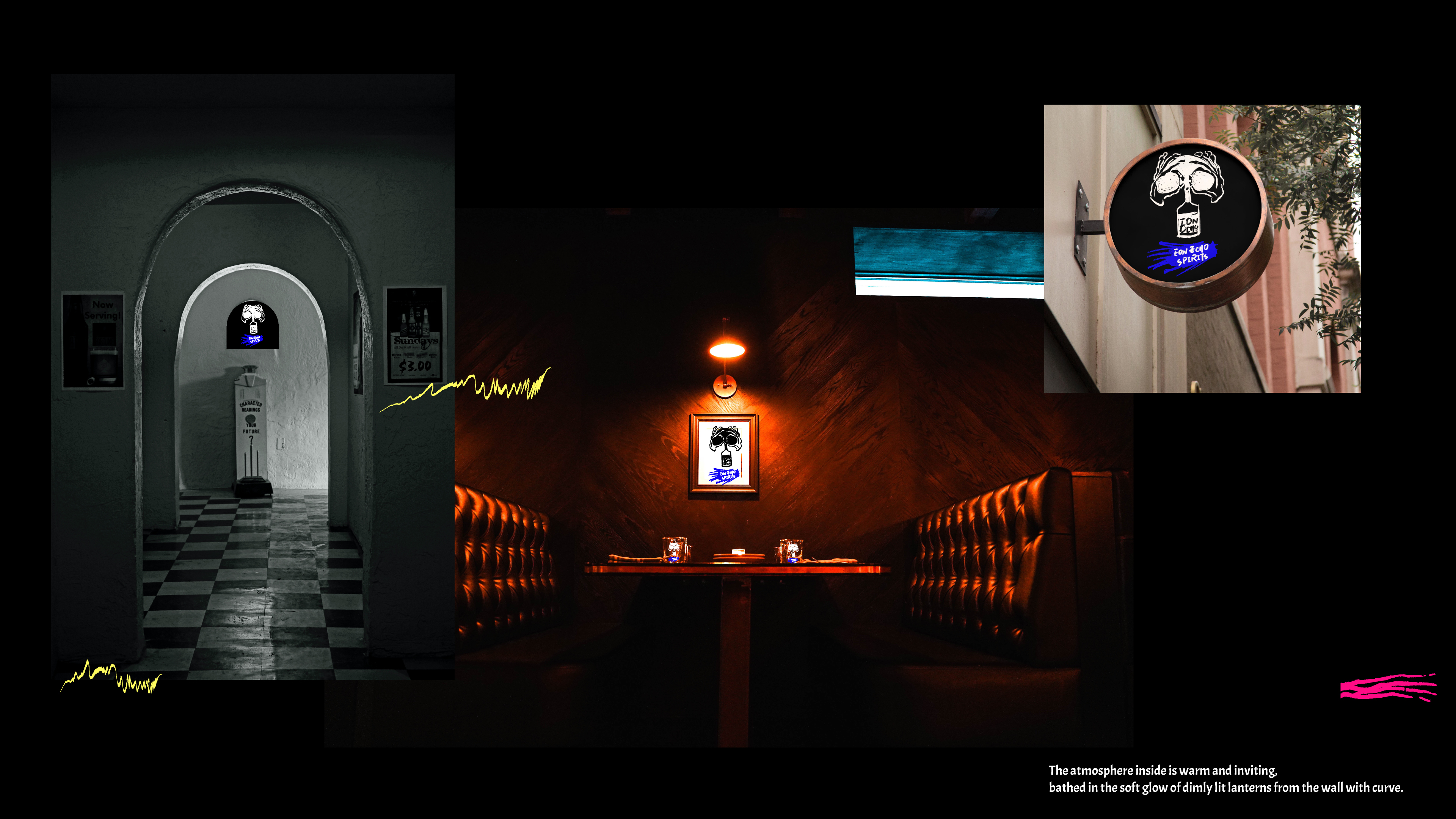 Eon Echo Spirits is an immersive bar where life and death blur into a mesmerizing experience. The symbol of the bar is a skeleton face with multiple vivid colors. These iridescent colors include gorgeous pink, shimmering azure, fluorescent green, and shimmering gold embody the vibrant hues of joy, growth, and boundless possibilities while the hilarious skeleton face illustrates death as a transition into the new beginning of the unknown. It’s also a reminder of lives once lived, now eternally preserved.