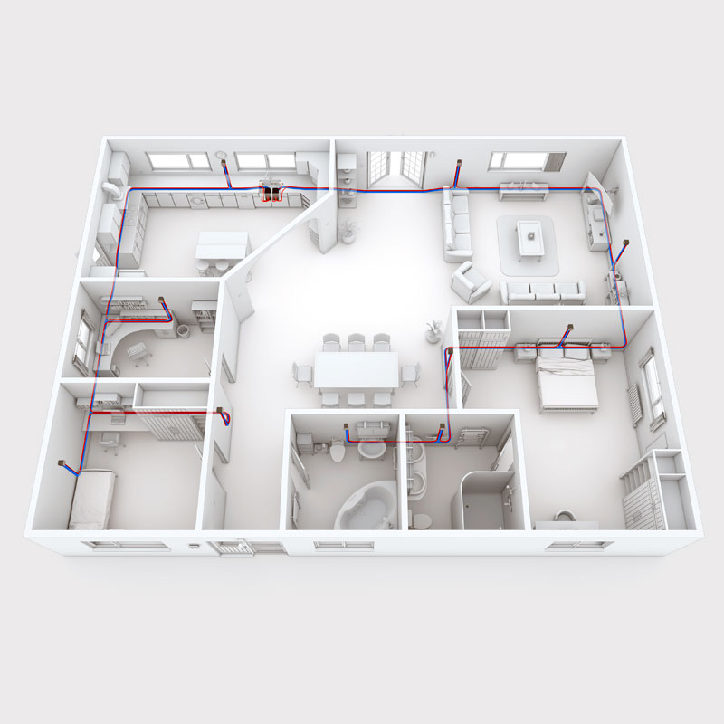 A smarter fire sprinkler fit for the smart home, Automist's runs directly off the domestic water main (max water demand 2.4 gallons per minute). Its pipes are only loaded with water when the system is activated. Low water usage reduces the cost of installation and the chance of leaks. When a traditional fire sprinkler activates, it can produce enough water to fill 3 bathtubs in 10 minutes. Automist uses only 5% of the water, filling only half of a bathtub in ten minutes.