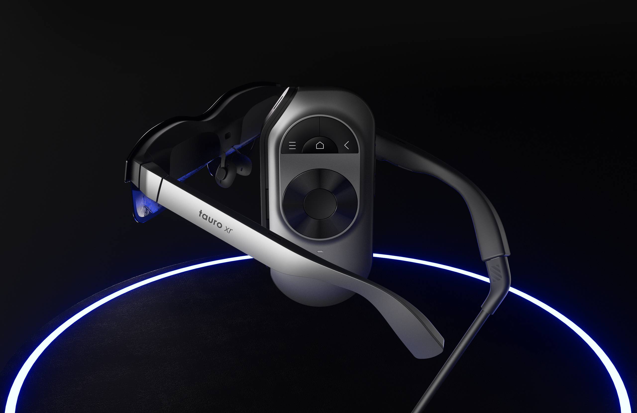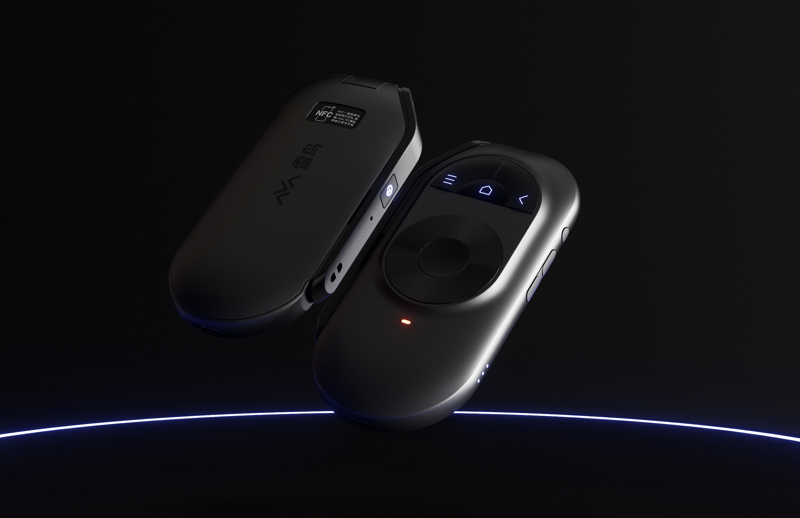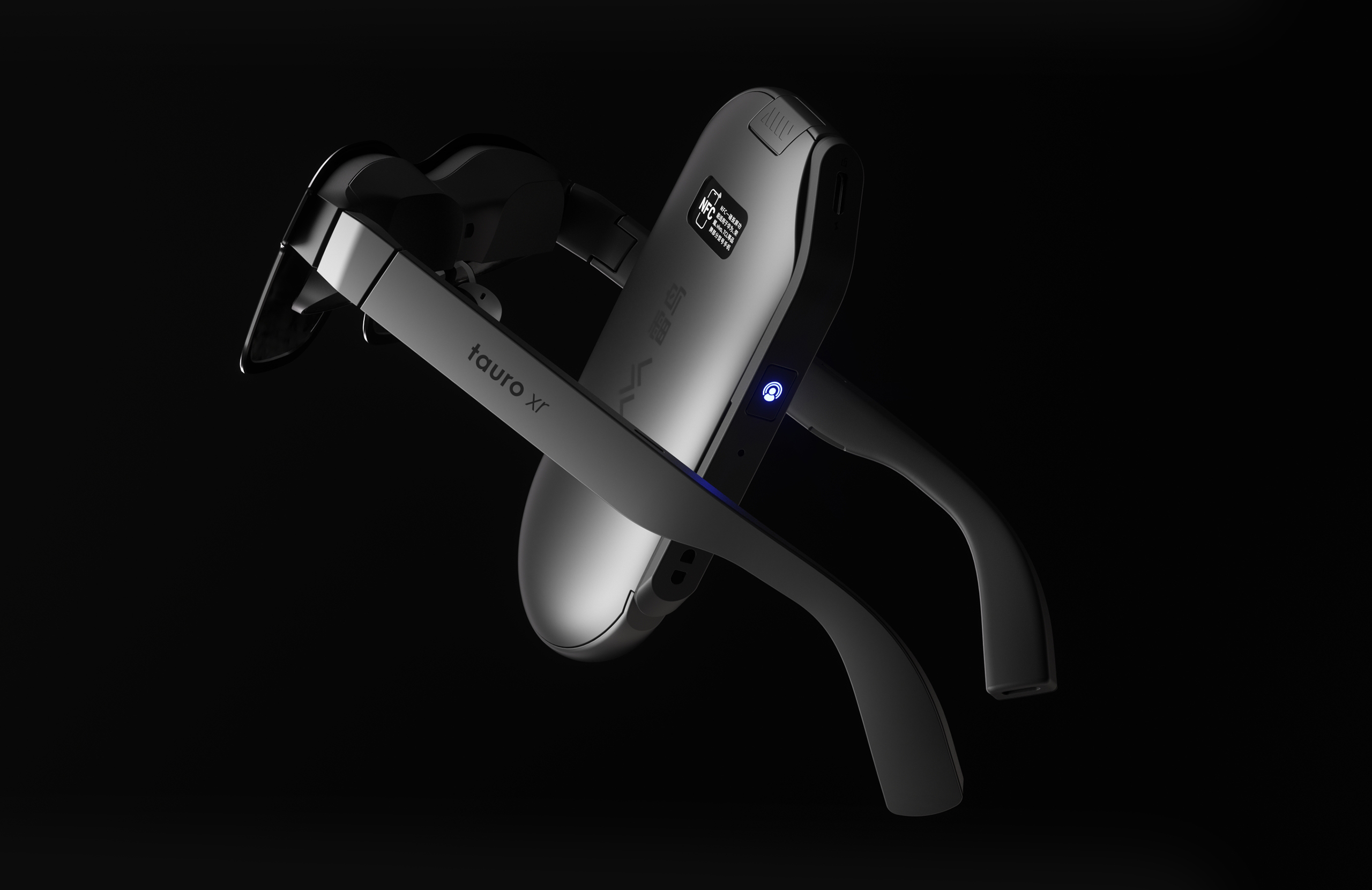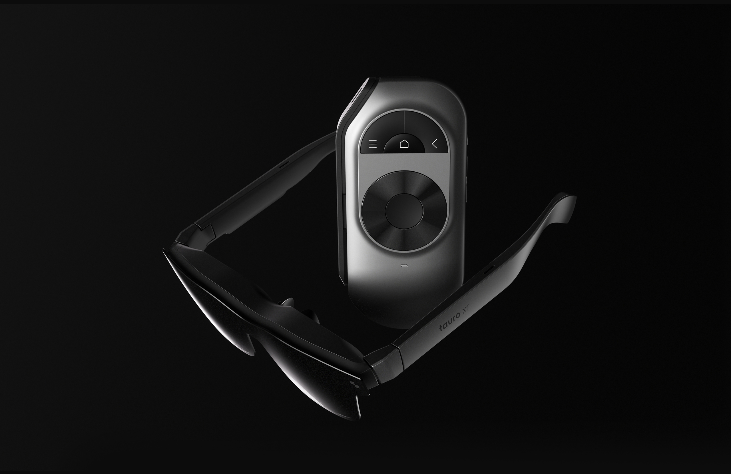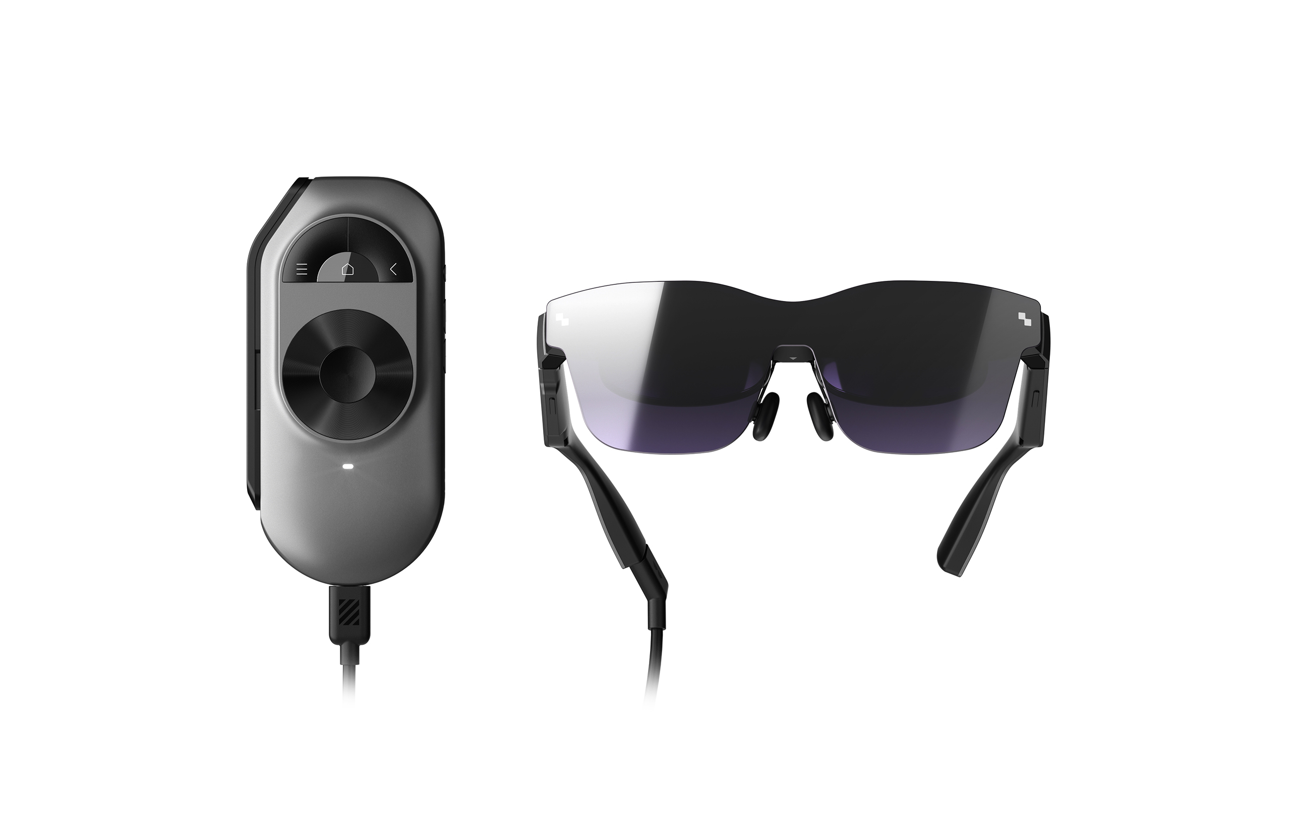 These are high-tech AR glasses with an overall design that embodies technology, fashion, and simplicity. The glasses feature a frameless, one-piece front lens design enhanced with coating technology, creating a sense of both fashion and lightness. Both the glasses and the magic box adopt a contrasting design in deep space gray and black, creating a cohesive family-style design. The smooth, natural curves adhere to ergonomic principles.