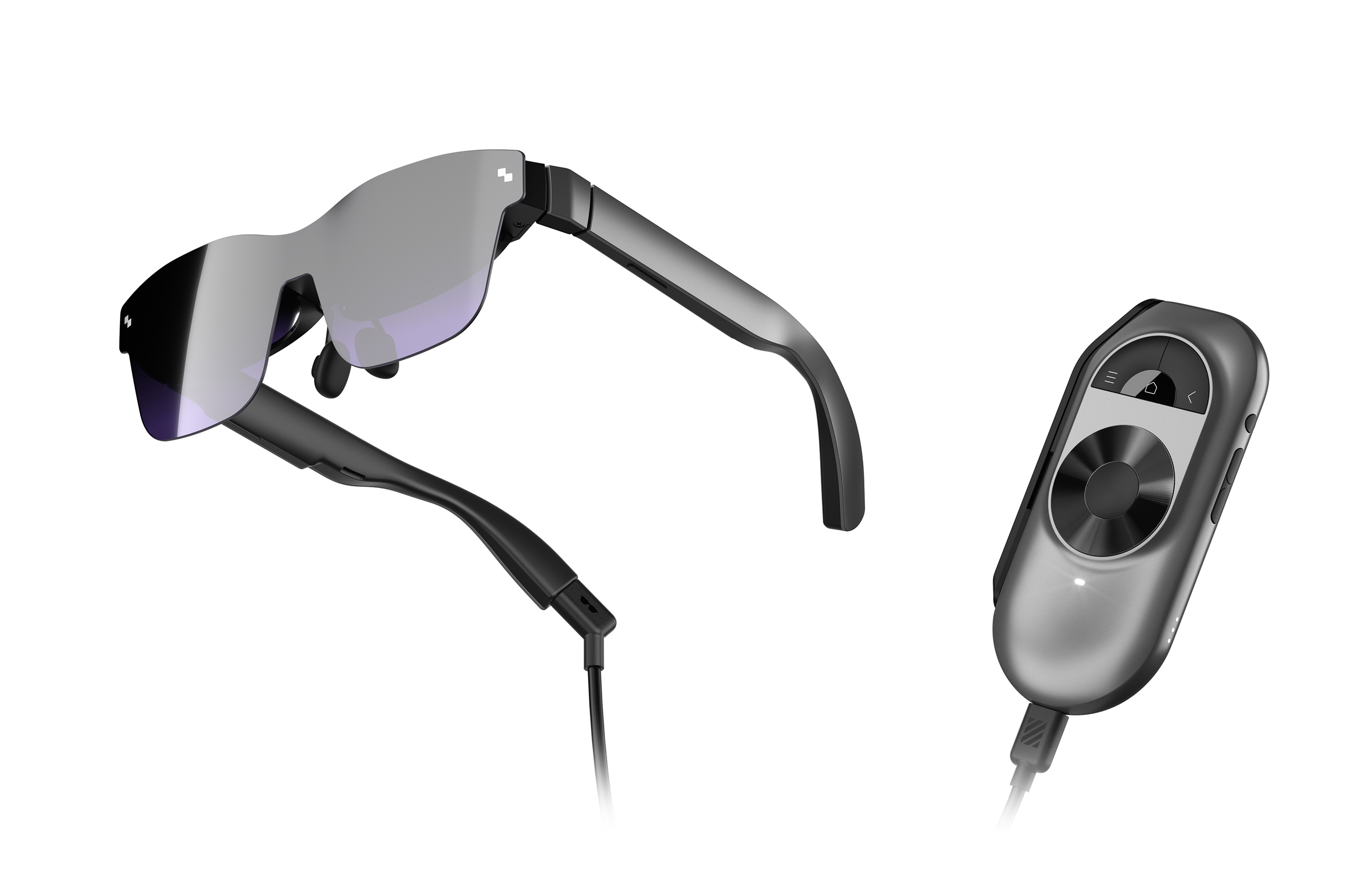 The RayNeo Magic Box comes with a rich selection of streaming content and forms an ecosystem when connected to the glasses via a data cable, offering functions such as audiovisual entertainment and office tasks. The glasses themselves can serve as a portable giant screen for displaying content and can be connected to DP devices or gaming consoles, functioning as a mirrored or extended screens. Moreover, the buttons on the glasses allow for various modes of operation, including volume and brightness adjustment, whisper mode, and 2D/3D switching mode, enhancing the viewing and gaming experiences for users.