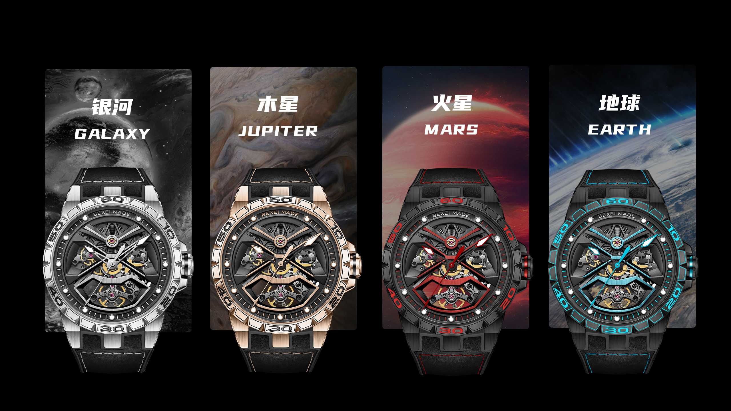 This co-branding watch series by BEXEI and The Wandering Earth IP is an automatic mechanical watch for men. This movie has impressed the audience for its depiction of the mankind’s bravery and resilience in spite of inevitable disasters. Backed by the imaginative state-of-the-art technologies presented in the movie, human beings managed to break the fetter and probe to the depth of the universe, while holding onto the spark and hope in heart. BEXEI designs this watch with these essential elements in order to permanently imprint the dauntless attitude to adversity in the wrist. This watch is expected to impress the wearer a sort of special mechanical appeal, and to keep the wearer motivated from time to time. It also stands for the wearer’s courage and spirit in a way that is concretely perceived by others. As inspired by the planetary engine, a key element appearing in the movie, the appearance is designed in consideration of the exact forms of stars, which coincides with the final scene in the movie's ending – the Earth wandering across stars. Notably the portion from the dial to the tourbillon is largely hollowed out in order to bring out the mechanics and precision of internal components to the extent possible, and confer a special hollowing appeal to the watch.