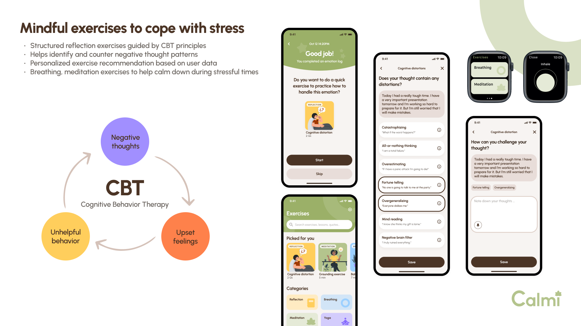 By focusing on these robust features, Calmi offers a comprehensive, science-backed solution to manage stress and emotional health effectively. Its user-friendly interface ensures accessibility, making mental wellness achievable for everyone.
