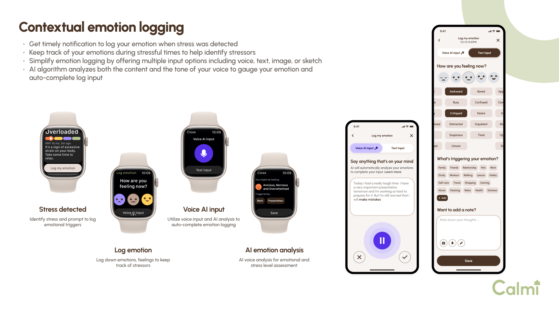 - Smart Tracking: For many, manually logging emotional states can be cumbersome. Calmi takes a two-pronged approach to tackle this issue. Firstly, it employs intelligent algorithms to estimate stress level by tracking physical metrics like Heart Rate Variability (HRV) and resting heart rate continuously. Secondly, the app offers voice input features, where an AI algorithm analyzes both the content and the tone of your voice to gauge your emotional and stress levels. These methods work in tandem to send you timely, context-sensitive prompts to log your emotional state, simplifying the tracking process and enhancing its accuracy.