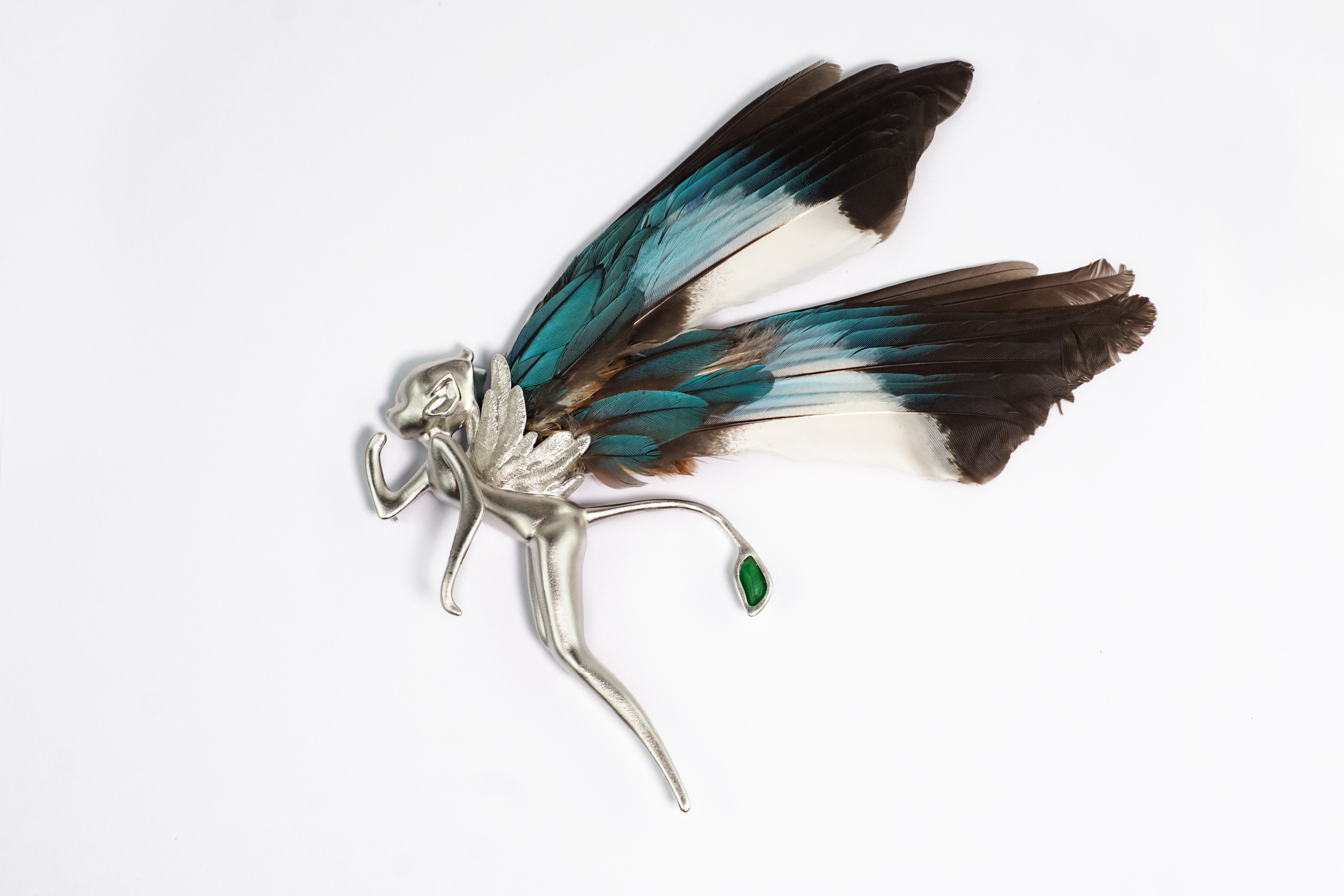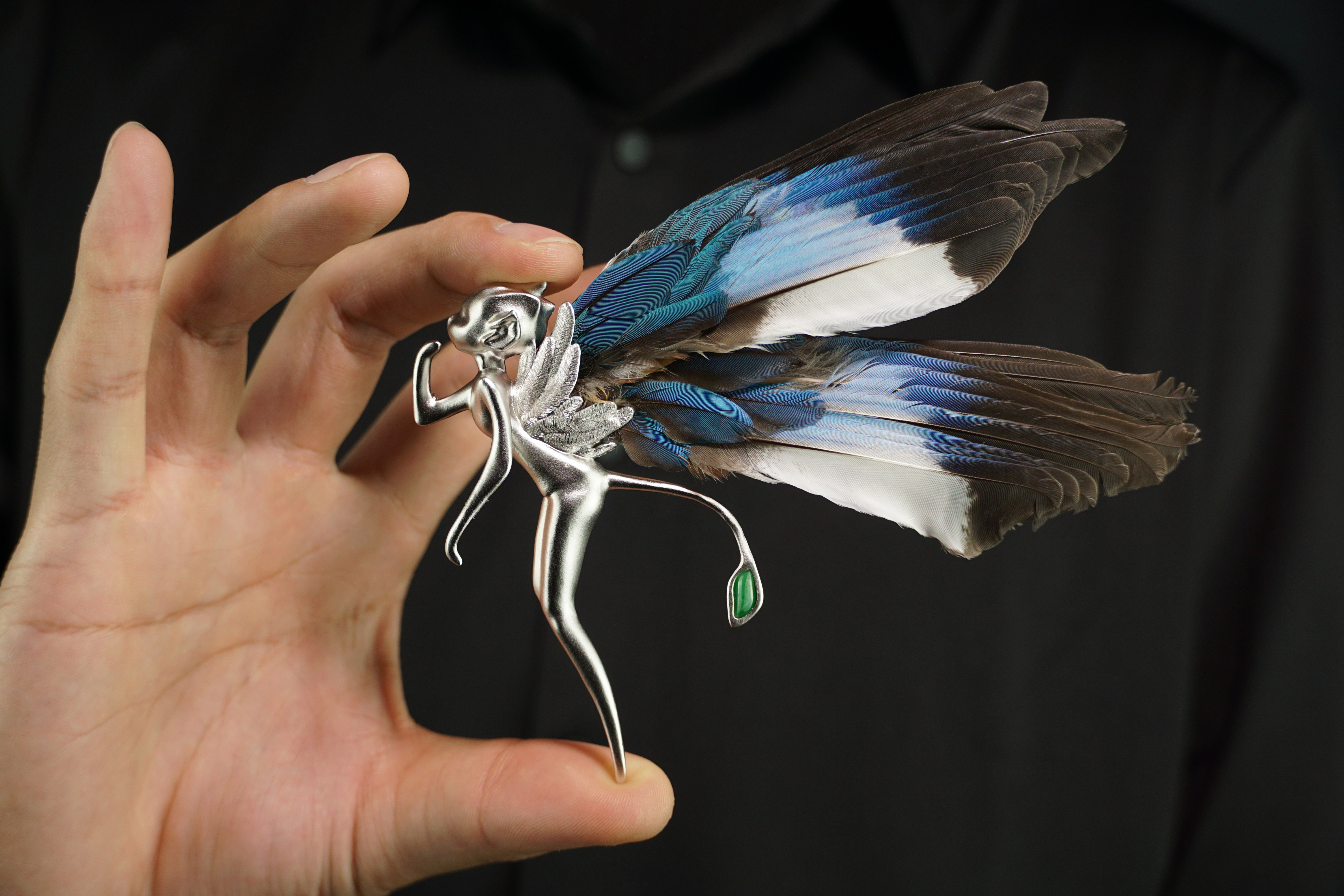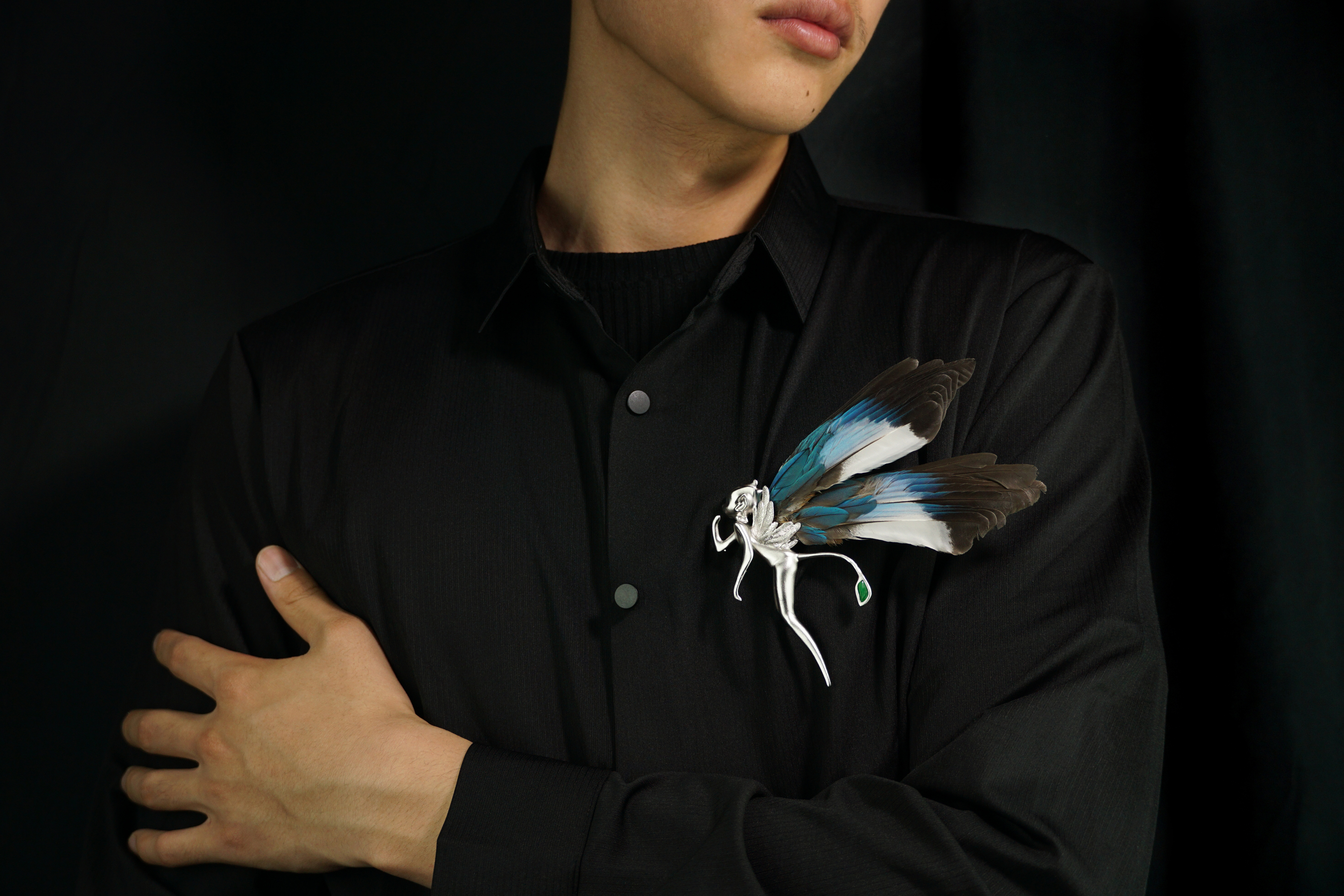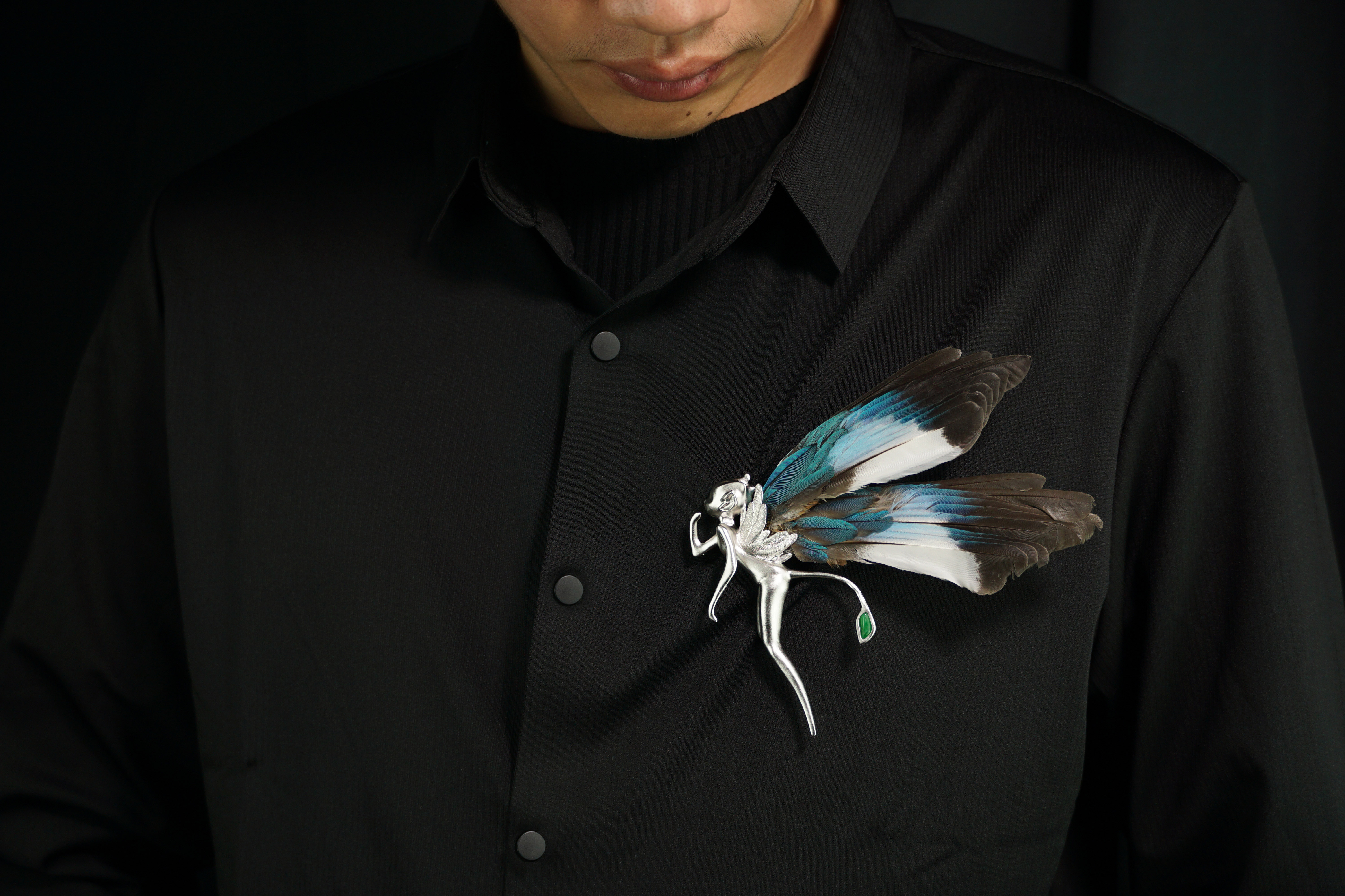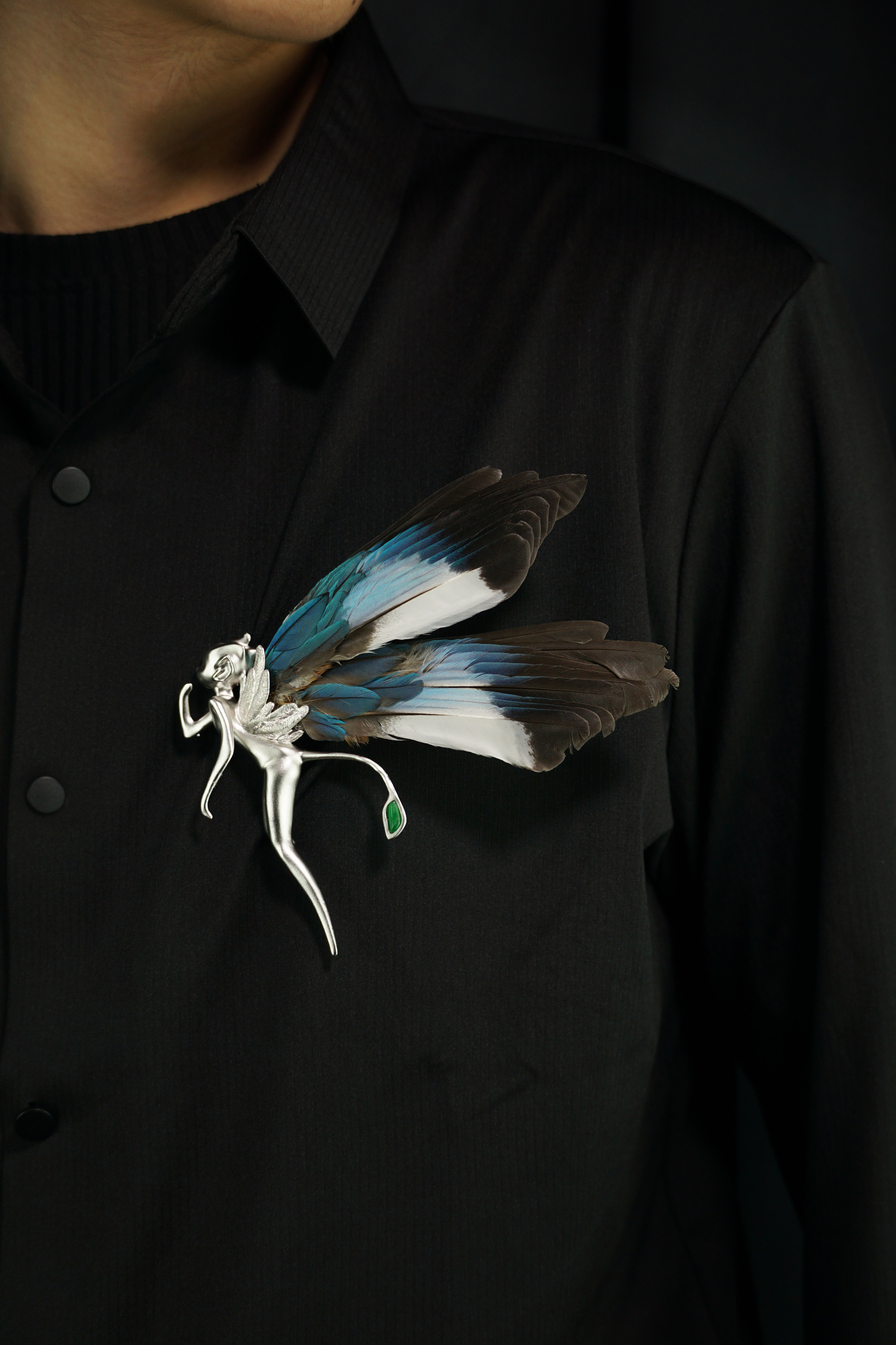 This brooch is an ingenious use of the traditional Chinese chipping technique, which breaks with the traditional feathering theme of metal chipping. The fairy wings are represented by real feathers, the body part is made of 925 silver and sandblasted, and the tail is decorated with a delicate jade. The shape of the work has been carefully designed after many attempts, so that its center of gravity reaches a reasonable position, no matter what Angle the brooch is worn at, it will not cause flipping. The work uses the traditional Western concept of angel combined with Oriental charm of jade and green dots. Distinguish between the priority and the primary, and use a multi-material method to express the theme. The inspiration for this work comes from an experience in which the author's pursuit of freedom at a young age brought him to a low point. According to the formula G=mg, the force of gravity on an object is positively related to its mass. Majestic wings allow the spirit to fly freely at the same time, its heavy mass and huge volume also give the spirit a huge burden. This pair of profound contradictions reflects human's freedom of mind, yearning for ideals and feedback to you because of freedom and yearning pressure, the combination of Chinese and Western techniques also interpret the pain of all mankind for this contradiction is linked, no one can be immune from its troubles. This warns people that when pursuing the beauty in their hearts, they should also see the pain and cost behind it. All parts of this work can be disassembled and recycled, and will not be a burden on the earth's environment, and strictly follow the purpose of environmental protection.