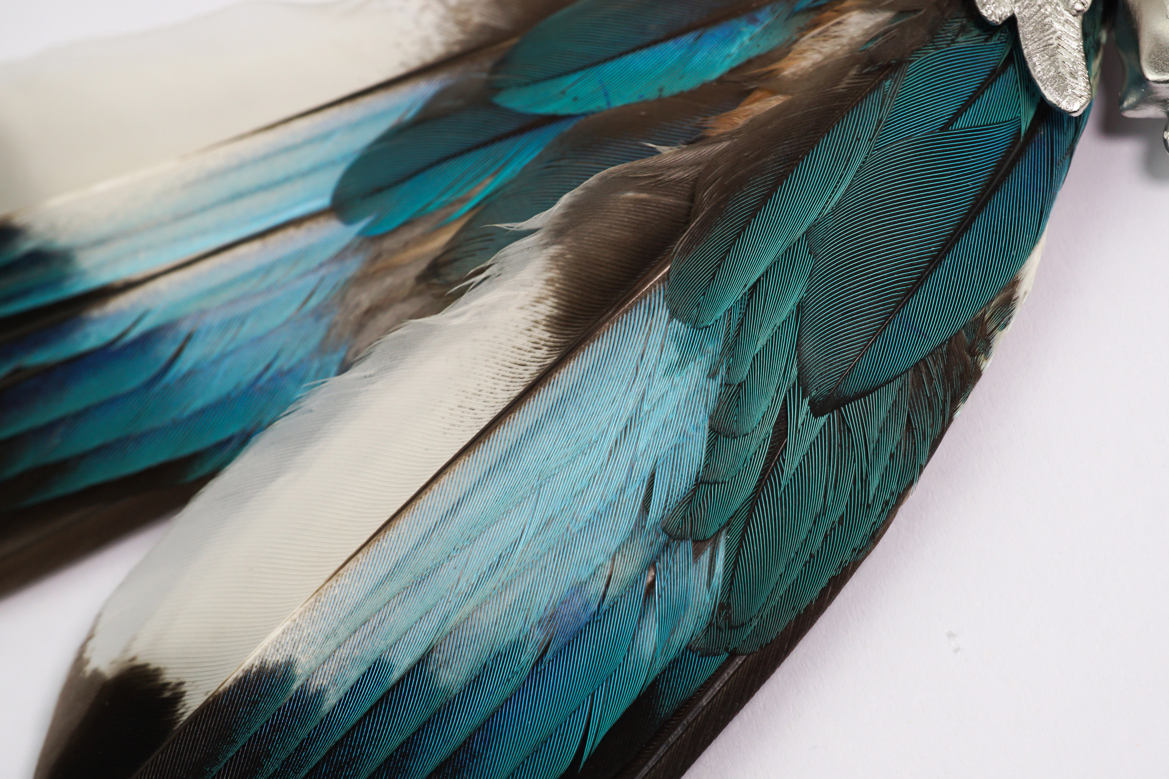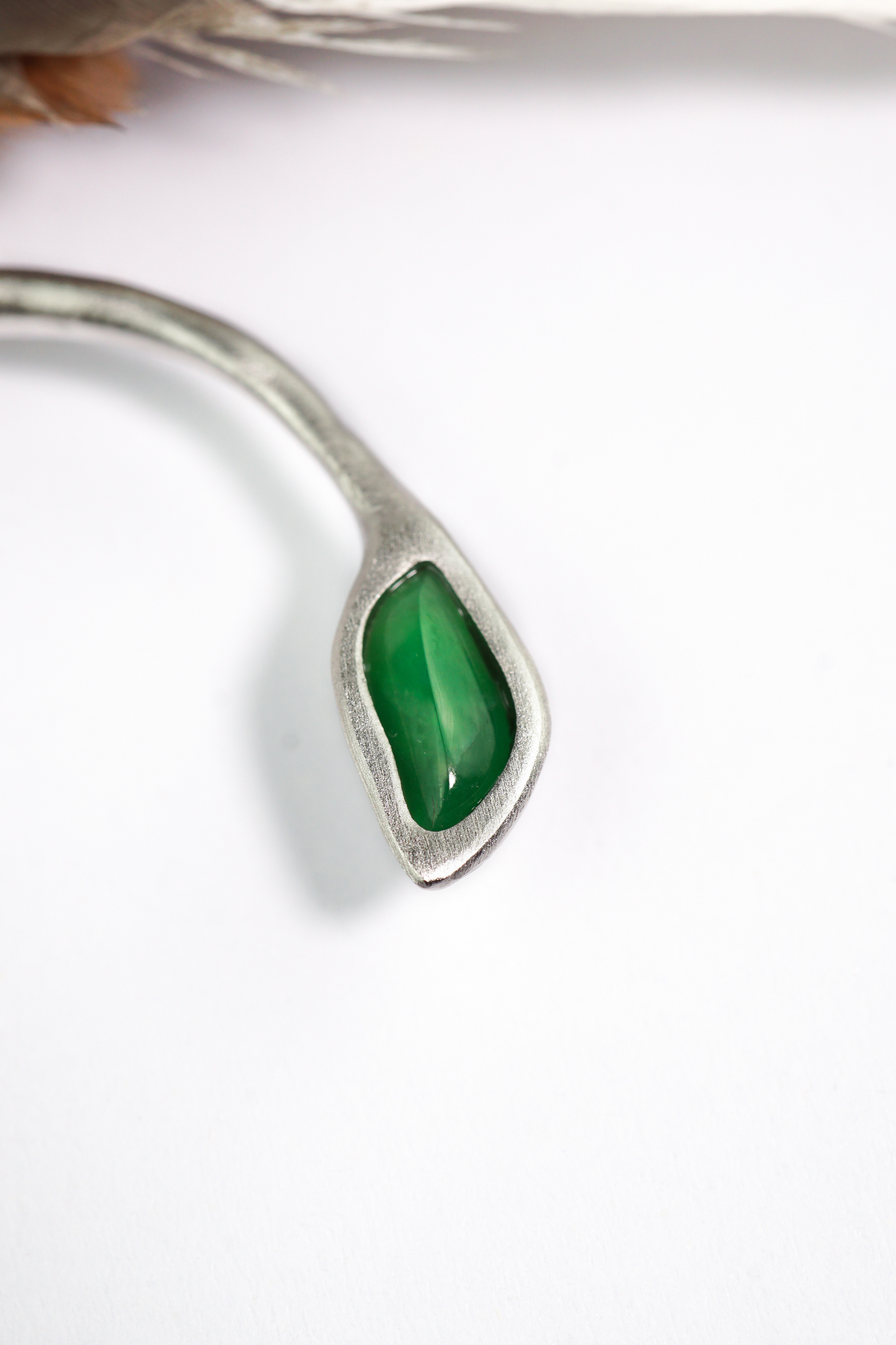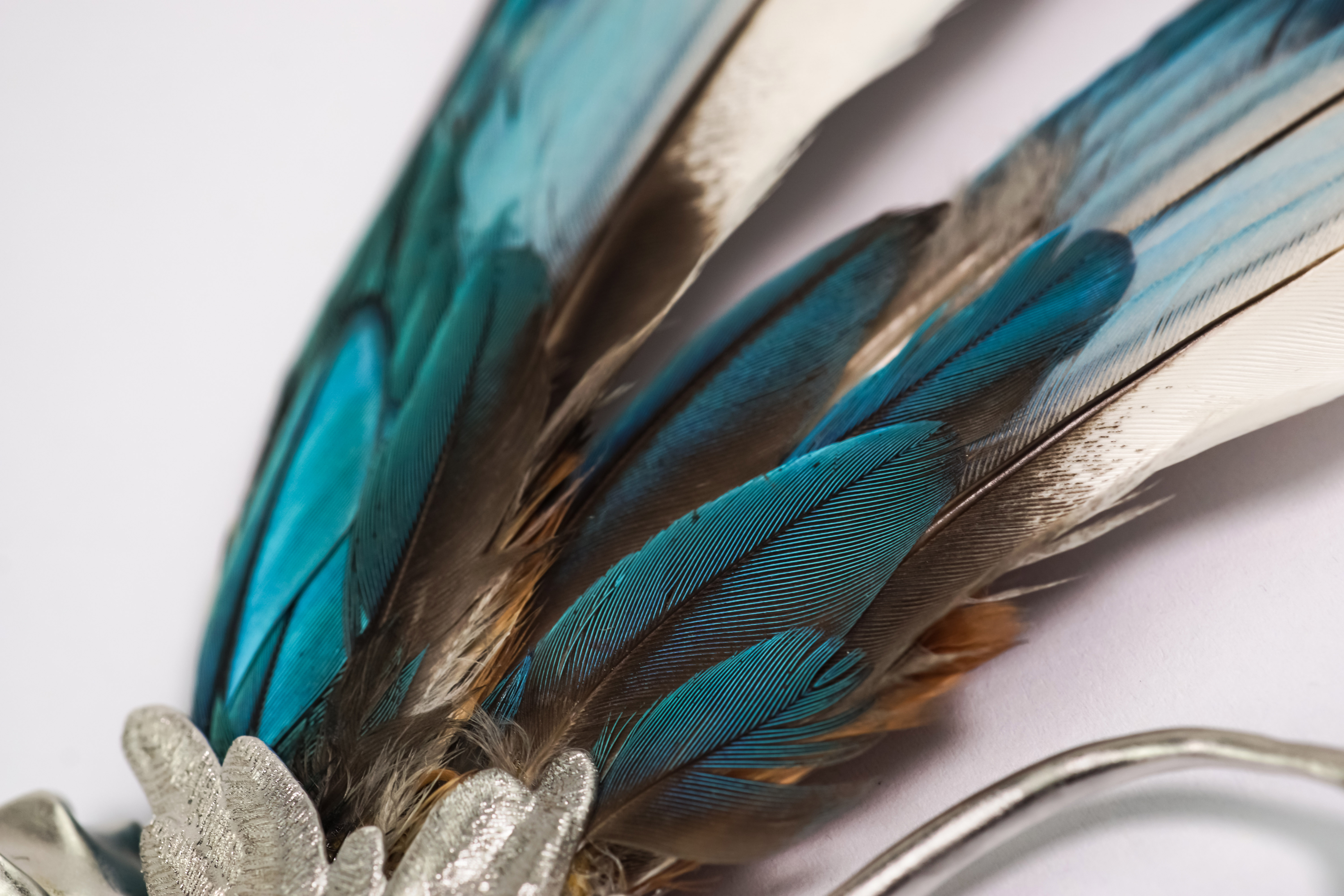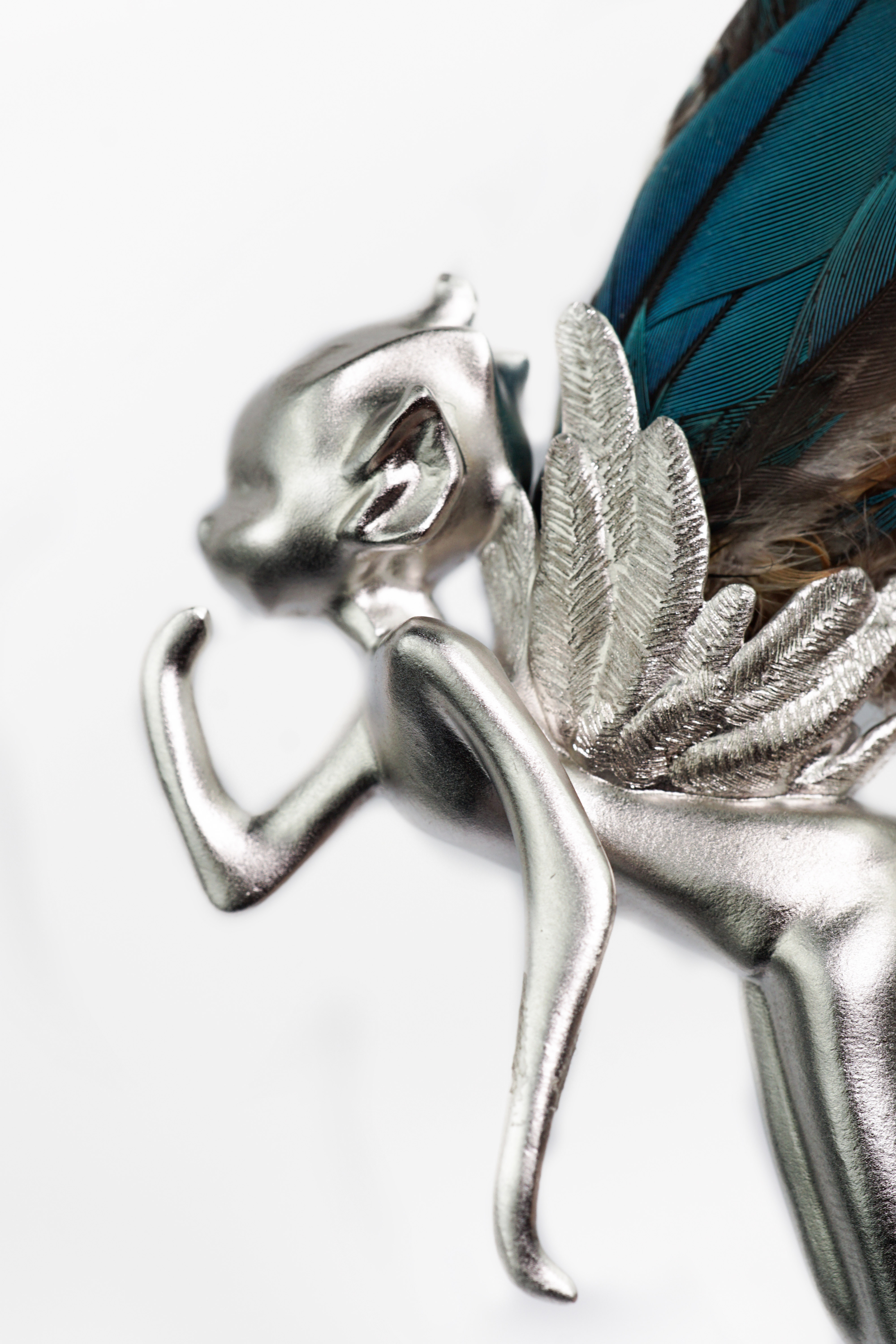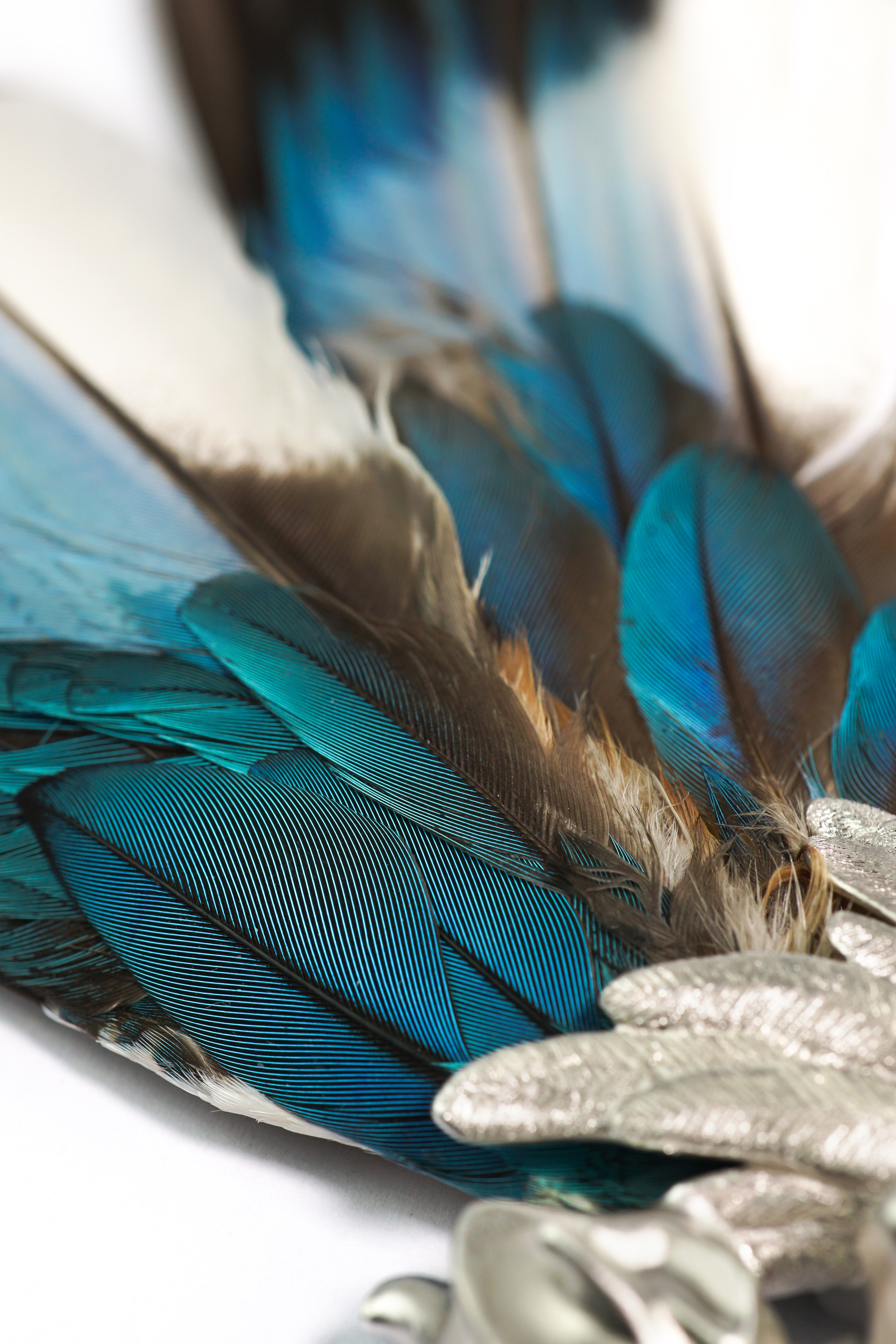 This brooch is an ingenious use of the traditional Chinese chipping technique, which breaks with the traditional feathering theme of metal chipping. The fairy wings are represented by real feathers, the body part is made of 925 silver and sandblasted, and the tail is decorated with a delicate jade. The shape of the work has been carefully designed after many attempts, so that its center of gravity reaches a reasonable position, no matter what Angle the brooch is worn at, it will not cause flipping. The work uses the traditional Western concept of angel combined with Oriental charm of jade and green dots. Distinguish between the priority and the primary, and use a multi-material method to express the theme. The inspiration for this work comes from an experience in which the author's pursuit of freedom at a young age brought him to a low point. According to the formula G=mg, the force of gravity on an object is positively related to its mass. Majestic wings allow the spirit to fly freely at the same time, its heavy mass and huge volume also give the spirit a huge burden. This pair of profound contradictions reflects human's freedom of mind, yearning for ideals and feedback to you because of freedom and yearning pressure, the combination of Chinese and Western techniques also interpret the pain of all mankind for this contradiction is linked, no one can be immune from its troubles. This warns people that when pursuing the beauty in their hearts, they should also see the pain and cost behind it. All parts of this work can be disassembled and recycled, and will not be a burden on the earth's environment, and strictly follow the purpose of environmental protection.